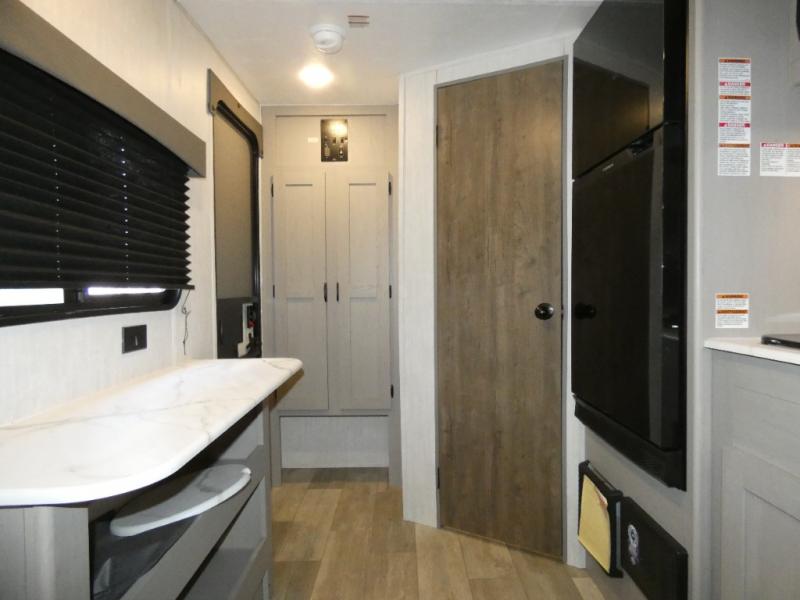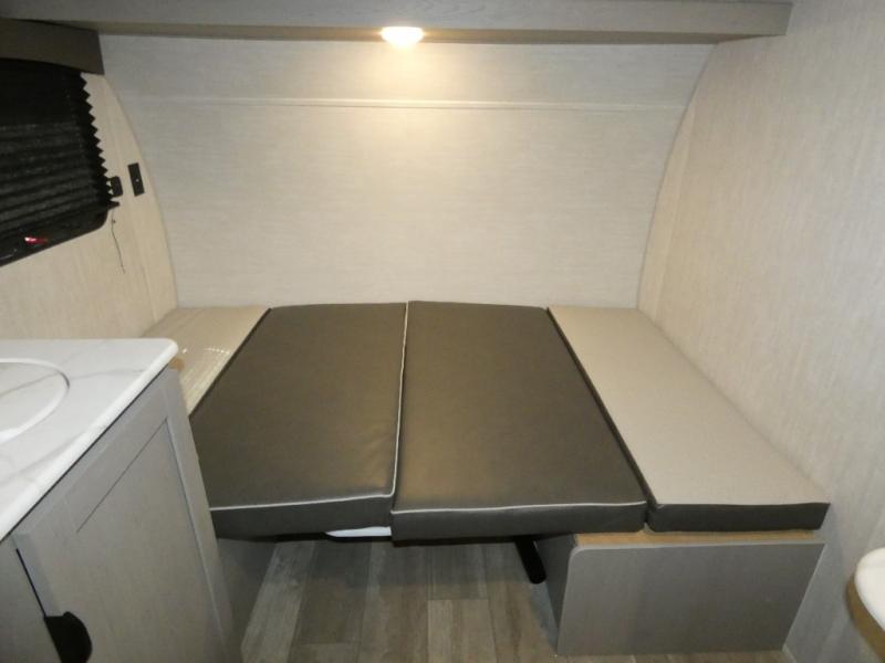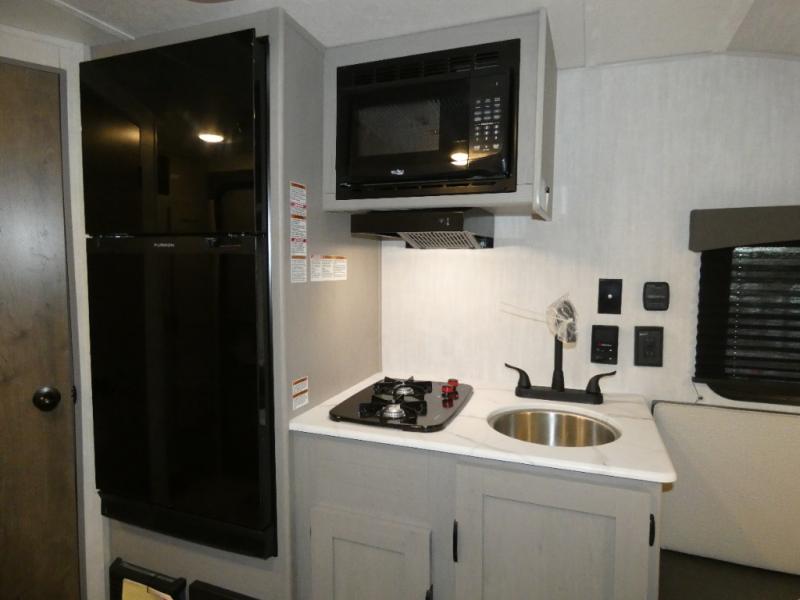 Tired of tent camping and sleeping on the ground? This lightweight travel trailer can accommodate you nicely with a dry and comfortable place to stay while enjoying nature. Inside, you will find a booth dinette for plenty of space to sit and stretch your legs, or enjoy a meal. The booth dinette easily converts to sleeping space at night. You might also enjoy your morning breakfast or coffee at the bar top with two stools. A 24" x 36" shower and toilet provide a convenience to your camping trips, no late nights running to the campground bathroom in the dark. And, the kitchen features a two burner cooktop and refrigerator so you can cook inside when you'd rather not deal with campfire smoke over an open fire. There is also plenty of storage for your things between the overhead cabinets and shelves, wardrobe/pantry near the door, and within exterior storage as well.