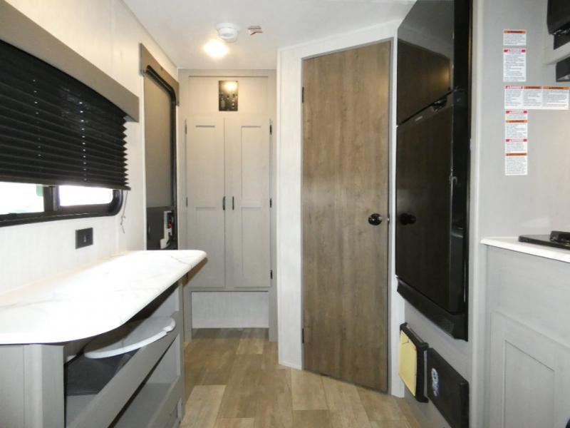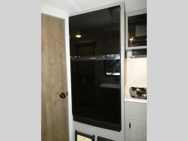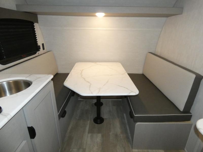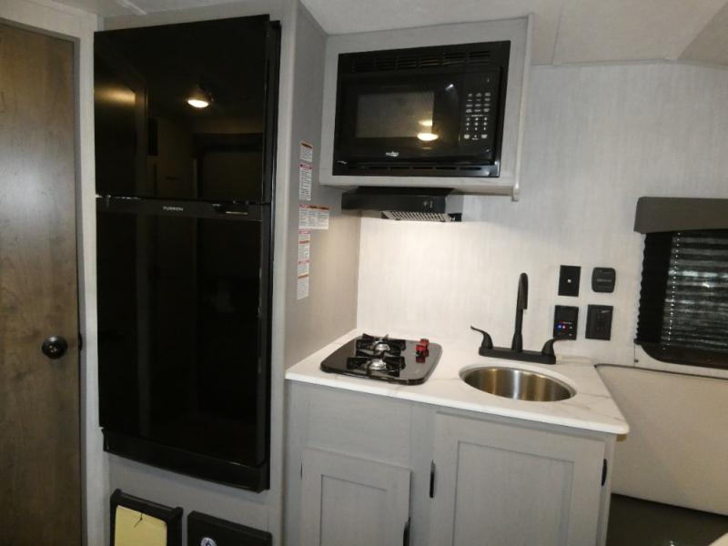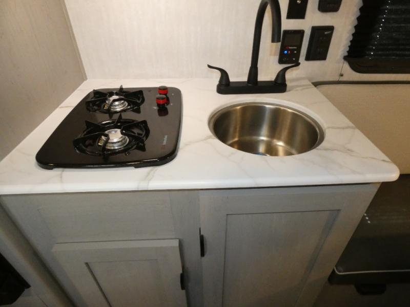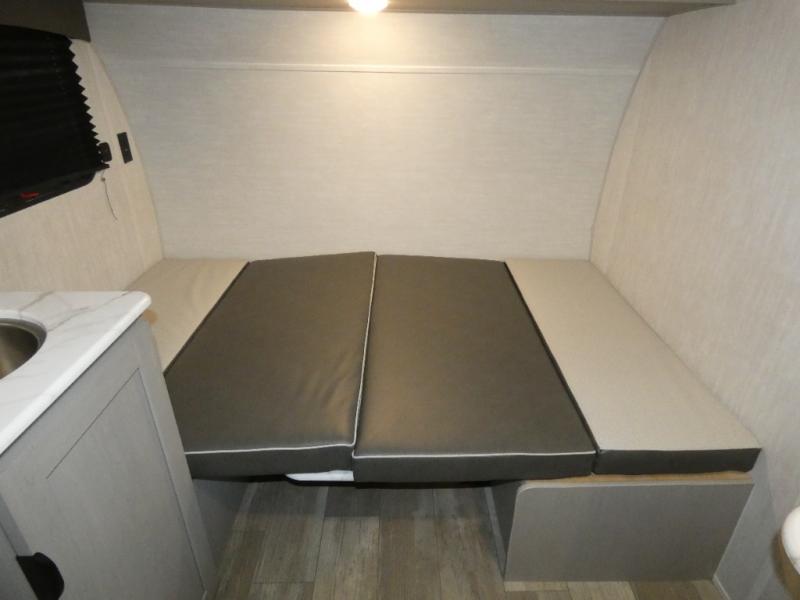 Tired of tent camping and sleeping on the ground? This lightweight travel trailer can accommodate you nicely with a dry and comfortable place to stay while enjoying nature. Inside, you will find a booth dinette for plenty of space to sit and stretch your legs, or enjoy a meal. The booth dinette easily converts to sleeping space at night. You might also enjoy your morning breakfast or coffee at the bar top with two stools. A 24" x 36" shower and toilet provide a convenience to your camping trips, no late nights running to the campground bathroom in the dark. And, the kitchen features a two burner cooktop and refrigerator so you can cook inside when you'd rather not deal with campfire smoke over an open fire. There is also plenty of storage for your things between the overhead cabinets and shelves, wardrobe/pantry near the door, and within exterior storage as well.