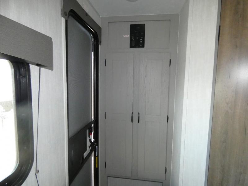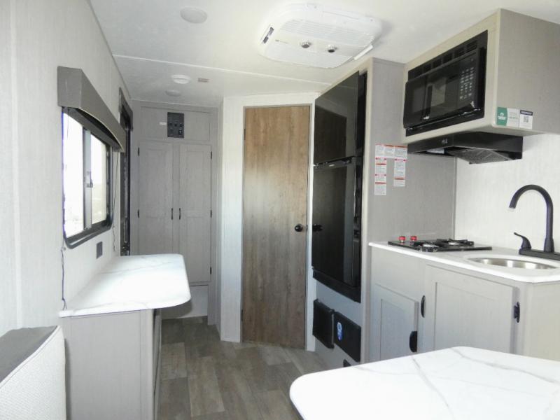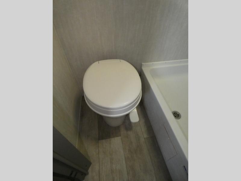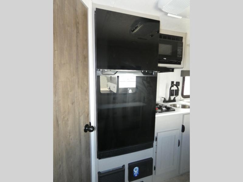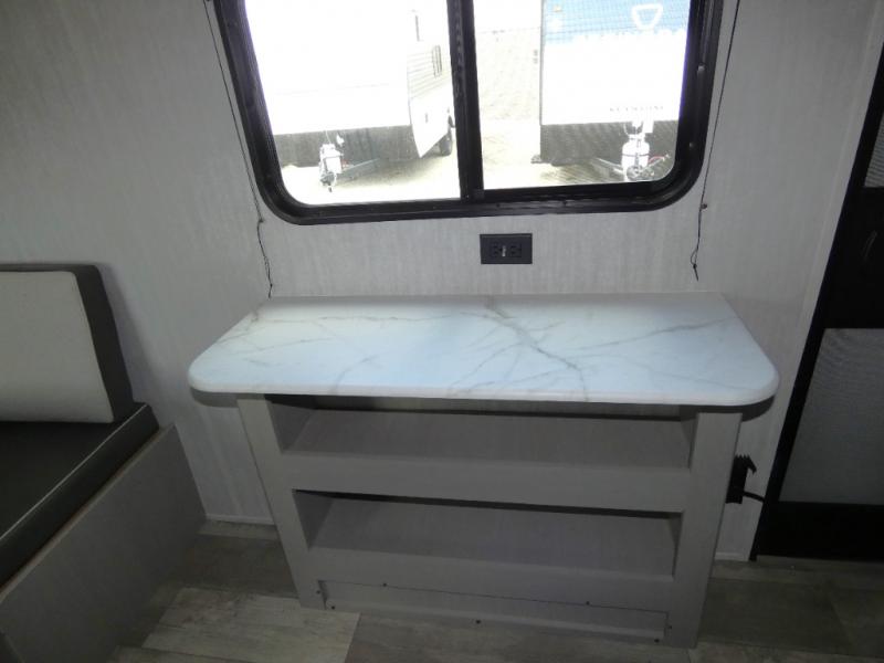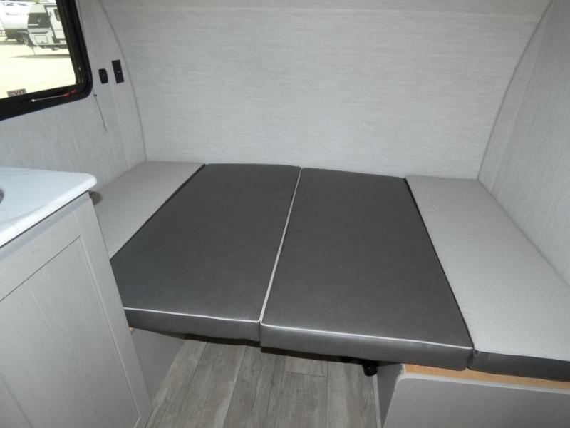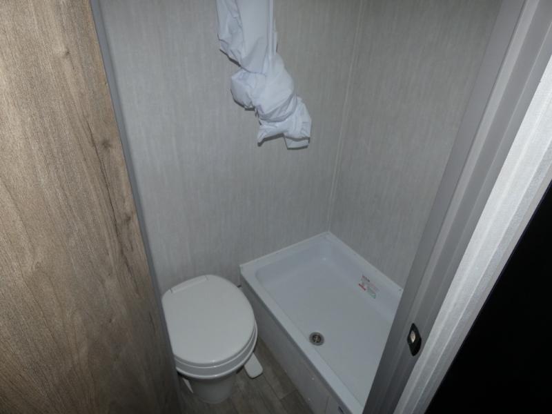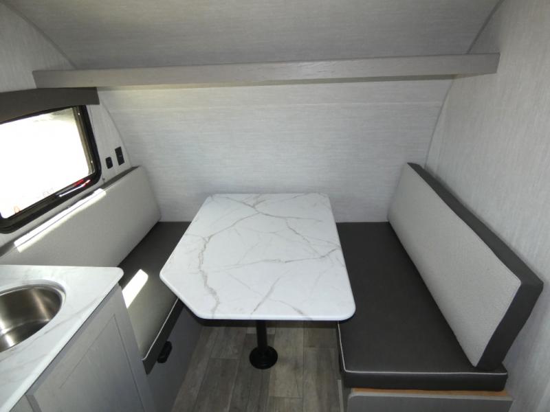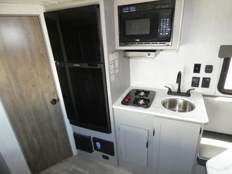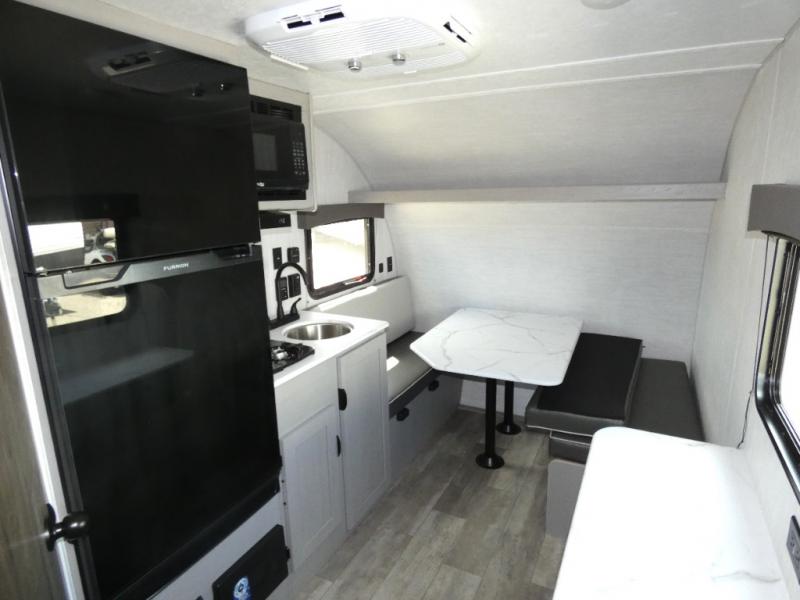 Tired of tent camping and sleeping on the ground? This lightweight travel trailer can accommodate you nicely with a dry and comfortable place to stay while enjoying nature. Inside, you will find a booth dinette for plenty of space to sit and stretch your legs, or enjoy a meal. The booth dinette easily converts to sleeping space at night. You might also enjoy your morning breakfast or coffee at the bar top with two stools. A 24" x 36" shower and toilet provide a convenience to your camping trips, no late nights running to the campground bathroom in the dark. And, the kitchen features a two burner cooktop and refrigerator so you can cook inside when you'd rather not deal with campfire smoke over an open fire. There is also plenty of storage for your things between the overhead cabinets and shelves, wardrobe/pantry near the door, and within exterior storage as well.