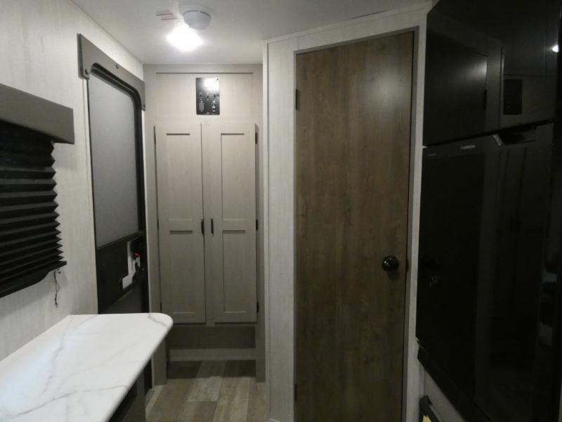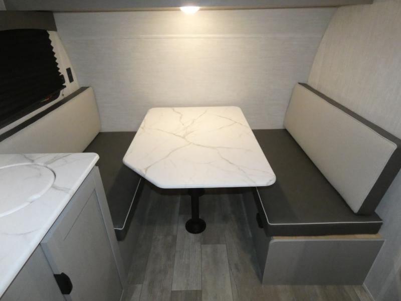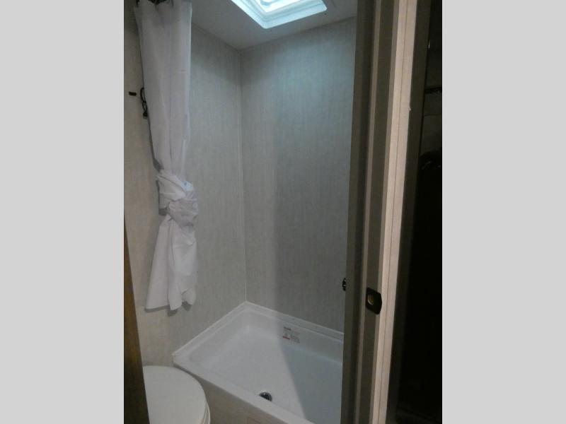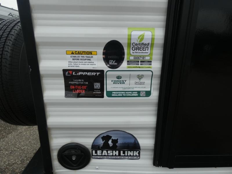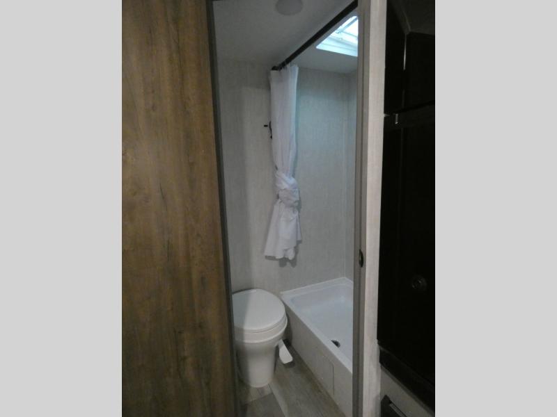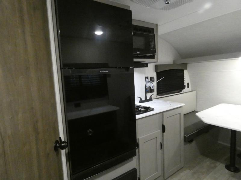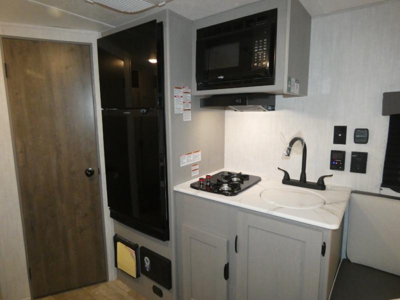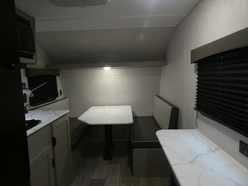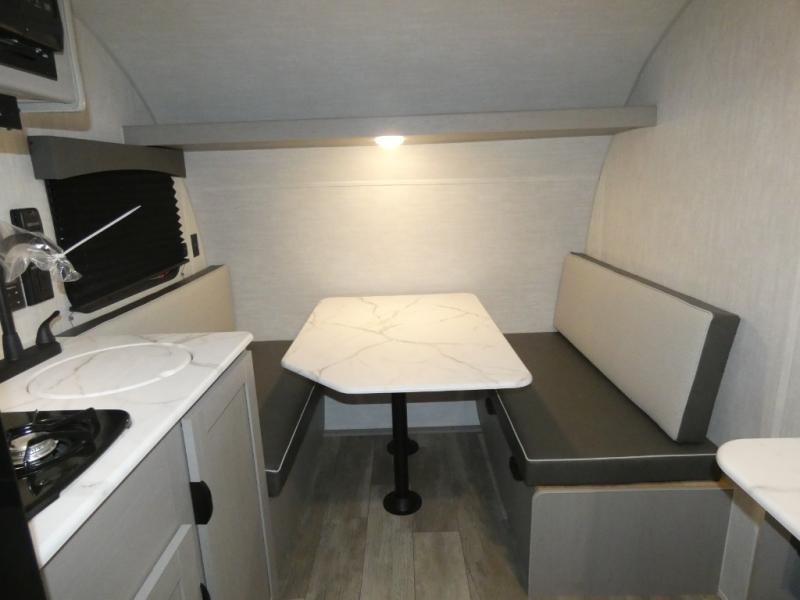 Tired of tent camping and sleeping on the ground? This lightweight travel trailer can accommodate you nicely with a dry and comfortable place to stay while enjoying nature. Inside, you will find a booth dinette for plenty of space to sit and stretch your legs, or enjoy a meal. The booth dinette easily converts to sleeping space at night. You might also enjoy your morning breakfast or coffee at the bar top with two stools. A 24" x 36" shower and toilet provide a convenience to your camping trips, no late nights running to the campground bathroom in the dark. And, the kitchen features a two burner cooktop and refrigerator so you can cook inside when you'd rather not deal with campfire smoke over an open fire. There is also plenty of storage for your things between the overhead cabinets and shelves, wardrobe/pantry near the door, and within exterior storage as well.