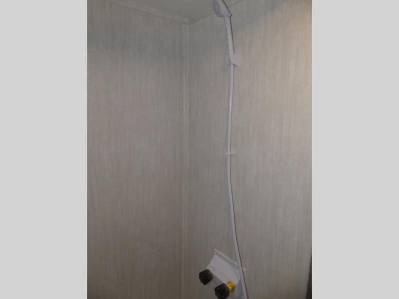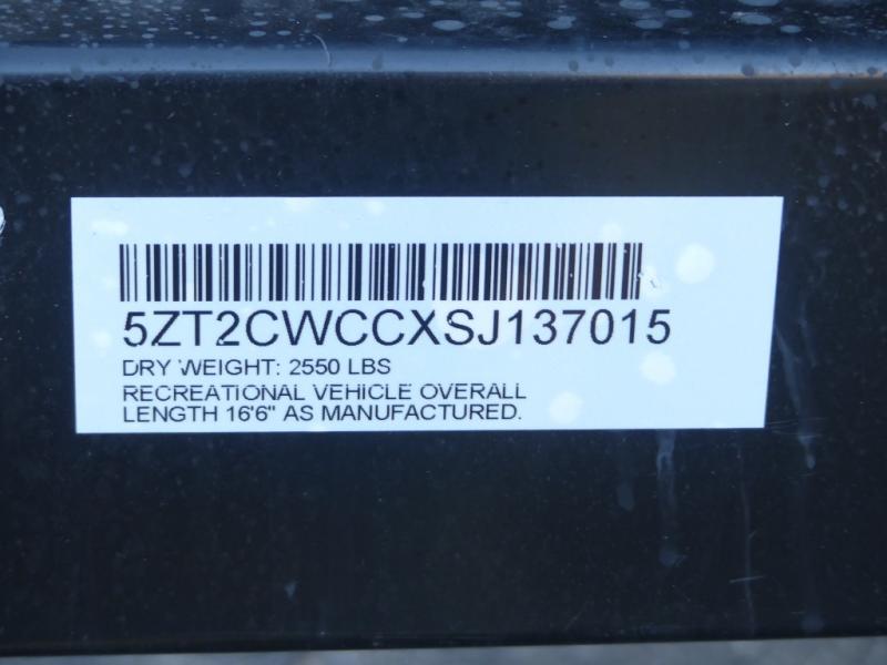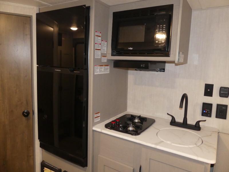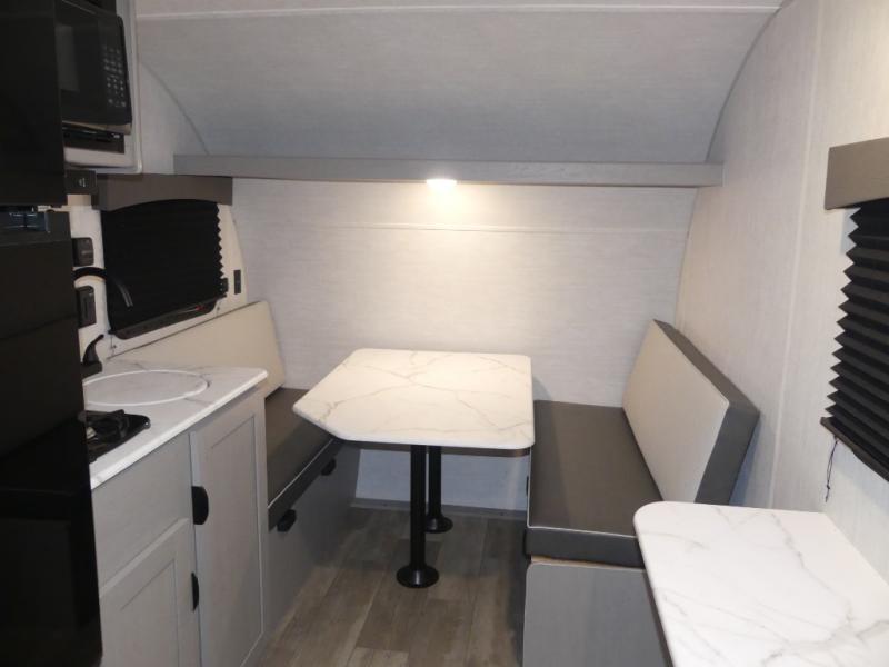 Tired of tent camping and sleeping on the ground? This lightweight travel trailer can accommodate you nicely with a dry and comfortable place to stay while enjoying nature. Inside, you will find a booth dinette for plenty of space to sit and stretch your legs, or enjoy a meal. The booth dinette easily converts to sleeping space at night. You might also enjoy your morning breakfast or coffee at the bar top with two stools. A 24" x 36" shower and toilet provide a convenience to your camping trips, no late nights running to the campground bathroom in the dark. And, the kitchen features a two burner cooktop and refrigerator so you can cook inside when you'd rather not deal with campfire smoke over an open fire. There is also plenty of storage for your things between the overhead cabinets and shelves, wardrobe/pantry near the door, and within exterior storage as well.