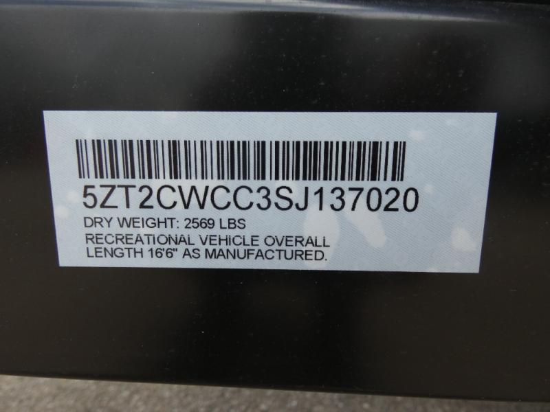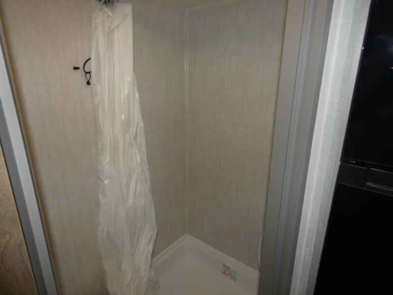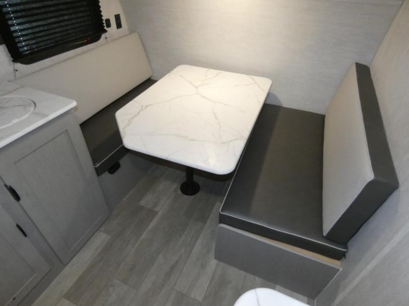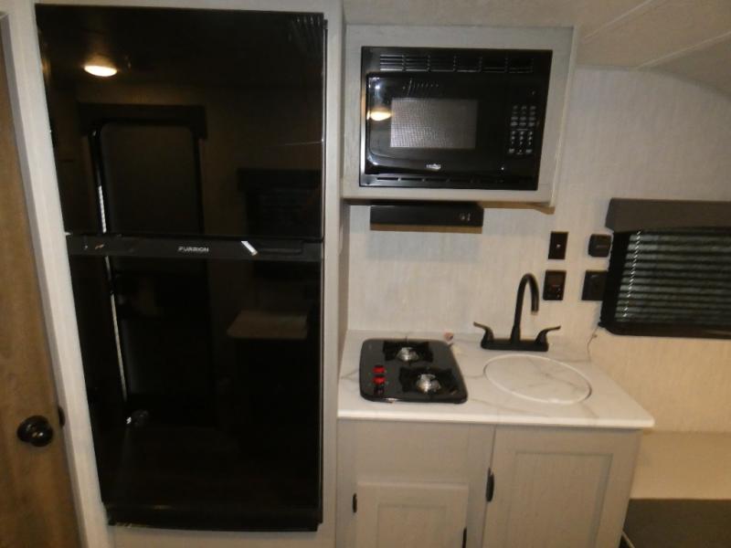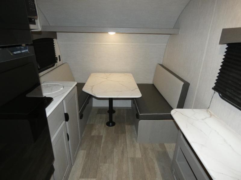 Tired of tent camping and sleeping on the ground? This lightweight travel trailer can accommodate you nicely with a dry and comfortable place to stay while enjoying nature. Inside, you will find a booth dinette for plenty of space to sit and stretch your legs, or enjoy a meal. The booth dinette easily converts to sleeping space at night. You might also enjoy your morning breakfast or coffee at the bar top with two stools. A 24" x 36" shower and toilet provide a convenience to your camping trips, no late nights running to the campground bathroom in the dark. And, the kitchen features a two burner cooktop and refrigerator so you can cook inside when you'd rather not deal with campfire smoke over an open fire. There is also plenty of storage for your things between the overhead cabinets and shelves, wardrobe/pantry near the door, and within exterior storage as well.