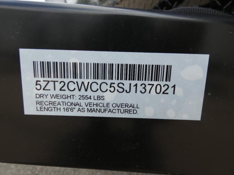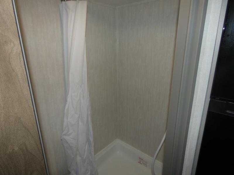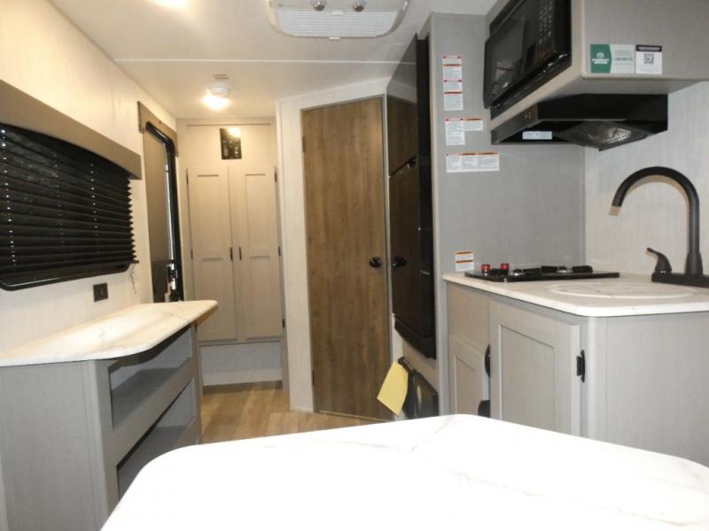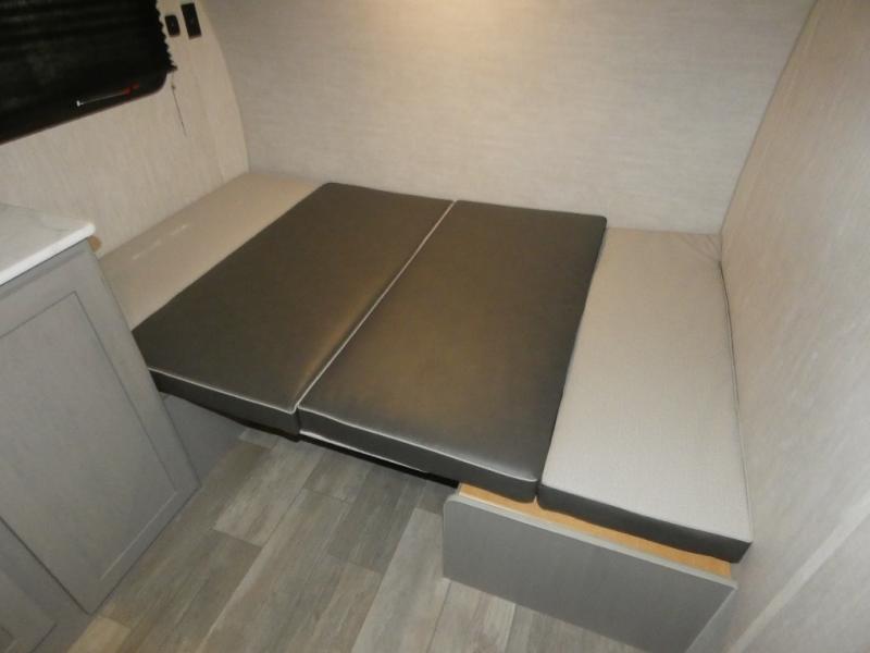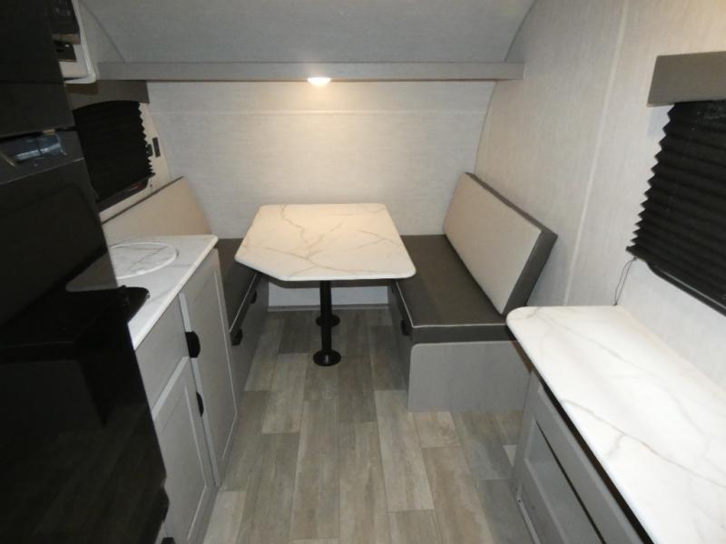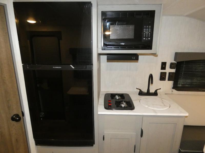 Tired of tent camping and sleeping on the ground? This lightweight travel trailer can accommodate you nicely with a dry and comfortable place to stay while enjoying nature. Inside, you will find a booth dinette for plenty of space to sit and stretch your legs, or enjoy a meal. The booth dinette easily converts to sleeping space at night. You might also enjoy your morning breakfast or coffee at the bar top with two stools. A 24" x 36" shower and toilet provide a convenience to your camping trips, no late nights running to the campground bathroom in the dark. And, the kitchen features a two burner cooktop and refrigerator so you can cook inside when you'd rather not deal with campfire smoke over an open fire. There is also plenty of storage for your things between the overhead cabinets and shelves, wardrobe/pantry near the door, and within exterior storage as well.