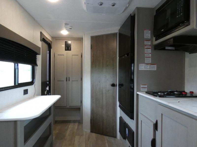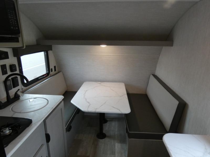 Tired of tent camping and sleeping on the ground? This lightweight travel trailer can accommodate you nicely with a dry and comfortable place to stay while enjoying nature. Inside, you will find a booth dinette for plenty of space to sit and stretch your legs, or enjoy a meal. The booth dinette easily converts to sleeping space at night. You might also enjoy your morning breakfast or coffee at the bar top with two stools. A 24" x 36" shower and toilet provide a convenience to your camping trips, no late nights running to the campground bathroom in the dark. And, the kitchen features a two burner cooktop and refrigerator so you can cook inside when you'd rather not deal with campfire smoke over an open fire. There is also plenty of storage for your things between the overhead cabinets and shelves, wardrobe/pantry near the door, and within exterior storage as well.