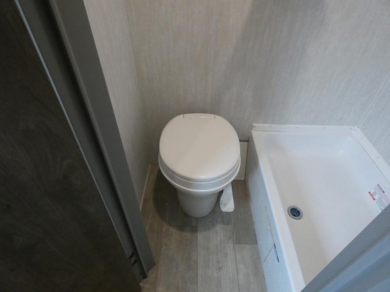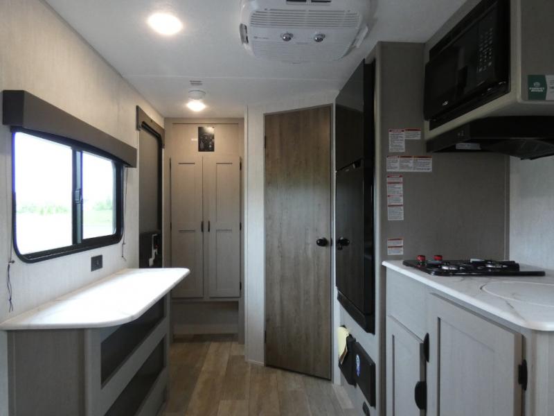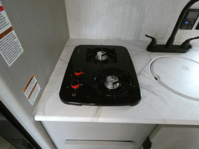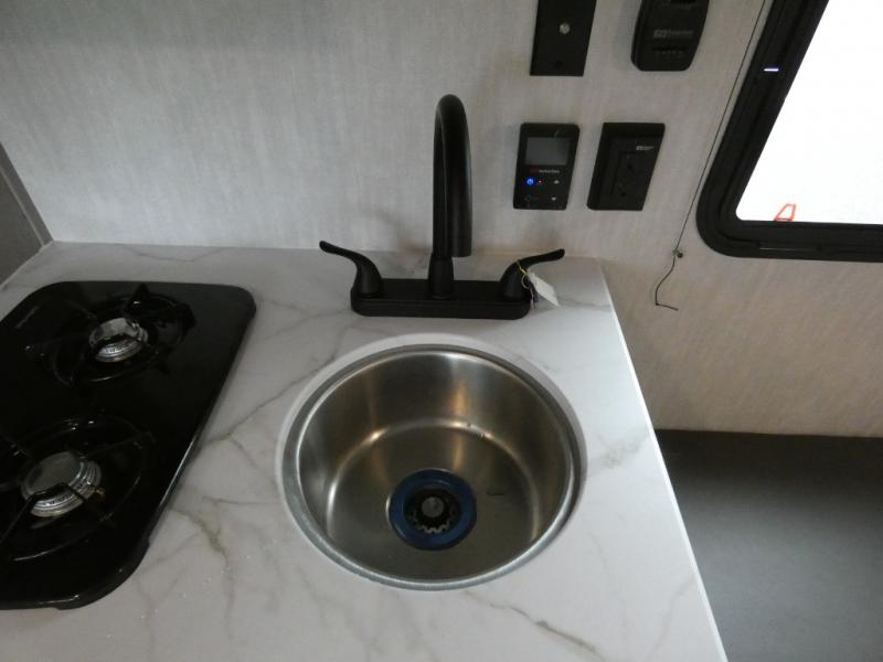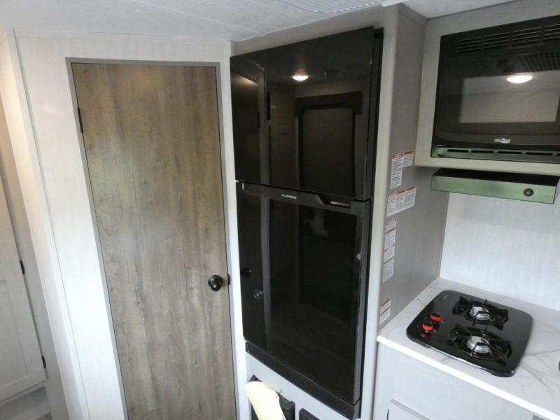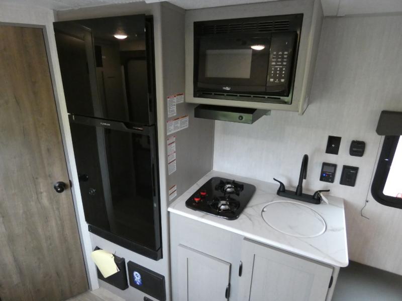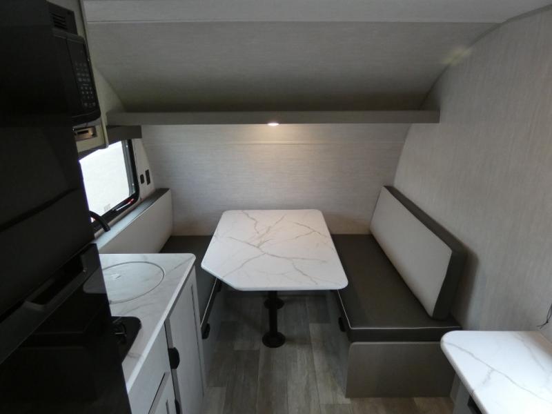 Tired of tent camping and sleeping on the ground? This lightweight travel trailer can accommodate you nicely with a dry and comfortable place to stay while enjoying nature. Inside, you will find a booth dinette for plenty of space to sit and stretch your legs, or enjoy a meal. The booth dinette easily converts to sleeping space at night. You might also enjoy your morning breakfast or coffee at the bar top with two stools. A 24" x 36" shower and toilet provide a convenience to your camping trips, no late nights running to the campground bathroom in the dark. And, the kitchen features a two burner cooktop and refrigerator so you can cook inside when you'd rather not deal with campfire smoke over an open fire. There is also plenty of storage for your things between the overhead cabinets and shelves, wardrobe/pantry near the door, and within exterior storage as well.