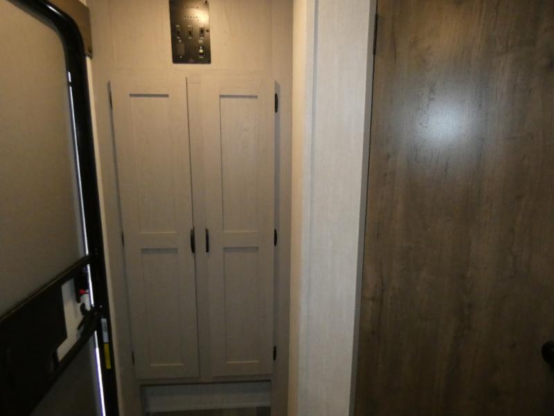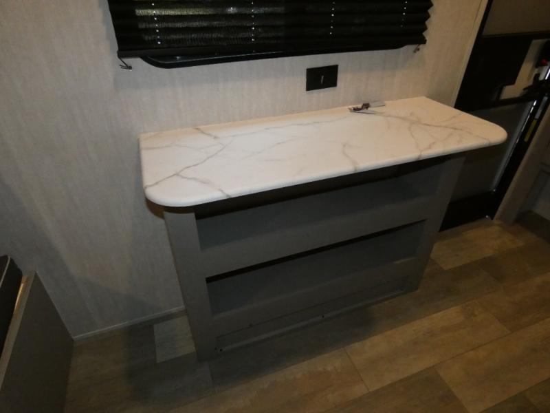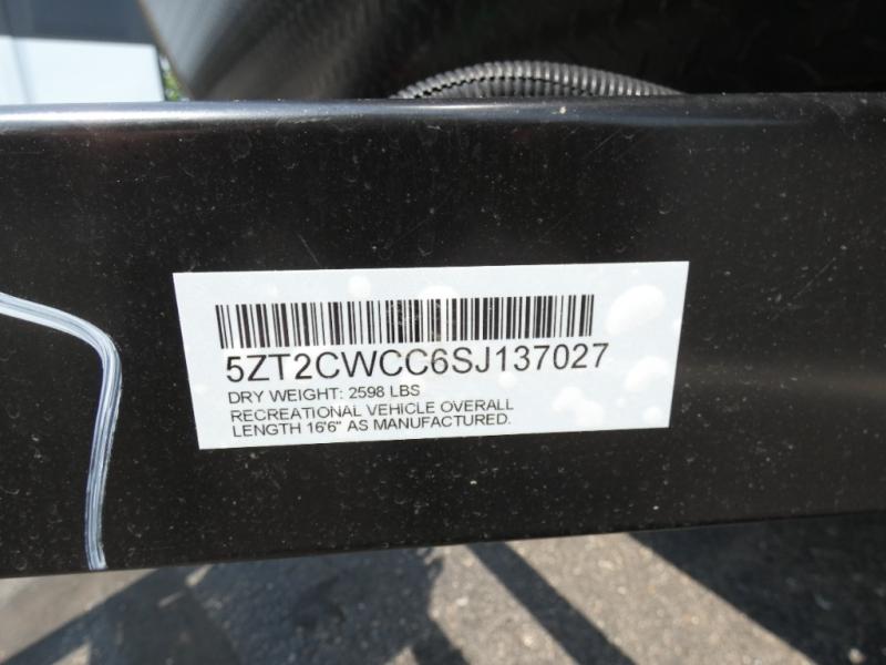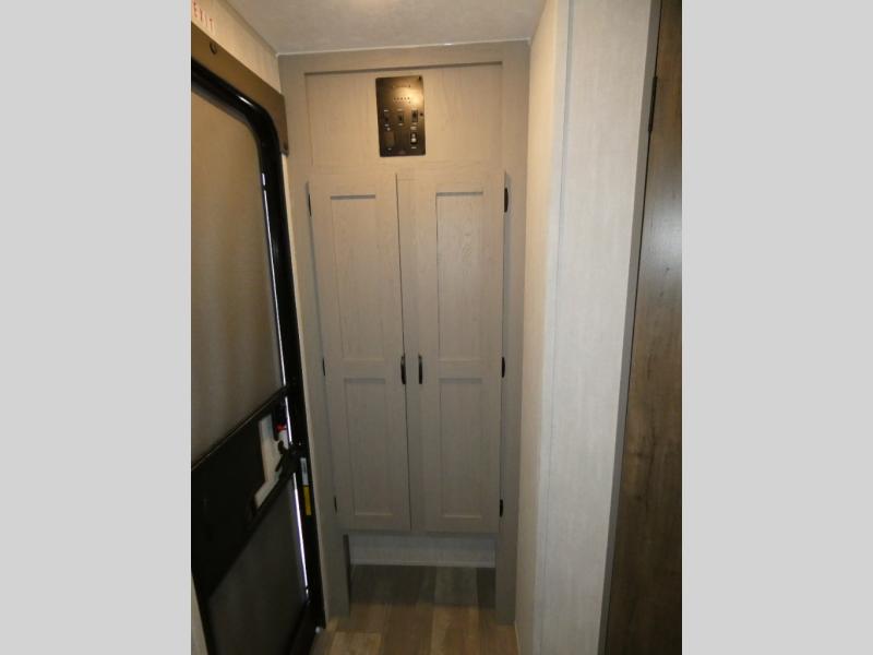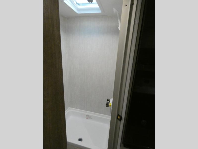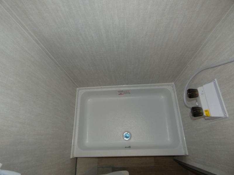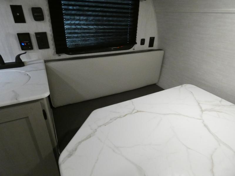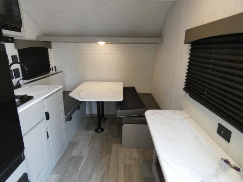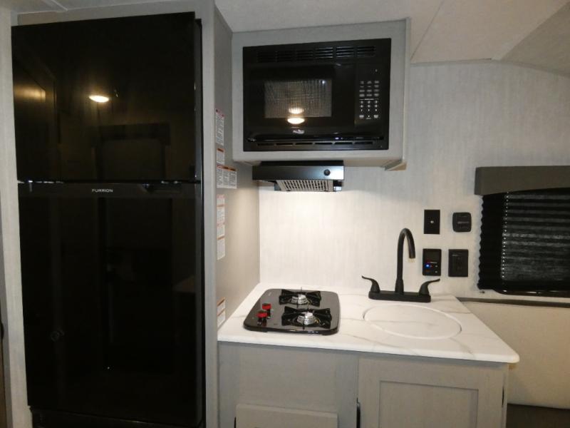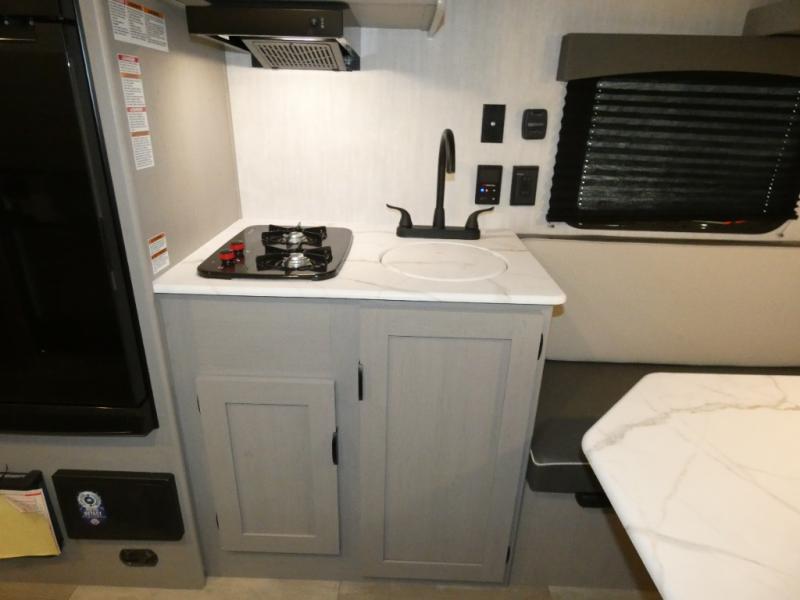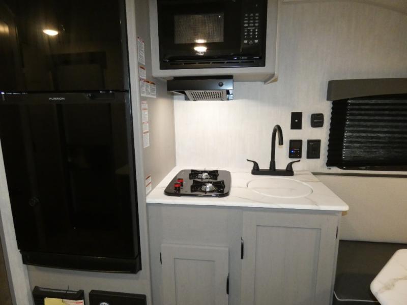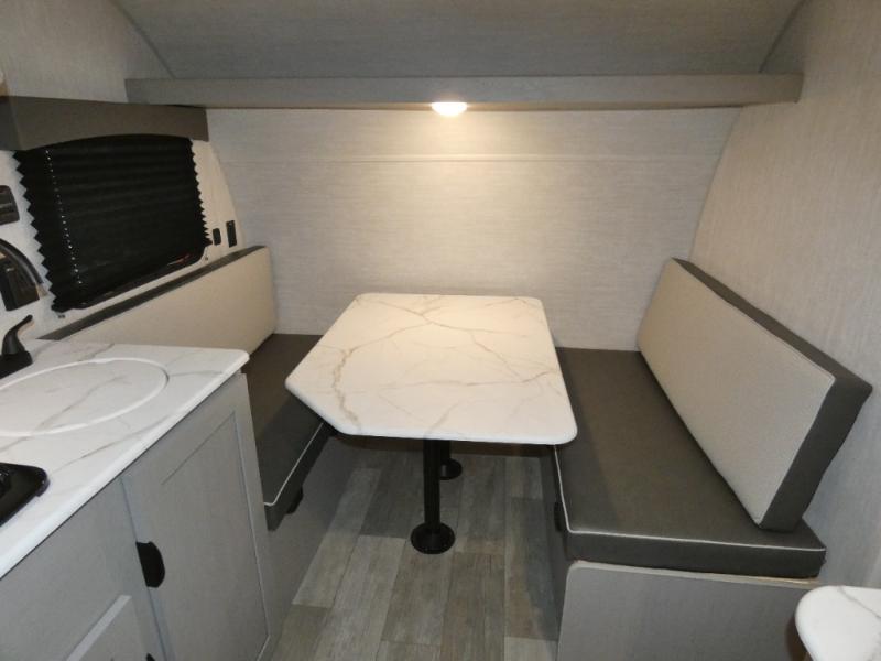 Tired of tent camping and sleeping on the ground? This lightweight travel trailer can accommodate you nicely with a dry and comfortable place to stay while enjoying nature. Inside, you will find a booth dinette for plenty of space to sit and stretch your legs, or enjoy a meal. The booth dinette easily converts to sleeping space at night. You might also enjoy your morning breakfast or coffee at the bar top with two stools. A 24" x 36" shower and toilet provide a convenience to your camping trips, no late nights running to the campground bathroom in the dark. And, the kitchen features a two burner cooktop and refrigerator so you can cook inside when you'd rather not deal with campfire smoke over an open fire. There is also plenty of storage for your things between the overhead cabinets and shelves, wardrobe/pantry near the door, and within exterior storage as well.