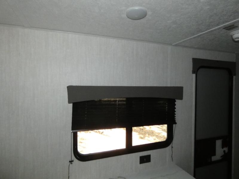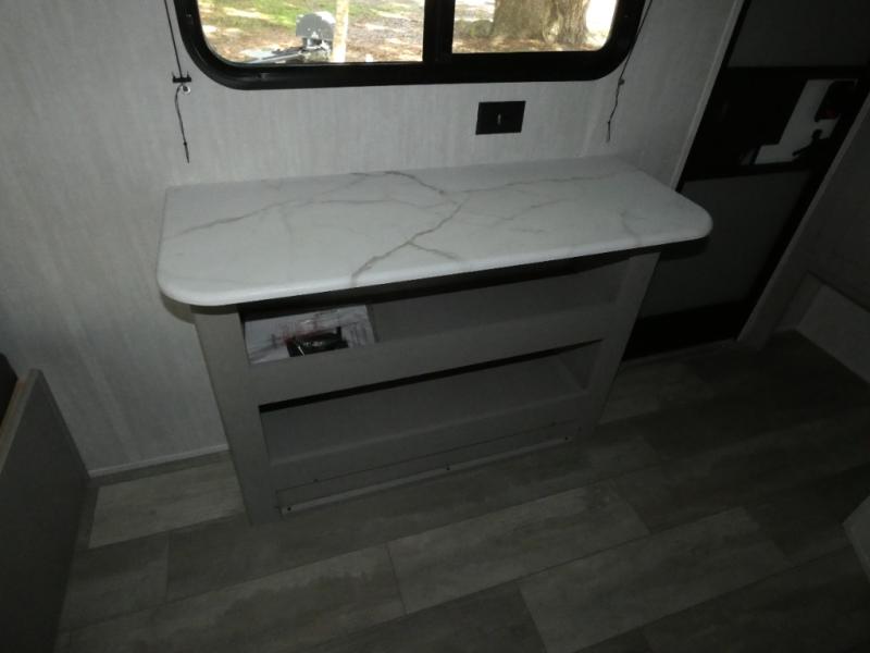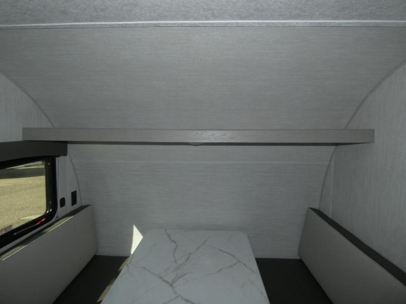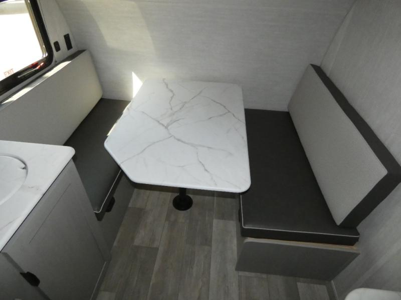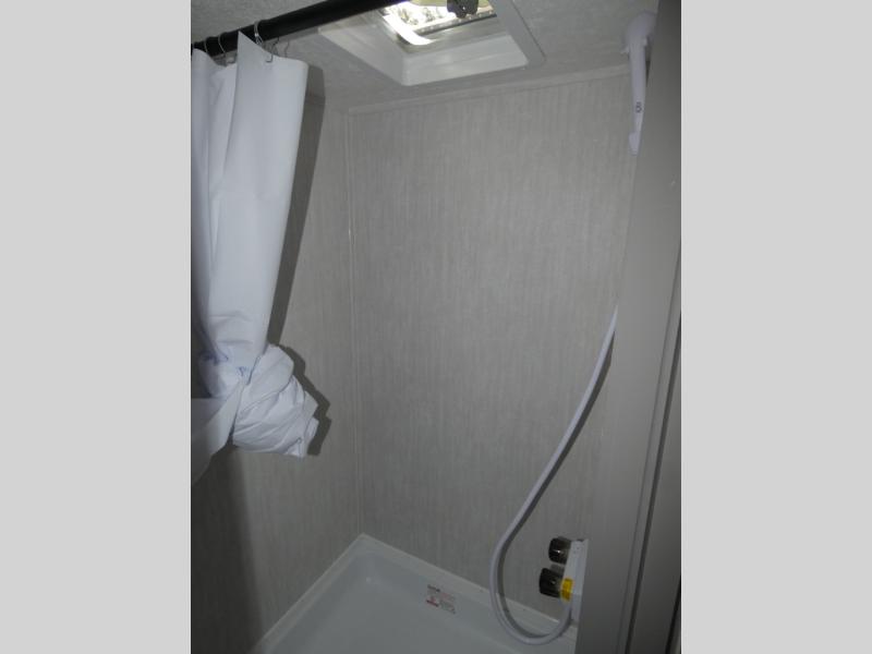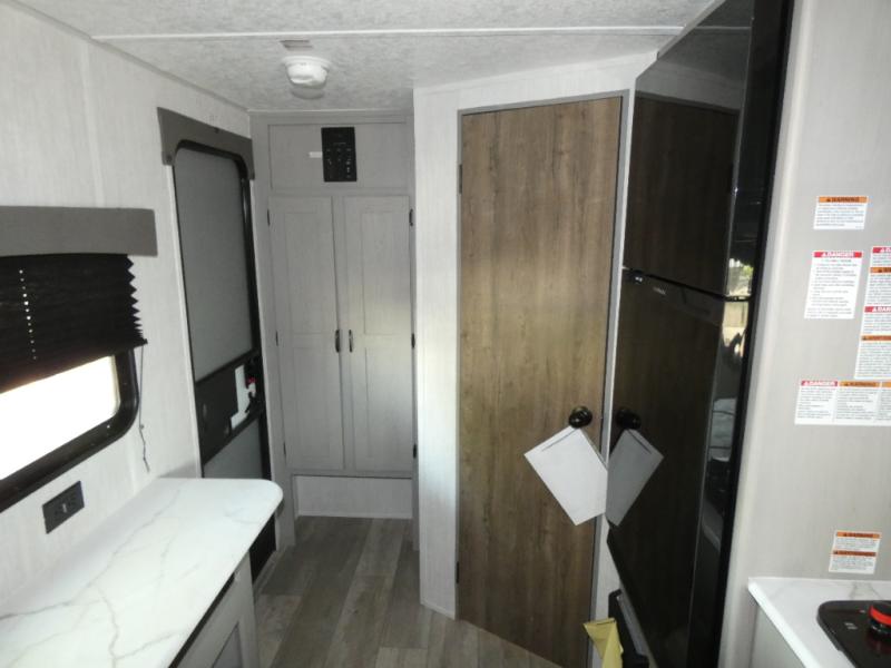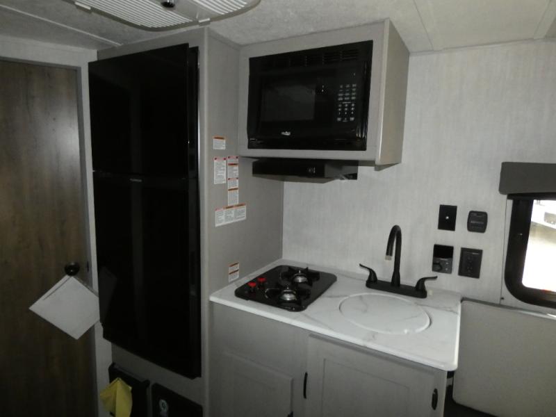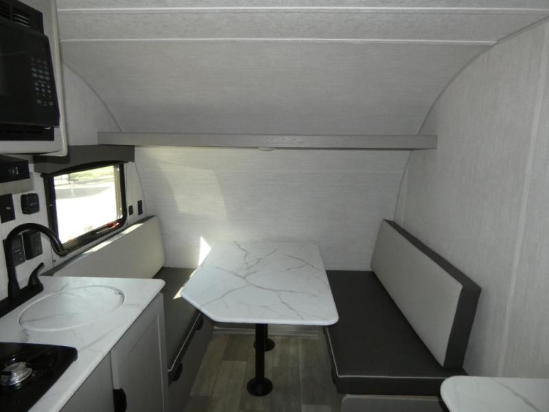 Tired of tent camping and sleeping on the ground? This lightweight travel trailer can accommodate you nicely with a dry and comfortable place to stay while enjoying nature. Inside, you will find a booth dinette for plenty of space to sit and stretch your legs, or enjoy a meal. The booth dinette easily converts to sleeping space at night. You might also enjoy your morning breakfast or coffee at the bar top with two stools. A 24" x 36" shower and toilet provide a convenience to your camping trips, no late nights running to the campground bathroom in the dark. And, the kitchen features a two burner cooktop and refrigerator so you can cook inside when you'd rather not deal with campfire smoke over an open fire. There is also plenty of storage for your things between the overhead cabinets and shelves, wardrobe/pantry near the door, and within exterior storage as well.