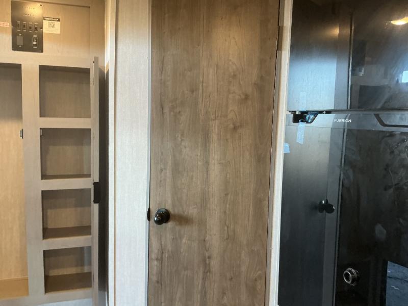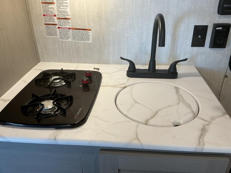 Tired of tent camping and sleeping on the ground? This lightweight travel trailer can accommodate you nicely with a dry and comfortable place to stay while enjoying nature. Inside, you will find a booth dinette for plenty of space to sit and stretch your legs, or enjoy a meal. The booth dinette easily converts to sleeping space at night. You might also enjoy your morning breakfast or coffee at the bar top with two stools. A 24" x 36" shower and toilet provide a convenience to your camping trips, no late nights running to the campground bathroom in the dark. And, the kitchen features a two burner cooktop and refrigerator so you can cook inside when you'd rather not deal with campfire smoke over an open fire. There is also plenty of storage for your things between the overhead cabinets and shelves, wardrobe/pantry near the door, and within exterior storage as well.