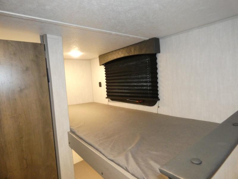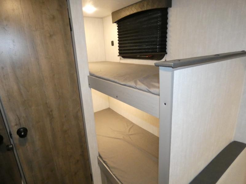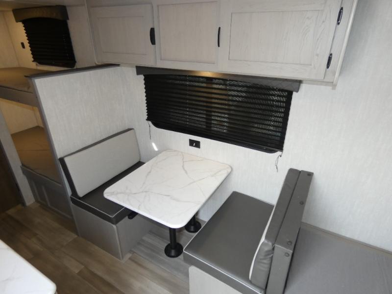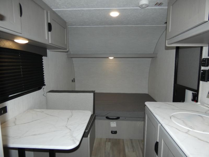 You can sleep five people in this Clipper 3K Series travel trailer with the 54" x 74" bed at the front, the booth dinette, and the 28" x 72" bunks. There is a private bathroom that everyone can use to stay clean, and the chef of the group can cook meals on the cooktop in the kitchen. There is a storage cabinet in the kitchen plus overhead cabinets for even more storage, and there is a pass-through exterior storage for larger gear. When it's raining outside, simply put out the 10' power awning for protection.