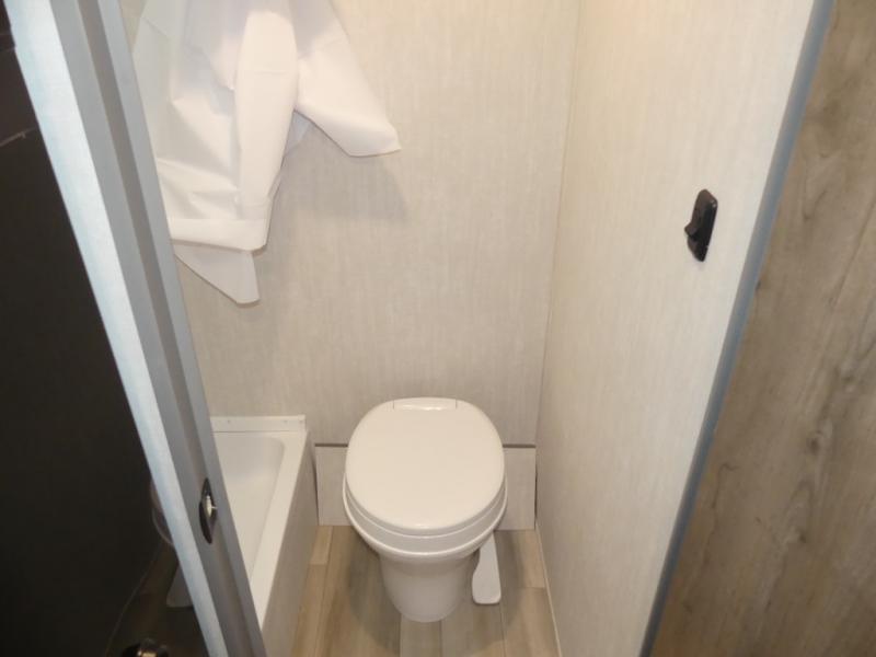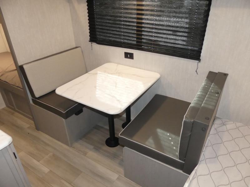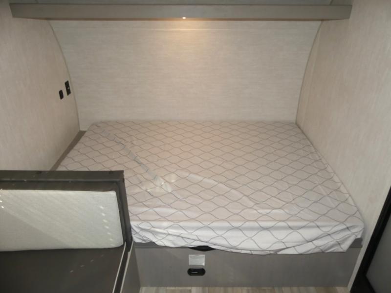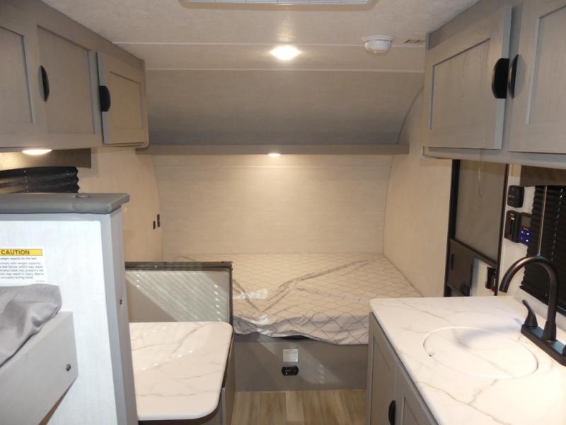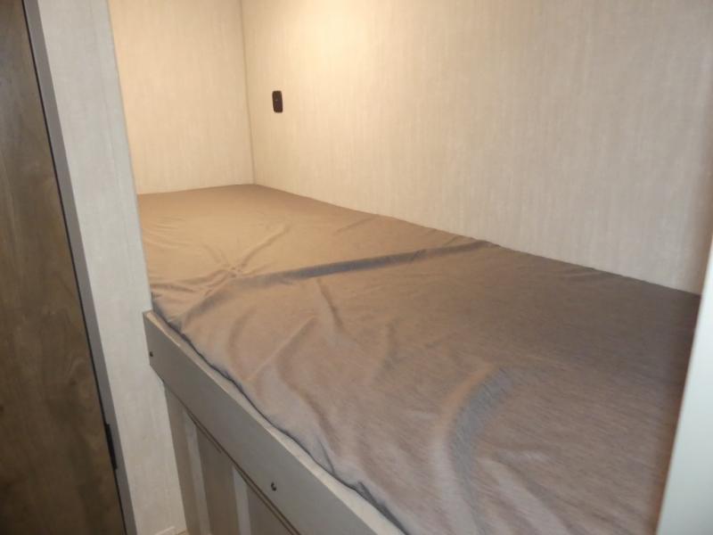 You can sleep five people in this Clipper 3K Series travel trailer with the 54" x 74" bed at the front, the booth dinette, and the 28" x 72" bunks. There is a private bathroom that everyone can use to stay clean, and the chef of the group can cook meals on the cooktop in the kitchen. There is a storage cabinet in the kitchen plus overhead cabinets for even more storage, and there is a pass-through exterior storage for larger gear. When it's raining outside, simply put out the 10' power awning for protection.