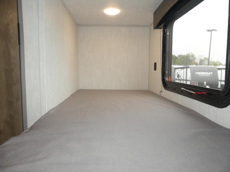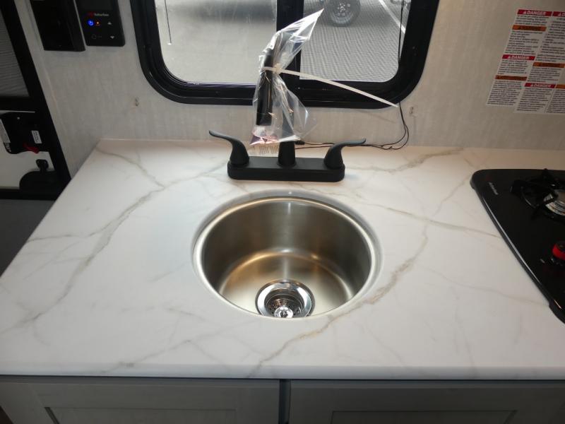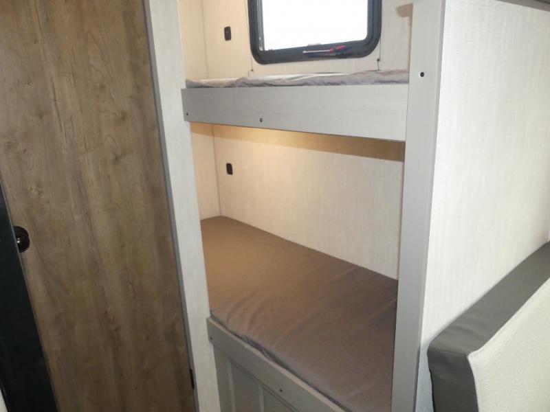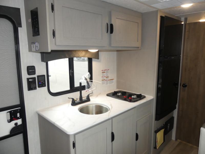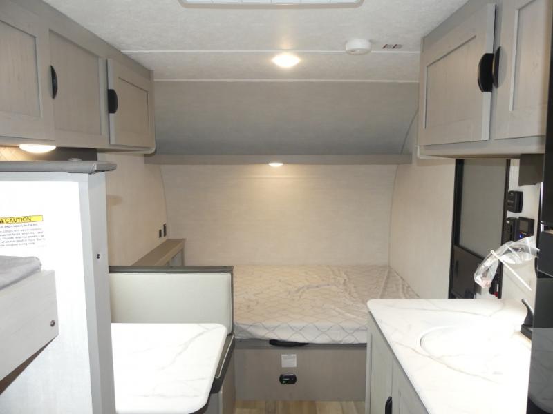 You can sleep five people in this Clipper 3K Series travel trailer with the 54" x 74" bed at the front, the booth dinette, and the 28" x 72" bunks. There is a private bathroom that everyone can use to stay clean, and the chef of the group can cook meals on the cooktop in the kitchen. There is a storage cabinet in the kitchen plus overhead cabinets for even more storage, and there is a pass-through exterior storage for larger gear. When it's raining outside, simply put out the 10' power awning for protection.