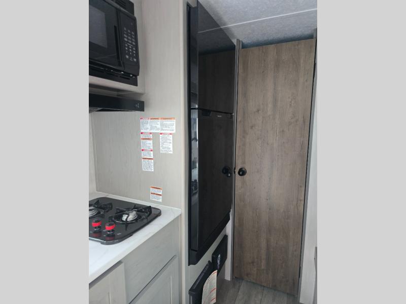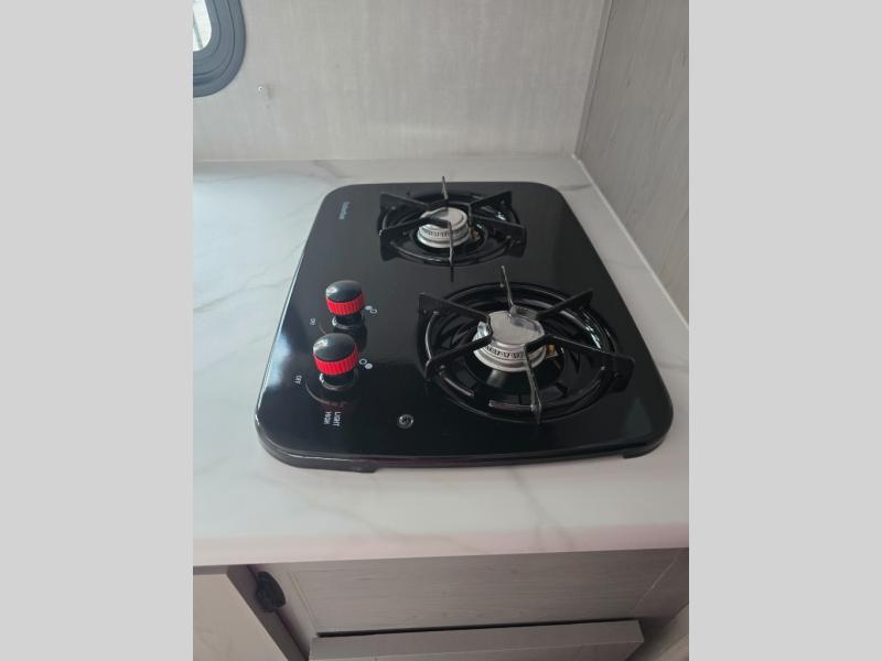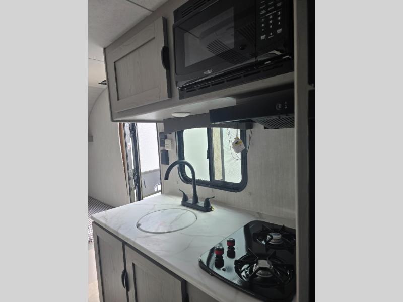 You can sleep five people in this Clipper 3K Series travel trailer with the 54" x 74" bed at the front, the booth dinette, and the 28" x 72" bunks. There is a private bathroom that everyone can use to stay clean, and the chef of the group can cook meals on the induction cooktop in the kitchen. There is a storage cabinet in the kitchen plus overhead cabinets for even more storage, and there is a pass-through exterior storage for larger gear. When it's raining outside, simply put out the 10' power awning for protection.