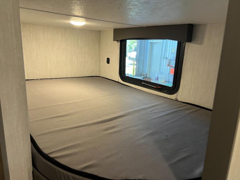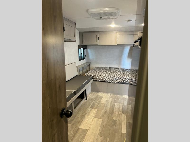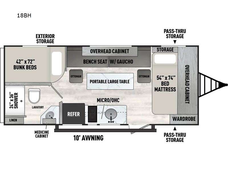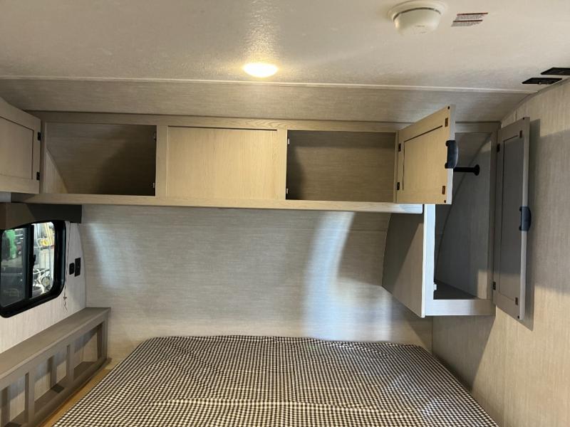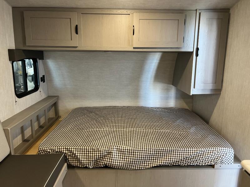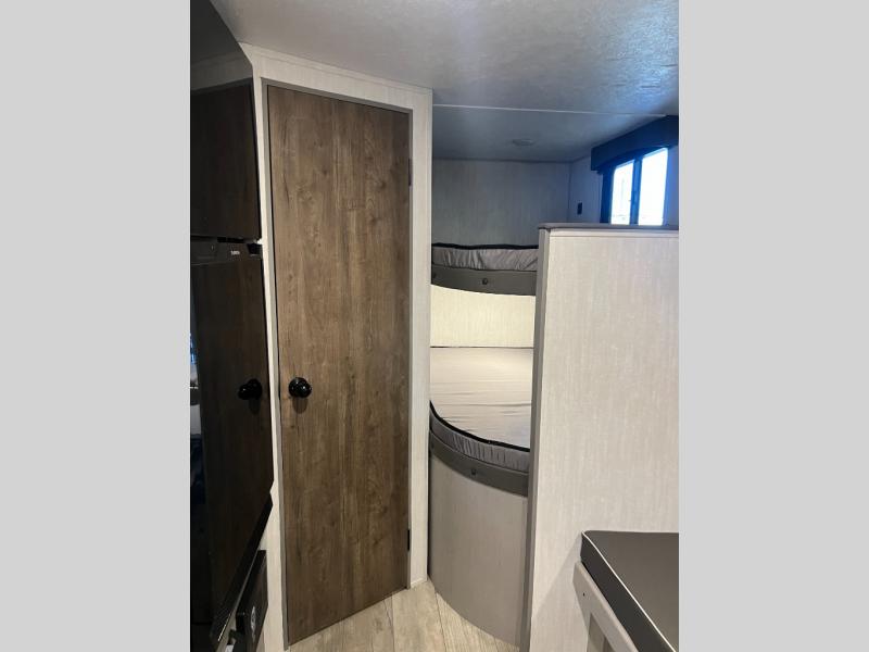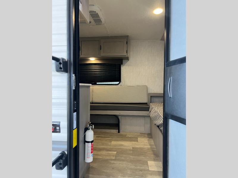 This travel trailer is perfect for a small family who wants to escape the hustle and bustle of everyday life! The front 54" x 74" bed offers a comfortable place to lay your head at night, and there is a wardrobe and overhead cabinet to store your items. Prepare a delicious home cooked meal with the two burner cooktop and eat them at the booth dinette before playing a card game or two. The kiddos and a couple of friends can sleep on the set of 42" x 72" bunk beds, and will enjoy how easy it is to access the rear corner bathroom right next to them!