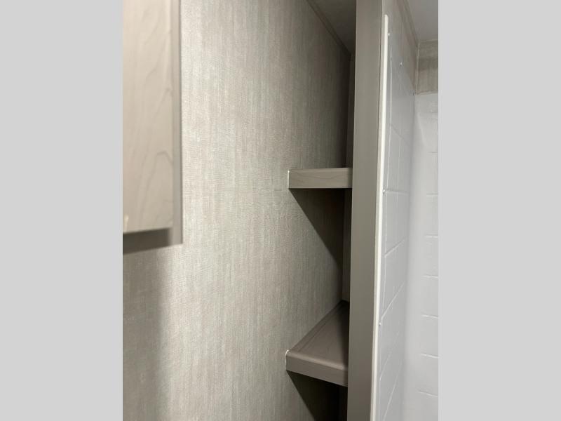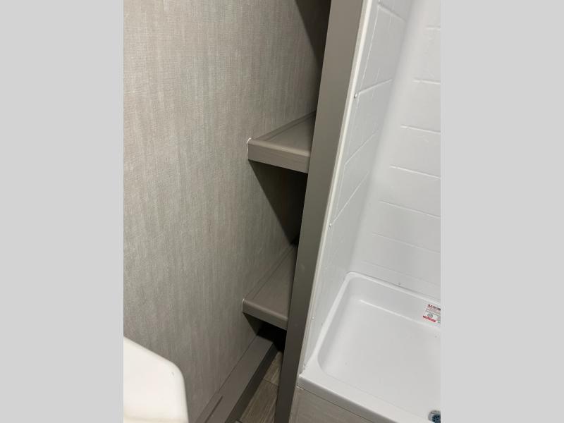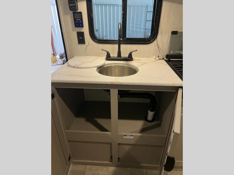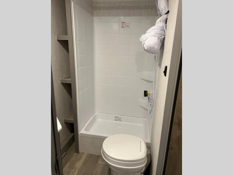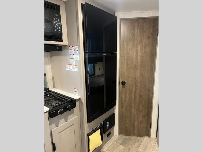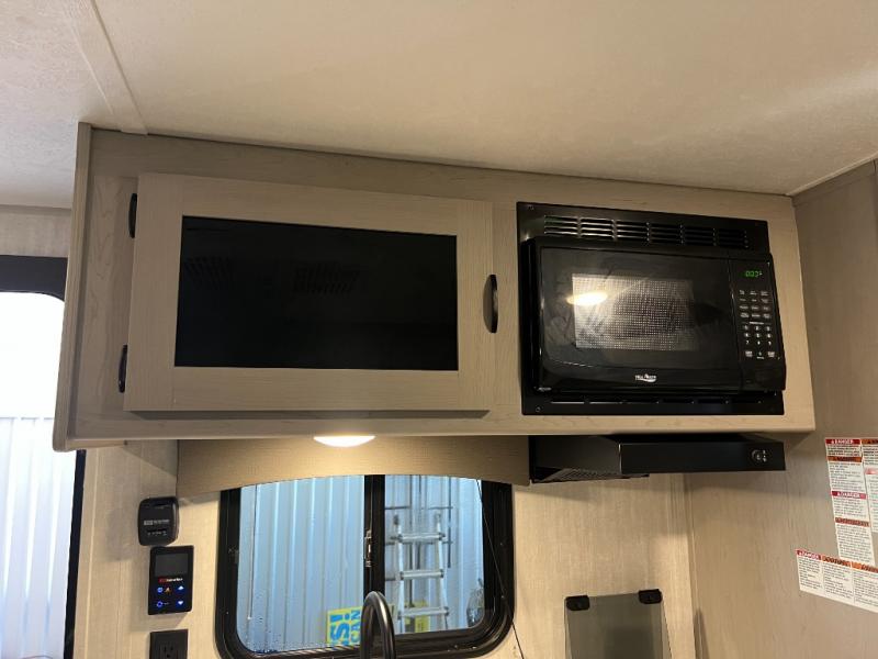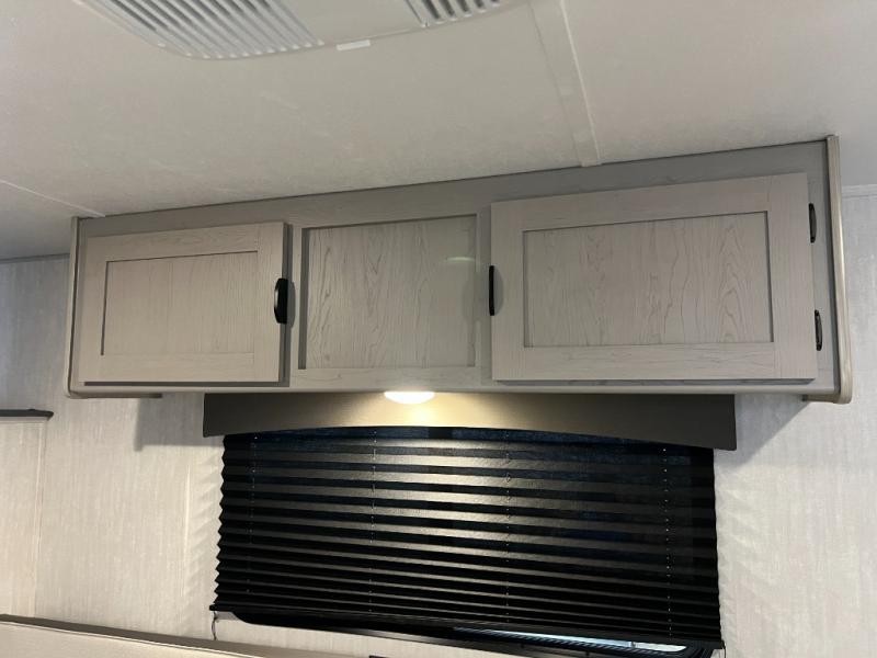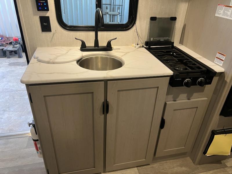This travel trailer is perfect for a small family who wants to escape the hustle and bustle of everyday life! The front 54" x 74" bed offers a comfortable place to lay your head at night, and there is a wardrobe and overhead cabinet to store your items. Prepare a delicious home cooked meal with the two burner cooktop and eat them at the booth dinette before playing a card game or two. The kiddos and a couple of friends can sleep on the set of 42" x 72" bunk beds, and will enjoy how easy it is to access the rear corner bathroom right next to them!
