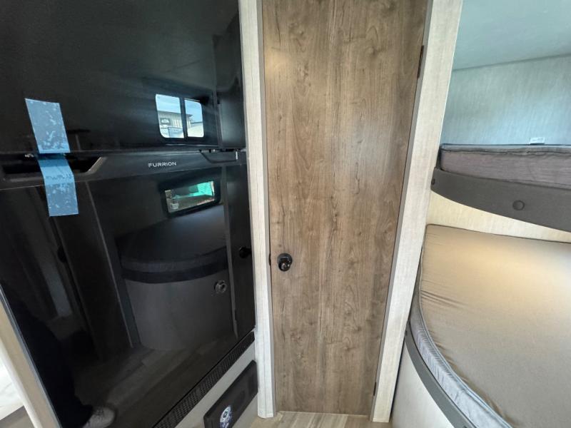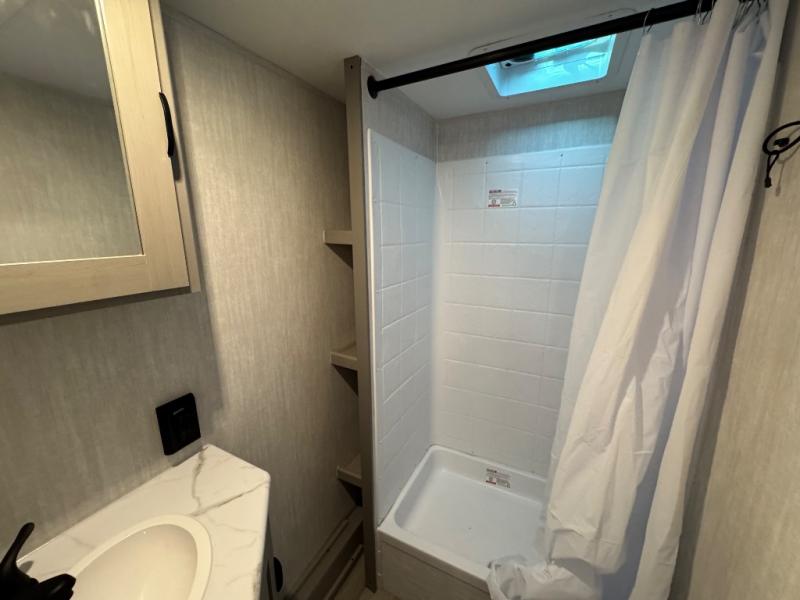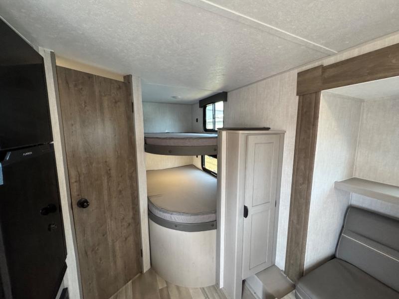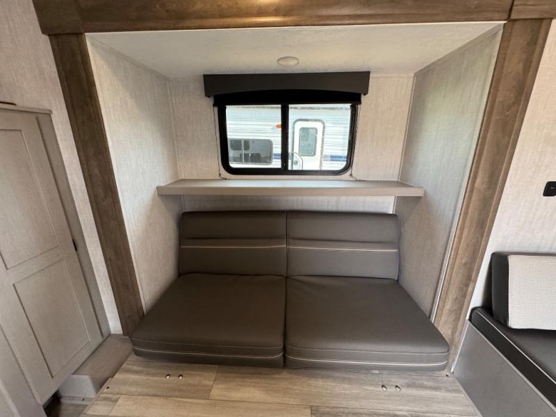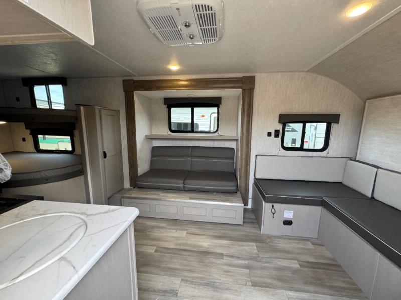 This trailer easily sleeps a family of eight and provides plenty of seating thanks to the versatile space saving Murphy wall-bed behind the U-dinette. During the day, the U-dinette provides seating for the whole gang. At night, move the table and cushions and flip down a comfortable 54" x 74" bed. There is a jackknife sofa slide, and opposite you will find the kitchen area allowing you to easily whip up meals and snacks using the two burner cooktop, sink, overhead microwave oven, and refrigerator. A pantry cabinet is also available for all of your dry goods. At the rear of this unit, you will find sleeping for four on the 42" x 72" bunks along the roadside corner, and a full bath with shower, toilet, and vanity with sink and medicine cabinet along the curbside corner. The bath features a skylight for more headroom and natural lighting.
