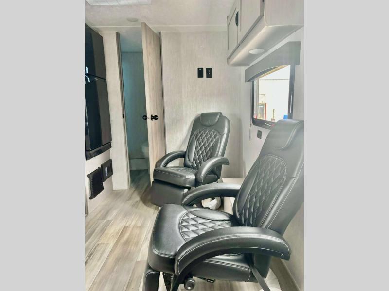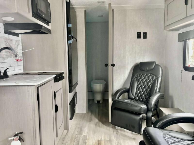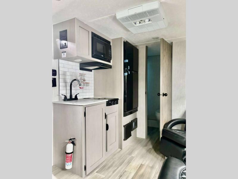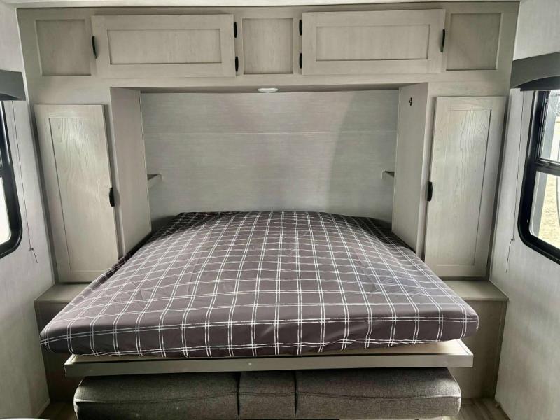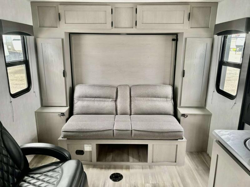 Take this versatile couple's travel trailer to your favorite destinations! It features a front jackknife sofa with Murphy Bed for you to have ample seating during the day and at night a comfy bed. There are also two wardrobes with a private shelf on each end and an overhead shelf above for your things. There is additional seating with two recliner chairs including a table between opposite the kitchen area. This space also features overhead storage. The full rear bath offers a 24" x 36" shower, sink with medicine cabinet and linen storage as well. You can easily cook simple camp meals using the two-burner cooktop or the microwave. On the exterior, a front pass-through storage compartment is available for all of your outdoor gear!