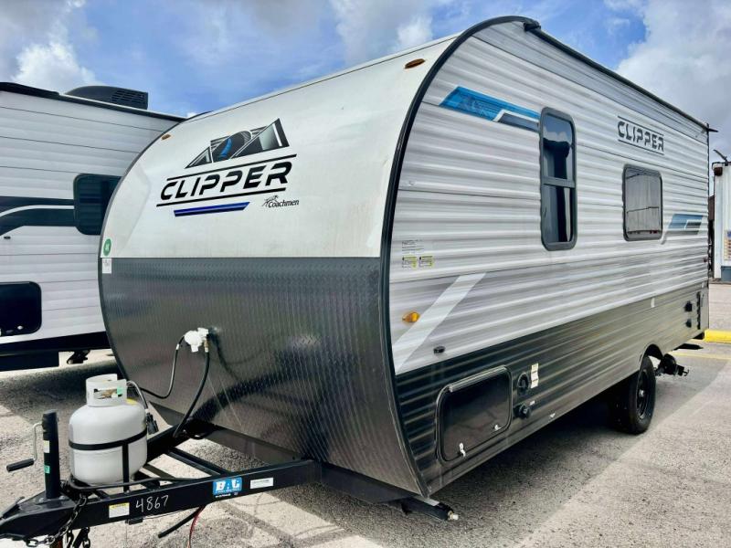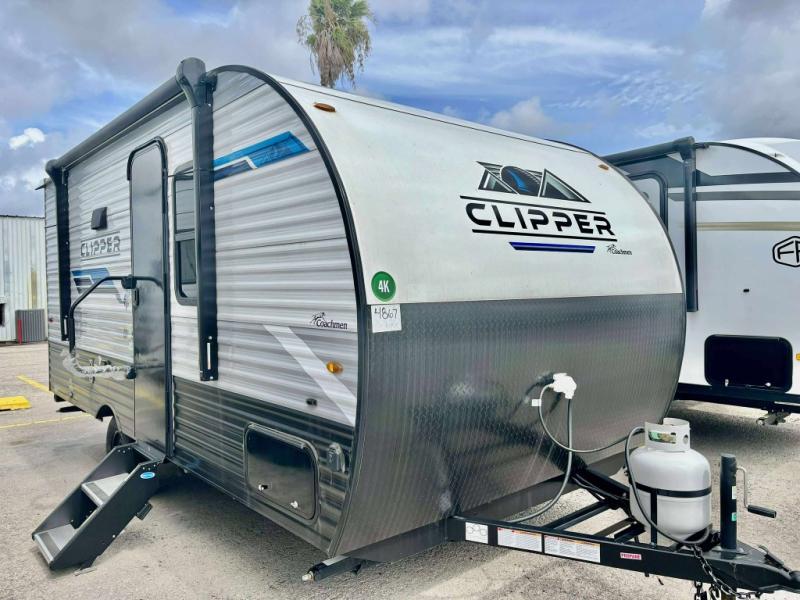 With any Coachmen Clipper 4K Series travel trailer, you can experience affordable camping with your family with the same comforts and quality found in bigger trailers. Each is built on an 8' wide frame with aerodynamic engineered front profile for easy towing. There are four stabilizing jacks to make camp setup easy while keeping your trailer secure while in camp, plus electric brakes for a safer tow. You will also appreciate the large entrance grab handle and jumbo pass-through storage for all of your outdoor gear. Inside, a kitchen backsplash, a 12V refrigerator, sink covers for added counter space, and a foot flush toilet, plus more. Choose an easy to tow Clipper 4K Series and start enjoying the great outdoors without breaking your budget!