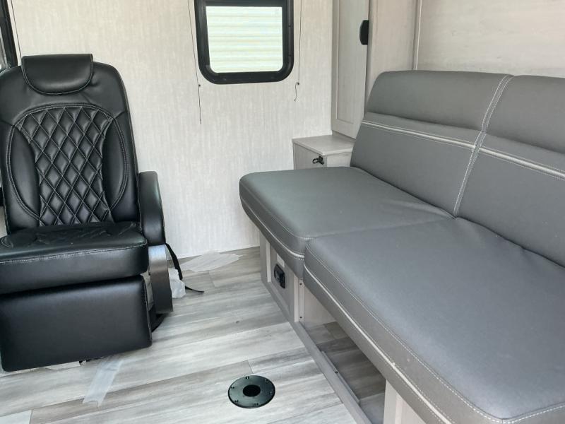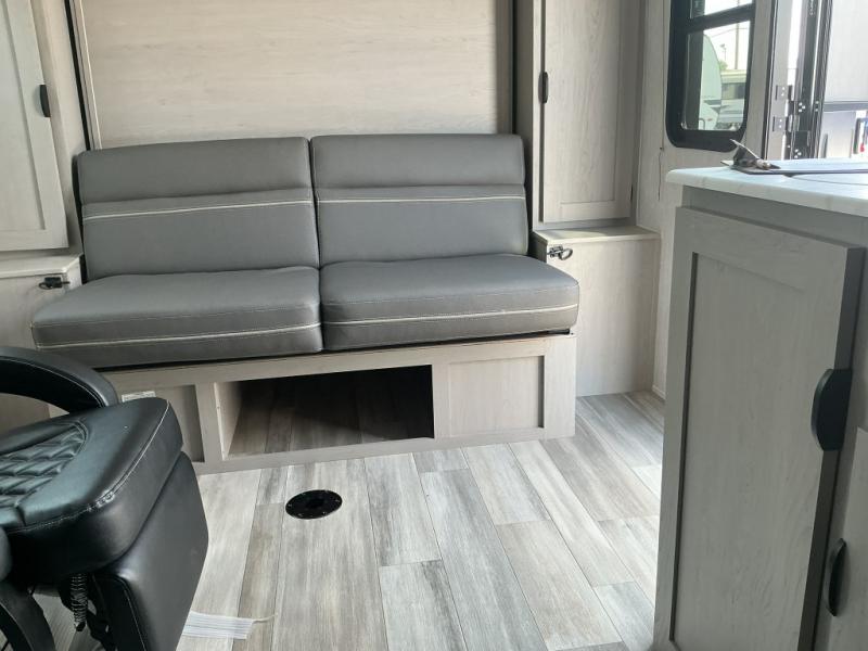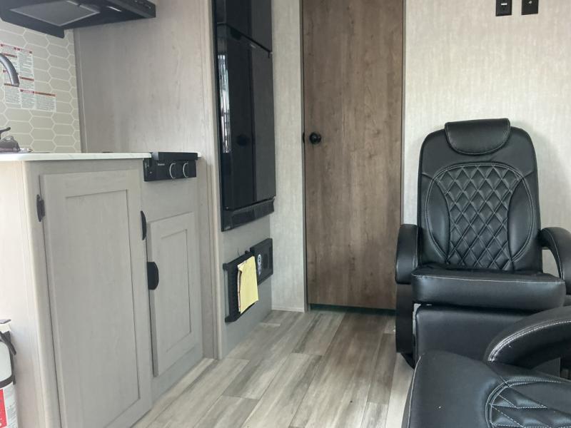 Take this versatile couple's travel trailer to your favorite destinations! It features a front jackknife sofa with Murphy Bed for you to have ample seating during the day and at night a comfy bed. There are also two wardrobes with a private shelf on each end and an overhead shelf above for your things. There is additional seating with two recliner chairs including a table between opposite the kitchen area. This space also features overhead storage. The full rear bath offers a 24" x 36" shower, sink with medicine cabinet and linen storage as well. You can easily cook simple camp meals using the two burner cooktop or the microwave. On the exterior, a front pass-through storage compartment is available for all of your outdoor gear!