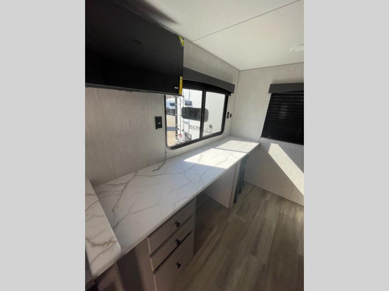 Enjoy the feeling of having your own bar thanks to the incredible bar stool and Large counter top that will allow you experience having a nice drink after a long day. Have a nice rest on the queen bed located in the front bedroom, which also has plenty of space due to its over head cabinet, dual wardrobes and private shelves besides the bed. Pamper yourself in the amazing full bath and after that have a relaxing time on the comfortable jack knife sofa.