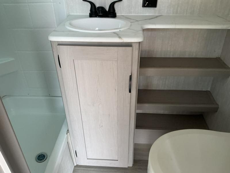 Enjoy the feeling of having your own bar thanks to the incredible bar stool and Large counter top that will allow you experience having a nice drink after a long day. Have a nice rest on the queen bed located in the front bedroom, which also has plenty of space due to its over head cabinet, dual wardrobes and private shelves besides the bed. Pamper yourself in the amazing full bath and after that have a relaxing time on the comfortable jack knife sofa.