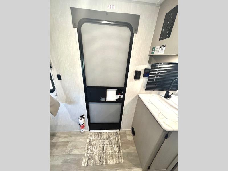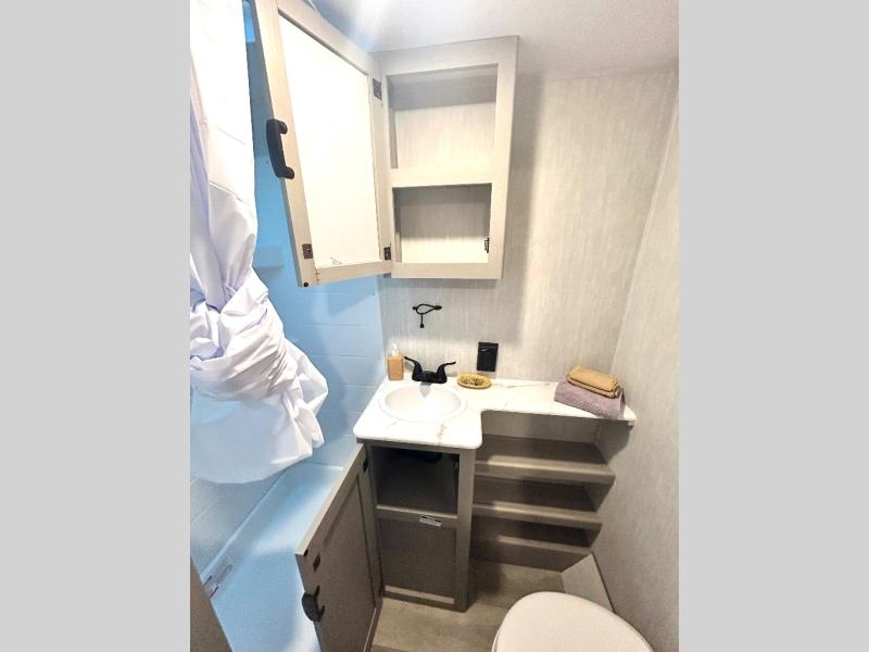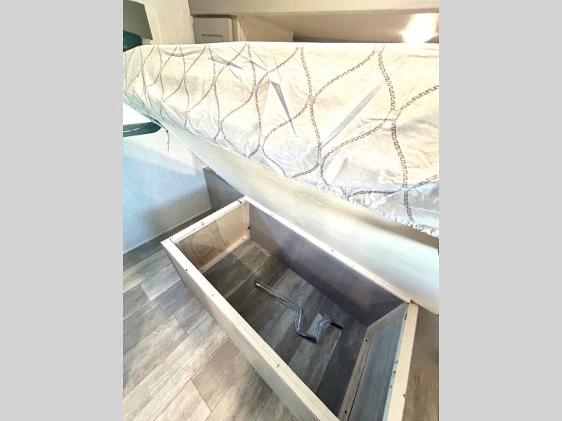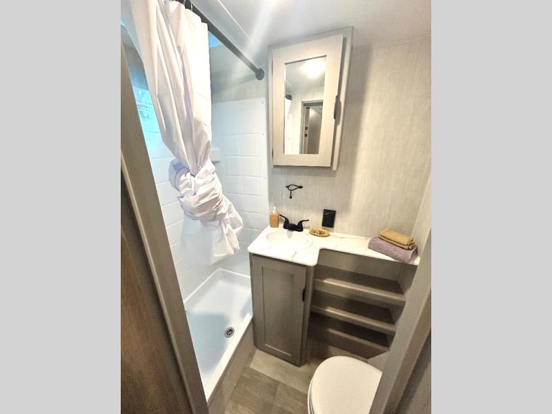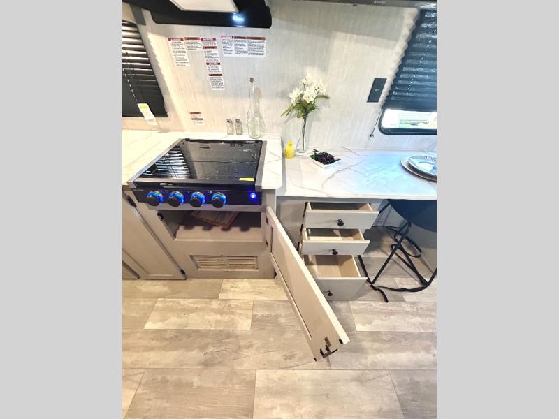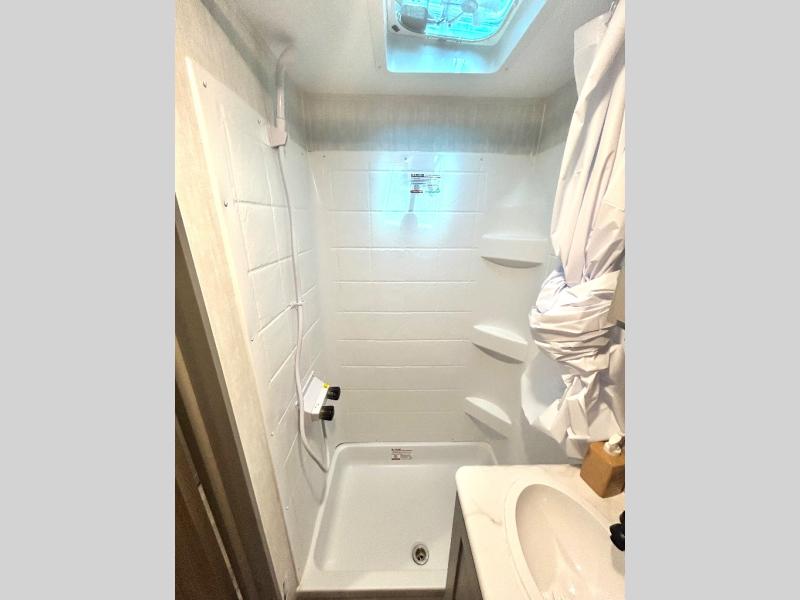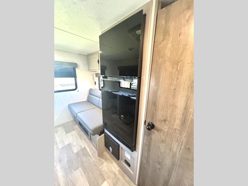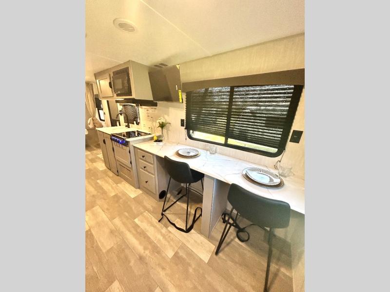 Enjoy the feeling of having your own bar thanks to the incredible bar stool and Large counter top that will allow you experience having a nice drink after a long day. Have a nice rest on the queen bed located in the front bedroom, which also has plenty of space due to its over head cabinet, dual wardrobes and private shelves besides the bed. Pamper yourself in the amazing full bath and after that have a relaxing time on the comfortable jack knife sofa.