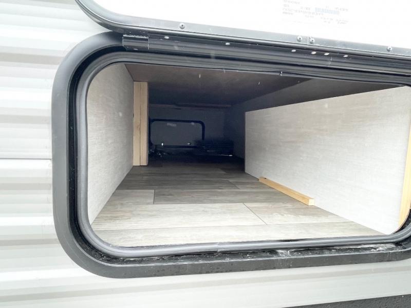 This travel trailer is perfect for a big crowd! Relax to the fullest on the queen bed located in the front bedroom, which also has plenty of space due to its over head cabinet, dual wardrobes and private shelves besides the bed. The double bunk beds are ideal for kids to take a nap, also the U-shaped dinette is another option to use it as a makeshift bed. Take a long bath on the large rear bathroom, special for pamper yourself in the most comfortable way. This model also includes a 12V refrigerator to keep your food fresh, a 2-burner cooktop and a washer/dryer prep; all the comfort of home on the road!