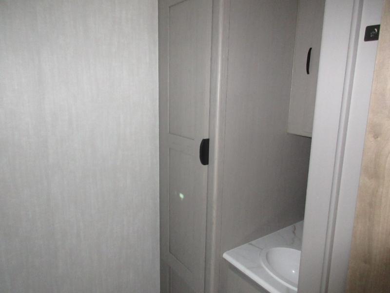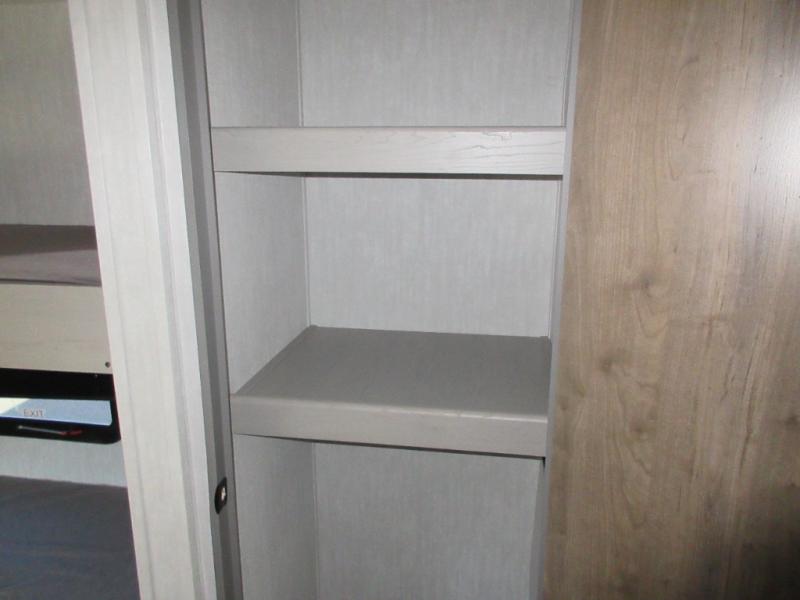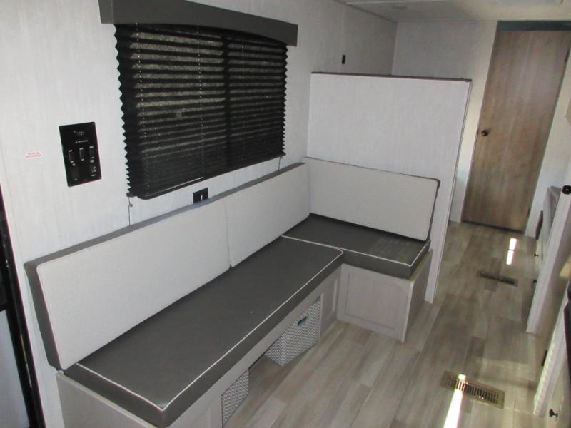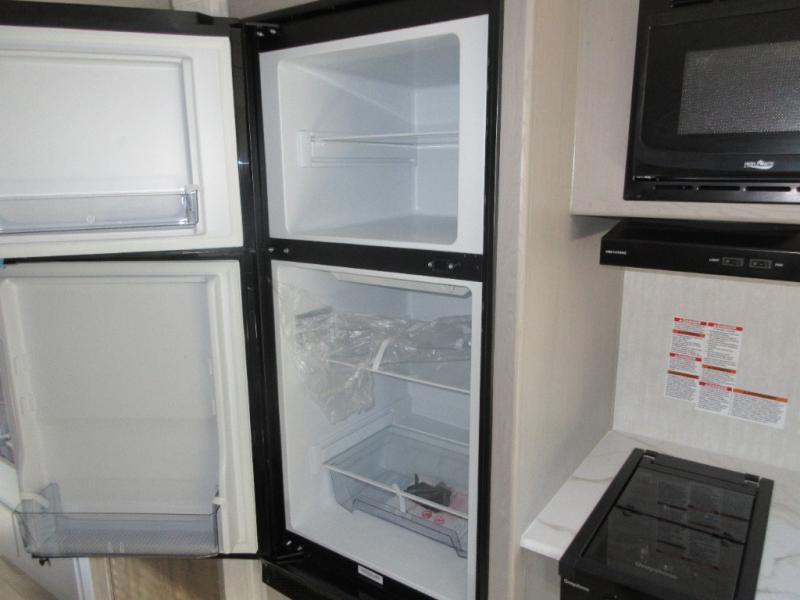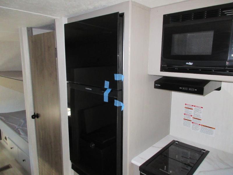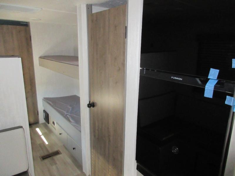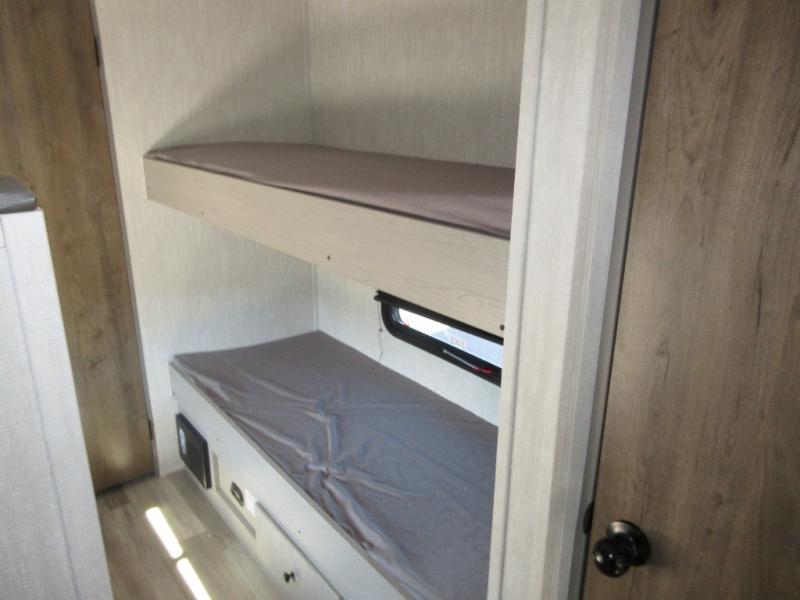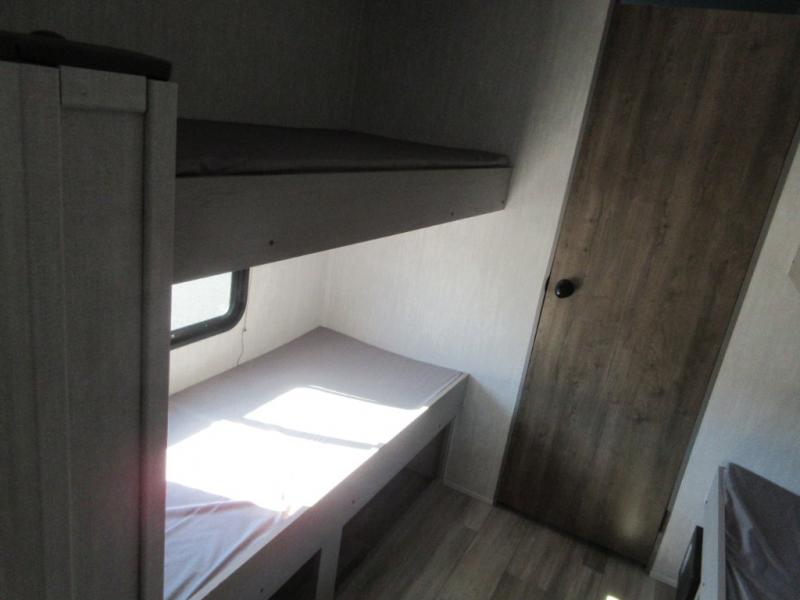 This travel trailer is perfect for a big crowd! Relax to the fullest on the queen bed located in the front bedroom, which also has plenty of space due to its over head cabinet, dual wardrobes and private shelves besides the bed. The quad bunk beds are ideal for kids to take a nap, also the U-shaped dinette is another option to use it as a makeshift bed. Take a long bath on the large rear bathroom, special for pamper yourself in the most comfortable way. This model also includes a 12V refrigerator to keep your food fresh, a 2-burner cooktop and a washer/dryer prep; all the comfort of home on the road!