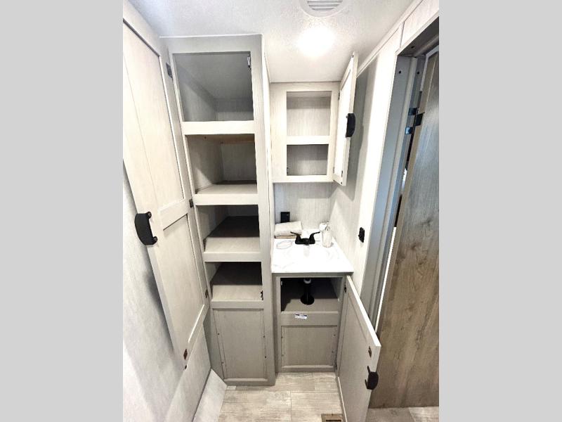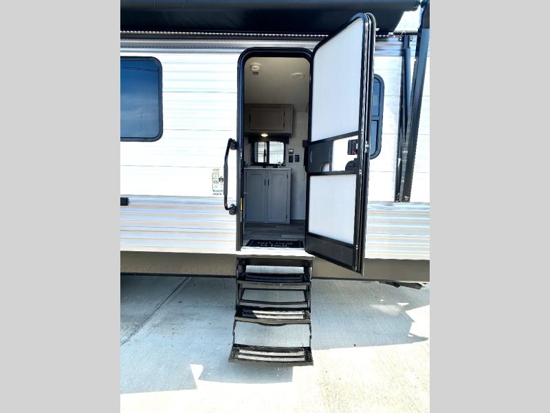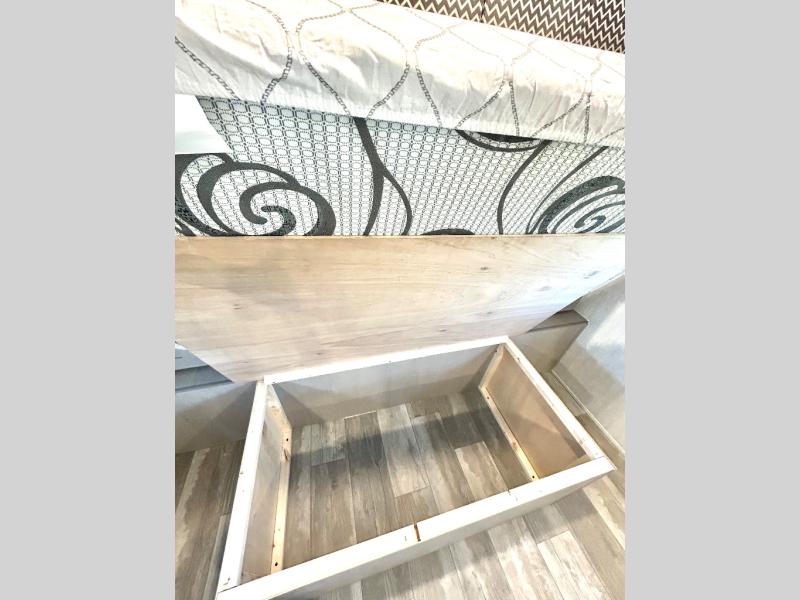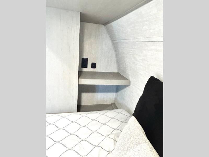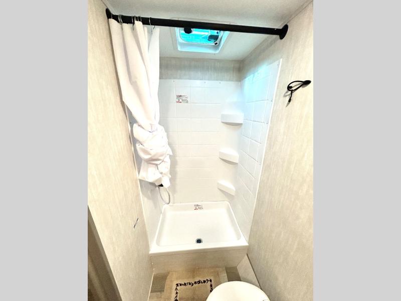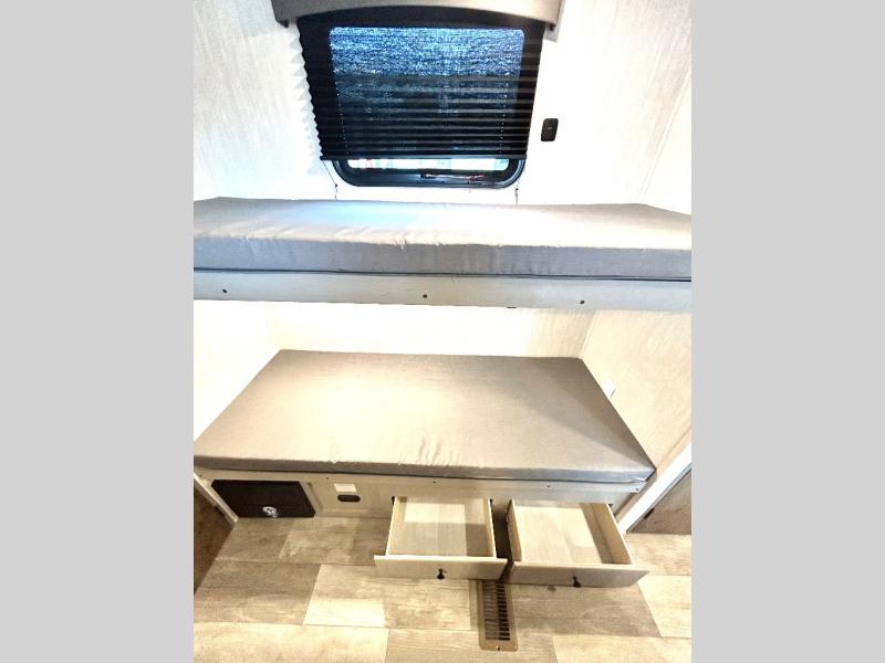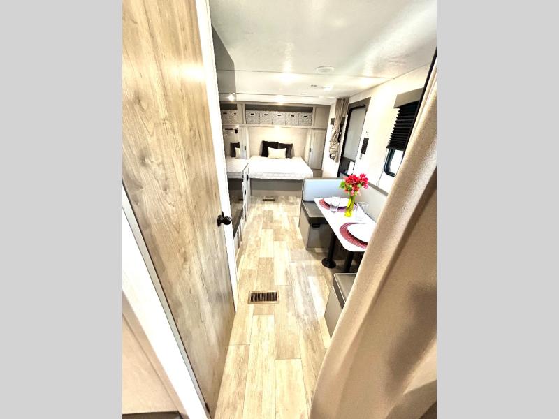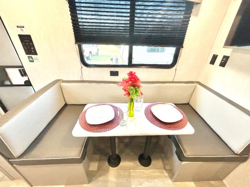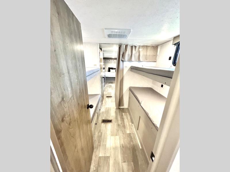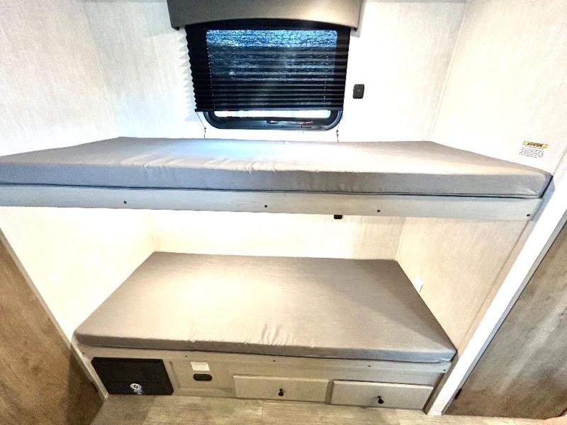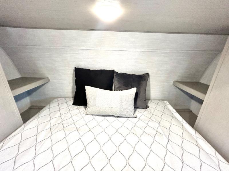 This travel trailer is perfect for a big crowd! Relax to the fullest on the queen bed located in the front bedroom, which also has plenty of space due to its over head cabinet, dual wardrobes and private shelves besides the bed. The quad bunk beds are ideal for kids to take a nap, also the U-shaped dinette is another option to use it as a makeshift bed. Take a long bath on the large rear bathroom, special to pamper yourself in the most comfortable way. This model also includes a 12V refrigerator to keep your food fresh, a 2-burner cooktop and a washer/dryer prep; all the comfort of home on the road!