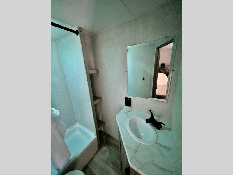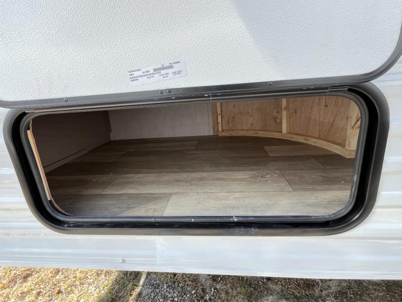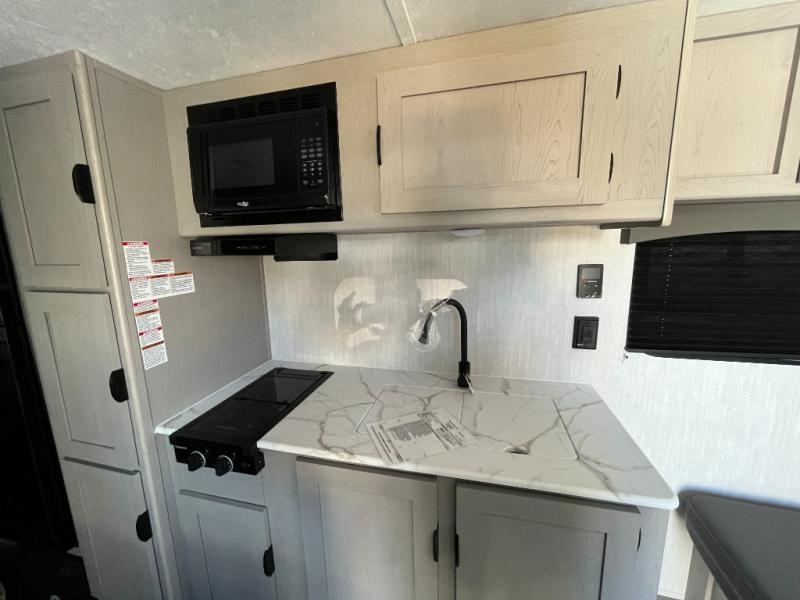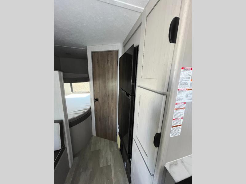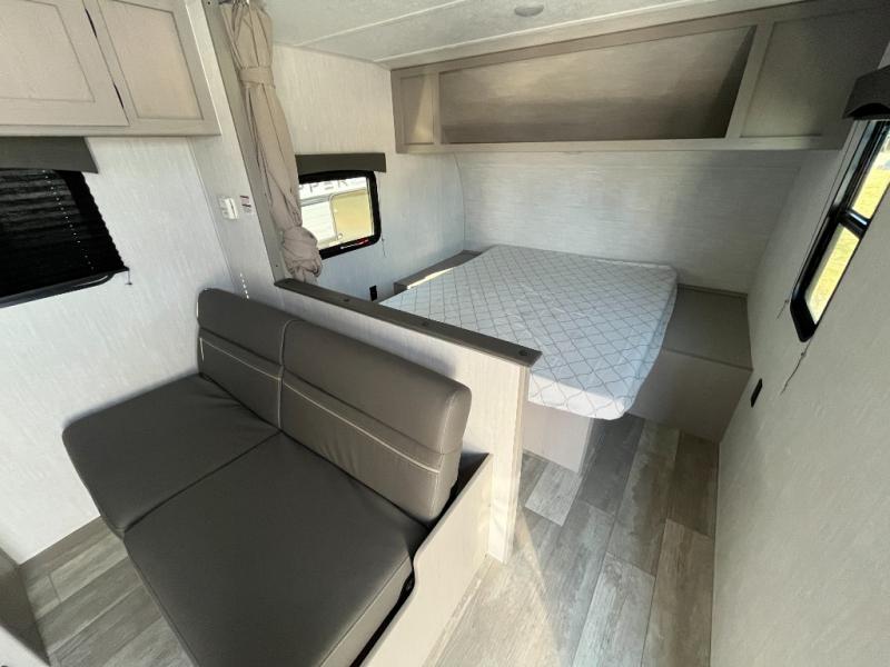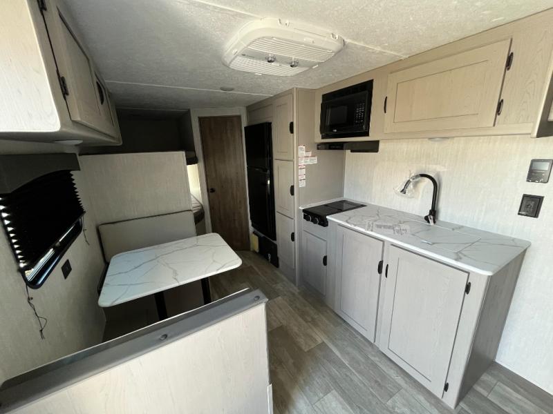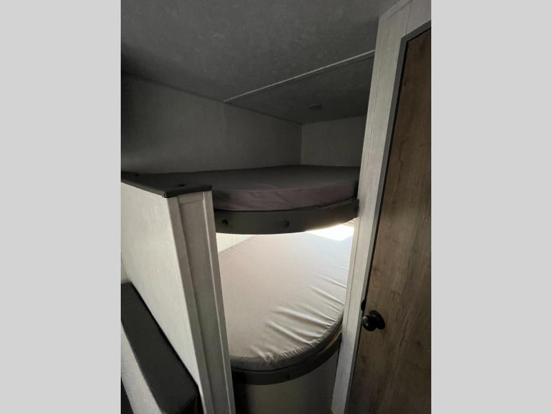 Bring the whole family with you in this travel trailer! The kiddos can sleep on the rear corner set of double bed bunks. The opposite rear corner features a full bath including a 24" x 36" shower, linen cabinet, toilet, and vanity with medicine cabinet overhead. In the main living space you will find plenty of seating with a booth dinette and jackknife sofa which can also transform into an extra sleeping space if needed. Everyone's bellies will stay full with the two burner cooktop, 11 cu. ft. 12-volt refrigerator, and microwave which you can use to pop a bag of popcorn for movie night. You will enjoy the front bedroom for a bit of privacy including a queen bed and large overhead cabinet for your things. On the outside, a large front pass-through for lawn chairs and camp gear. There is more storage beneath the double bed bunks in back and a nice 10' awning to provide protection from the elements when outdoors.