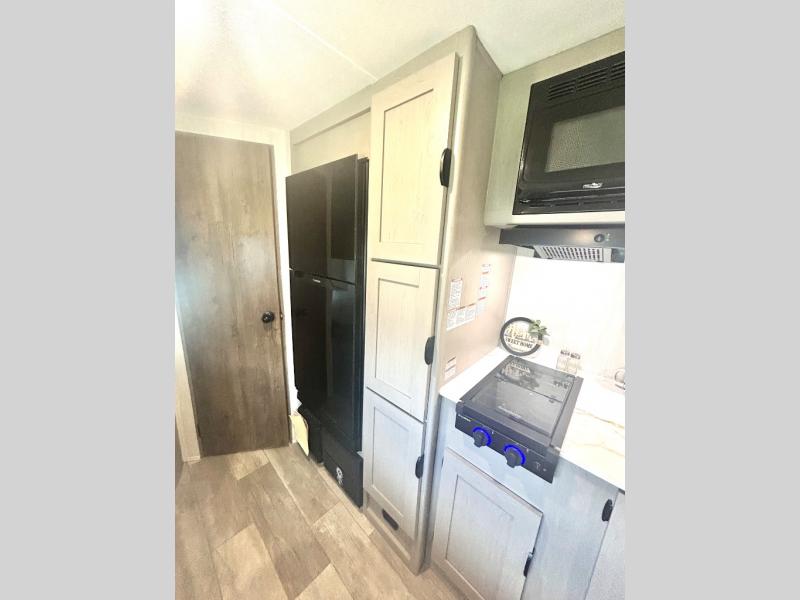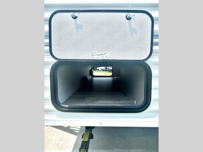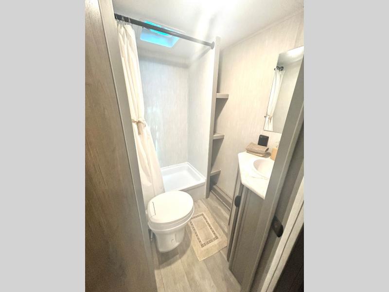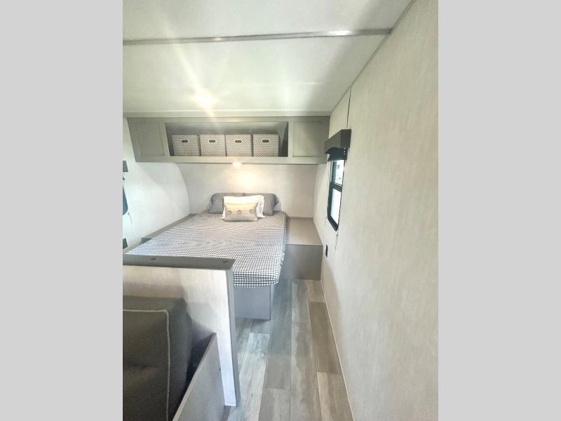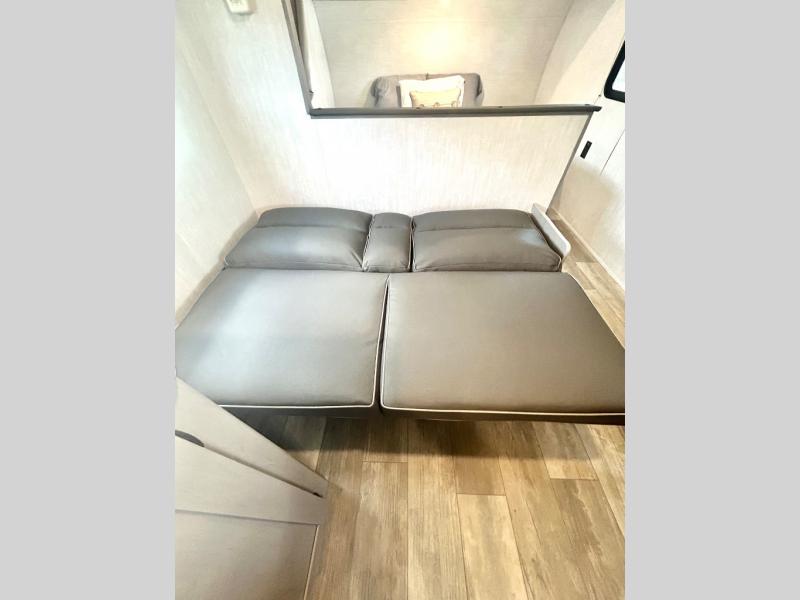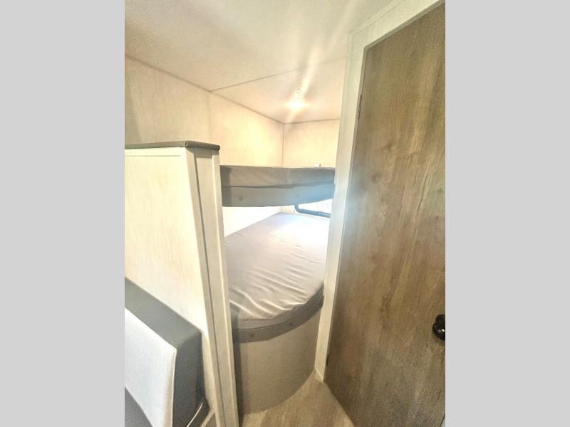 Bring the whole family with you in this travel trailer! The kiddos can sleep on the rear corner set of double-size bunks. The opposite rear corner features a full bath including a 24" x 36" shower, linen cabinet, toilet, and vanity with a medicine cabinet overhead. In the main living space you will find plenty of seating with a booth dinette and jackknife sofa which can also transform into an extra sleeping space if needed. Everyone's bellies will stay full with the two burner cooktop, 12-volt refrigerator, and microwave which you can use to pop a bag of popcorn for movie night. You will enjoy the front bedroom for a bit of privacy including a queen bed and large overhead cabinet for your things. On the outside, a large front pass-through for lawn chairs and camp gear. There is more storage beneath the double bed bunks in back and a nice 10' awning to provide protection from the elements when outdoors.