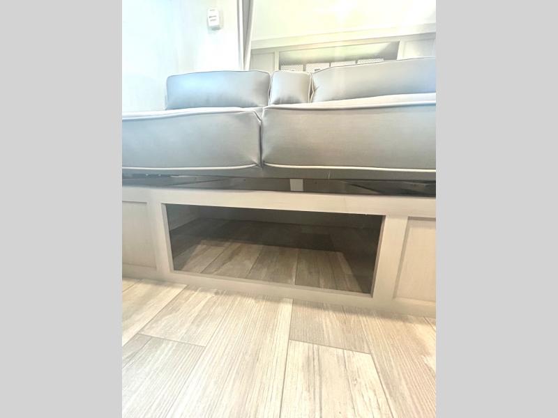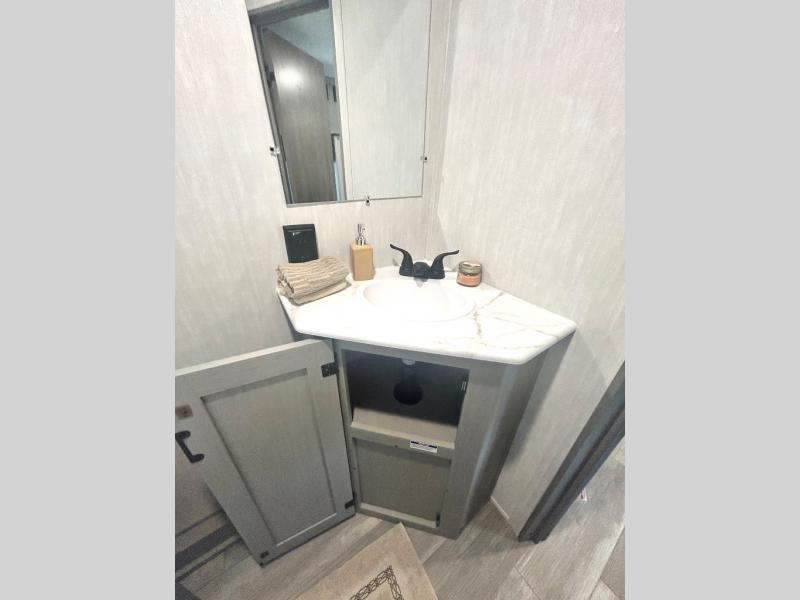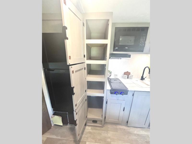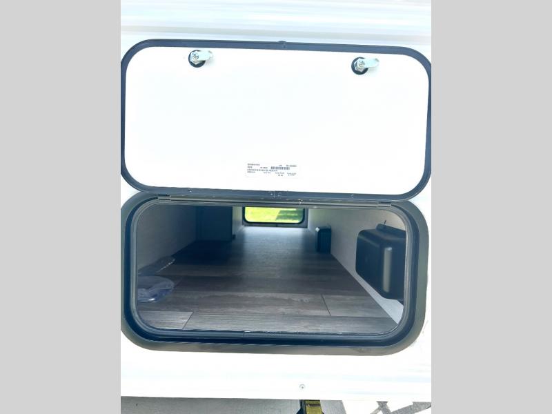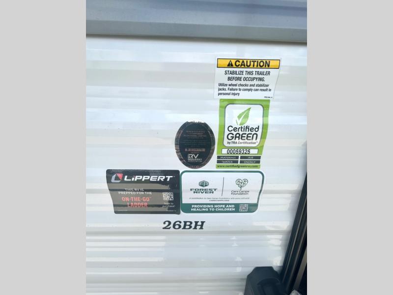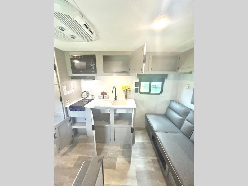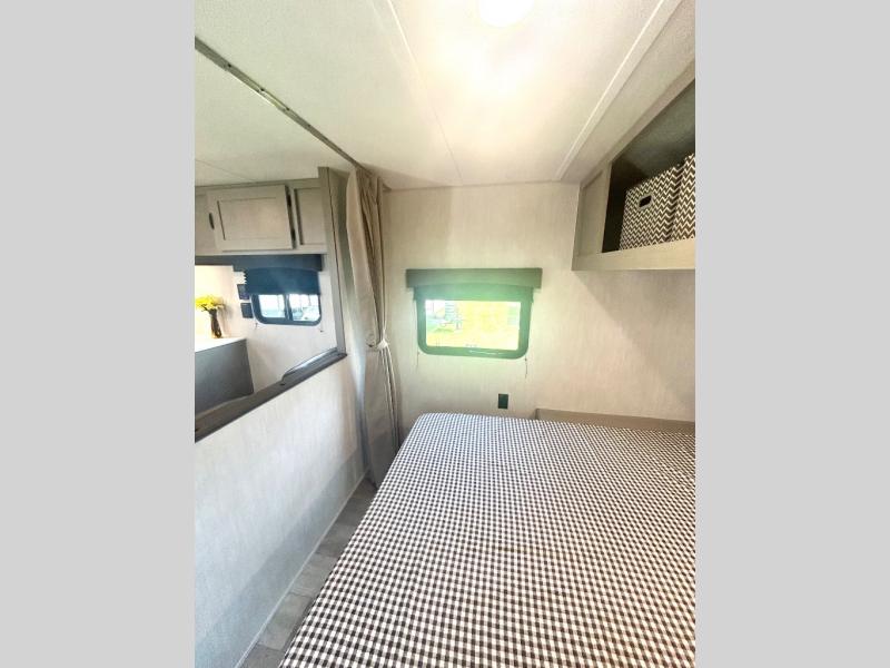 Bring the whole family with you in this travel trailer! The kiddos can sleep on the rear corner set of double-size bunks. The opposite rear corner features a full bath including a 24" x 36" shower, linen cabinet, toilet, and vanity with a medicine cabinet overhead. In the main living space you will find plenty of seating with a booth dinette and jackknife sofa which can also transform into an extra sleeping space if needed. Everyone's bellies will stay full with the two burner cooktop, 12-volt refrigerator, and microwave which you can use to pop a bag of popcorn for movie night. You will enjoy the front bedroom for a bit of privacy including a queen bed and large overhead cabinet for your things. On the outside, a large front pass-through for lawn chairs and camp gear. There is more storage beneath the double bed bunks in back and a nice 10' awning to provide protection from the elements when outdoors.