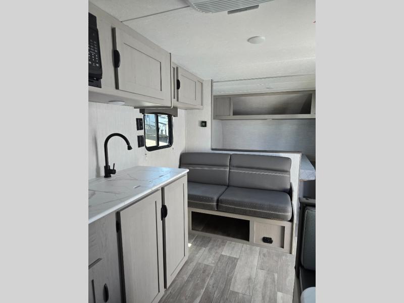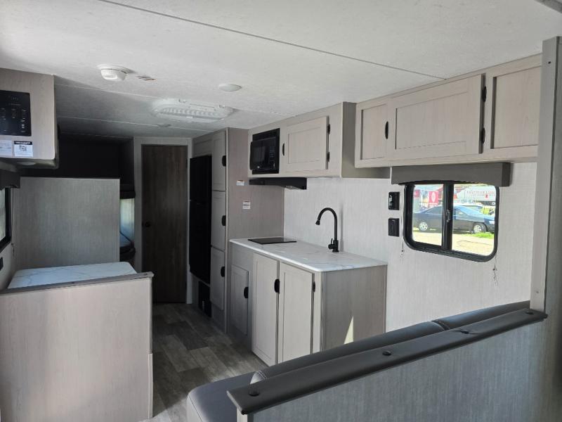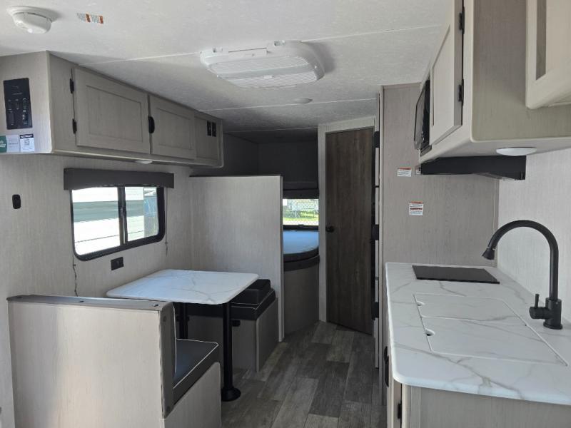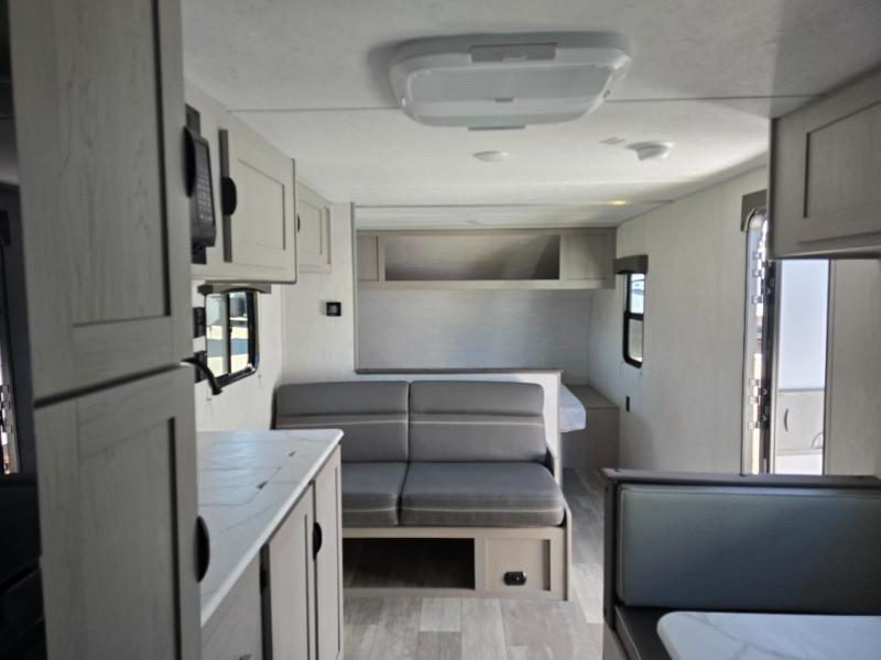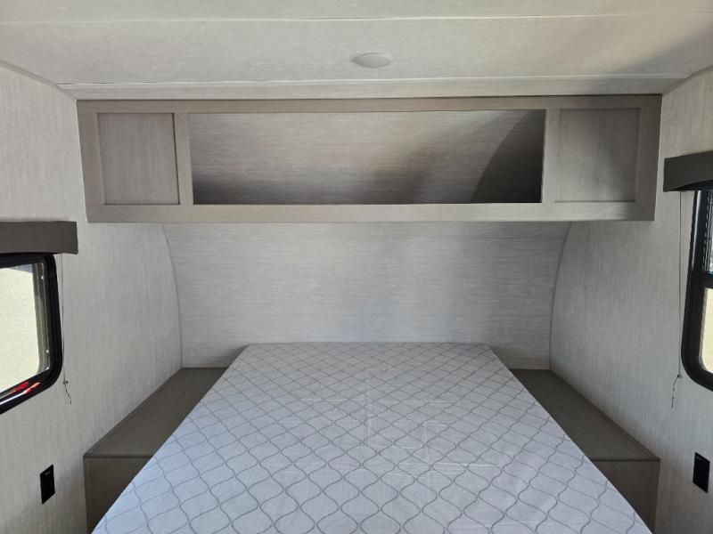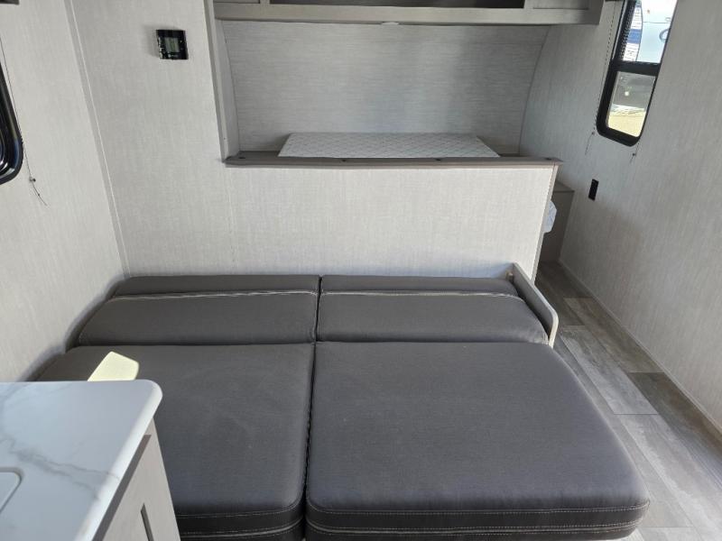 Bring the whole family with you in this travel trailer! The kiddos can sleep on the rear corner set of double-size bunks. The opposite rear corner features a full bath including a 24" x 36" shower, linen cabinet, toilet, and vanity with a medicine cabinet overhead. In the main living space you will find plenty of seating with a booth dinette and jackknife sofa which can also transform into an extra sleeping space if needed. Everyone's bellies will stay full with the two burner cooktop, 12-volt refrigerator, and microwave which you can use to pop a bag of popcorn for movie night. You will enjoy the front bedroom for a bit of privacy including a queen bed and large overhead cabinet for your things. On the outside, a large front pass-through for lawn chairs and camp gear. There is more storage beneath the double bed bunks in back and a nice 10' awning to provide protection from the elements when outdoors.