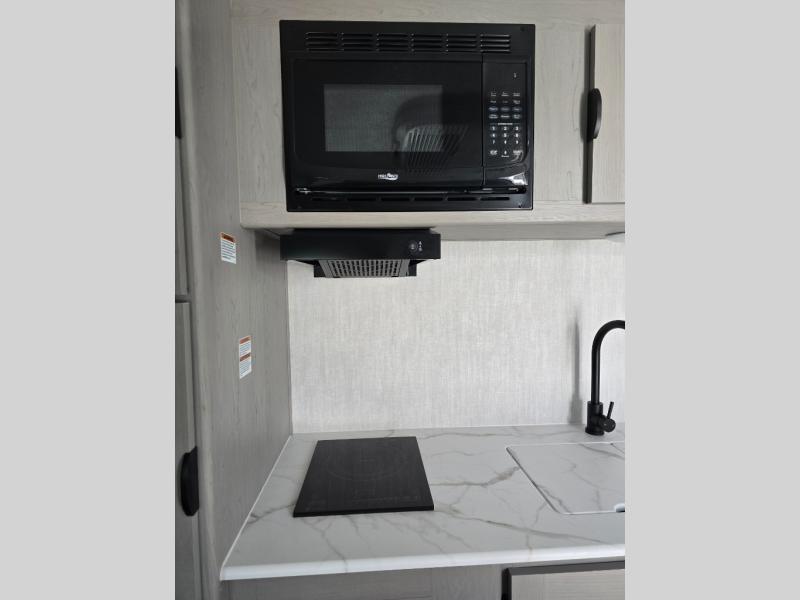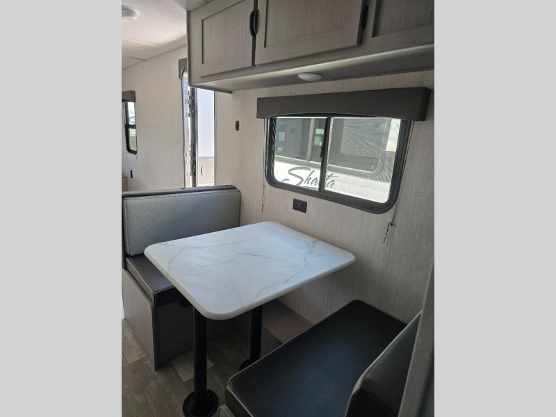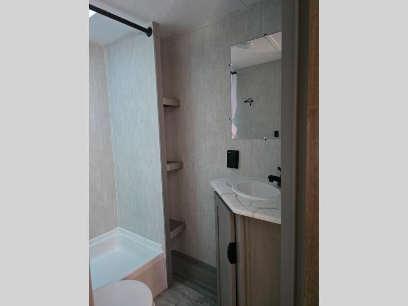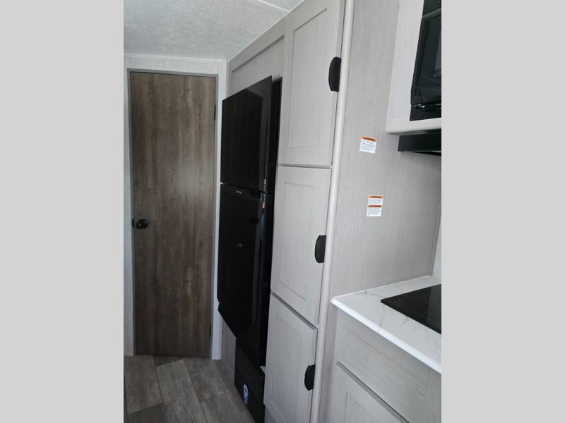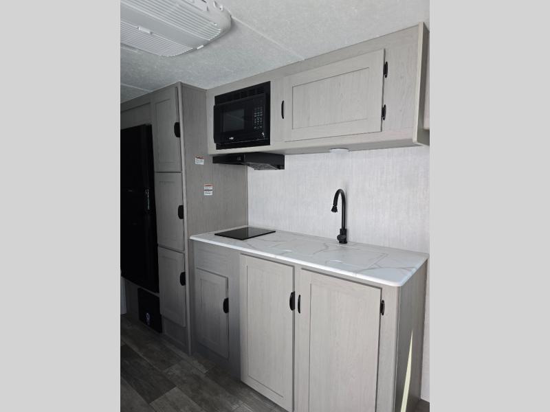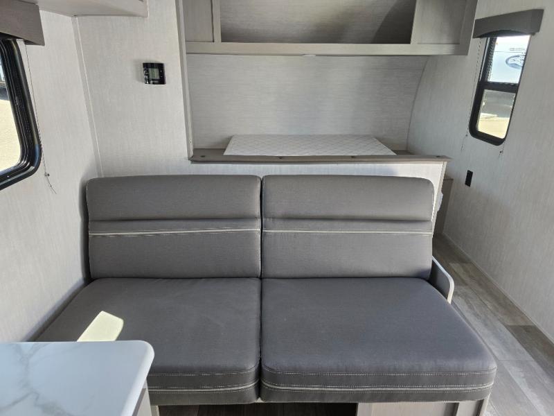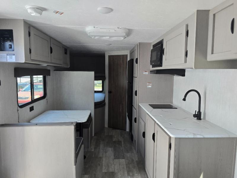 Bring the whole family with you in this travel trailer! The kiddos can sleep on the rear corner set of double-size bunks. The opposite rear corner features a full bath including a 24" x 36" shower, linen cabinet, toilet, and vanity with a medicine cabinet overhead. In the main living space you will find plenty of seating with a booth dinette and jackknife sofa which can also transform into an extra sleeping space if needed. Everyone's bellies will stay full with the two burner cooktop, 12-volt refrigerator, and microwave which you can use to pop a bag of popcorn for movie night. You will enjoy the front bedroom for a bit of privacy including a queen bed and large overhead cabinet for your things. On the outside, a large front pass-through for lawn chairs and camp gear. There is more storage beneath the double bed bunks in back and a nice 10' awning to provide protection from the elements when outdoors.