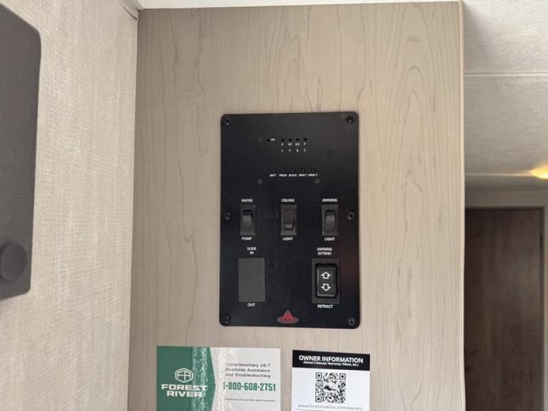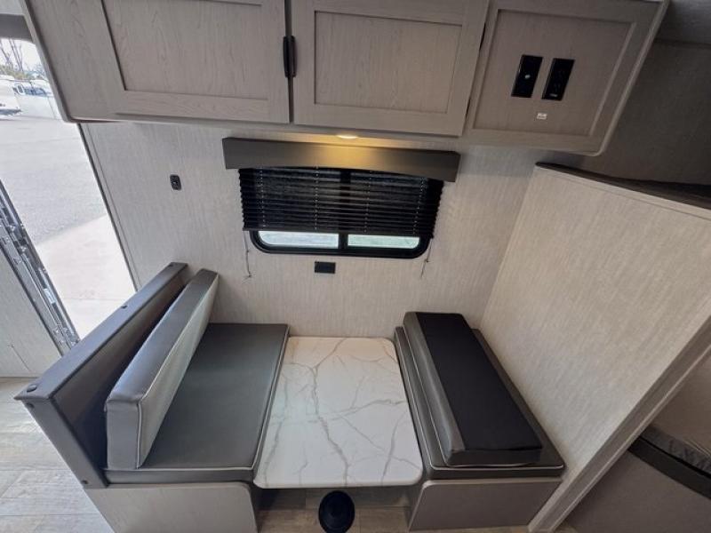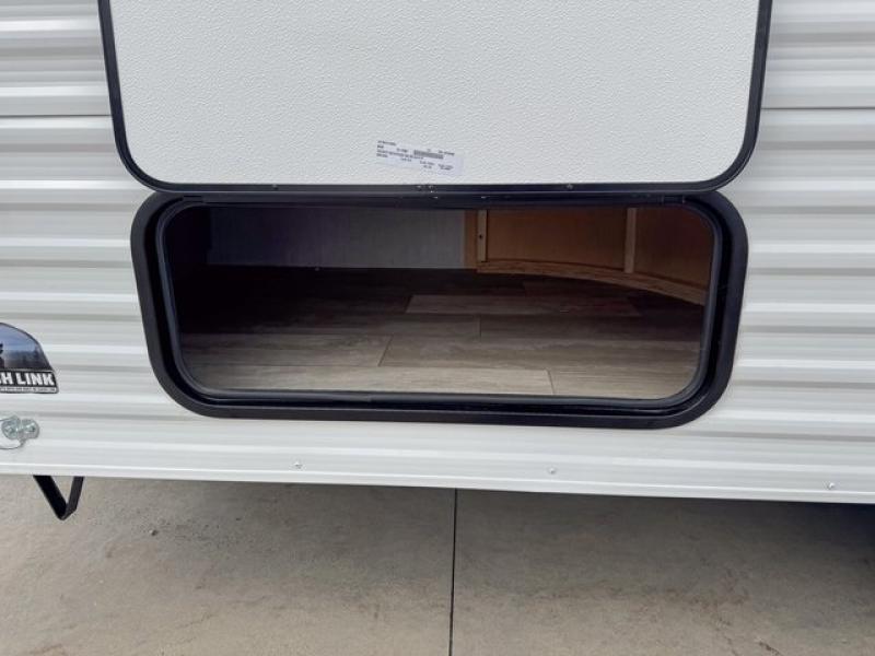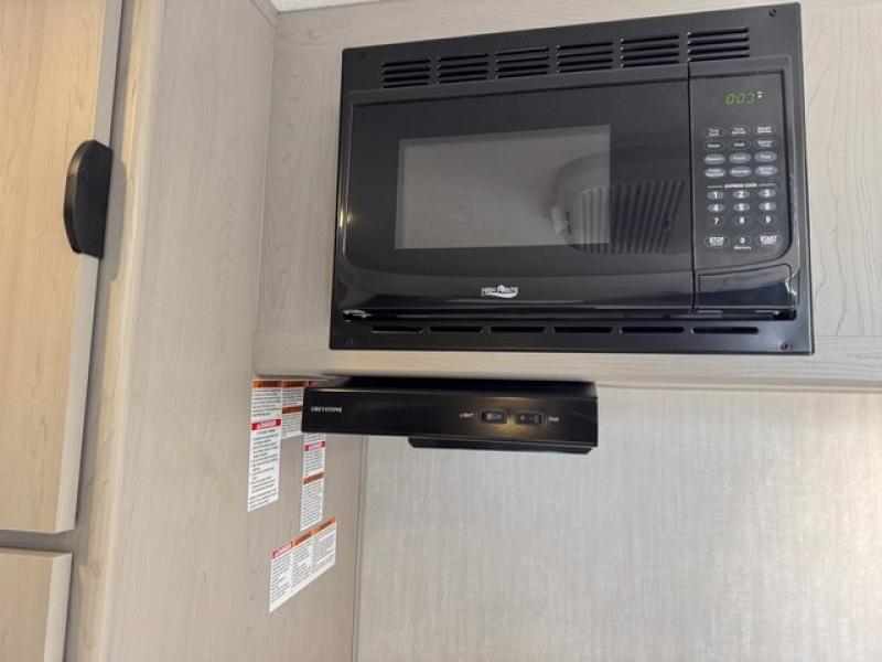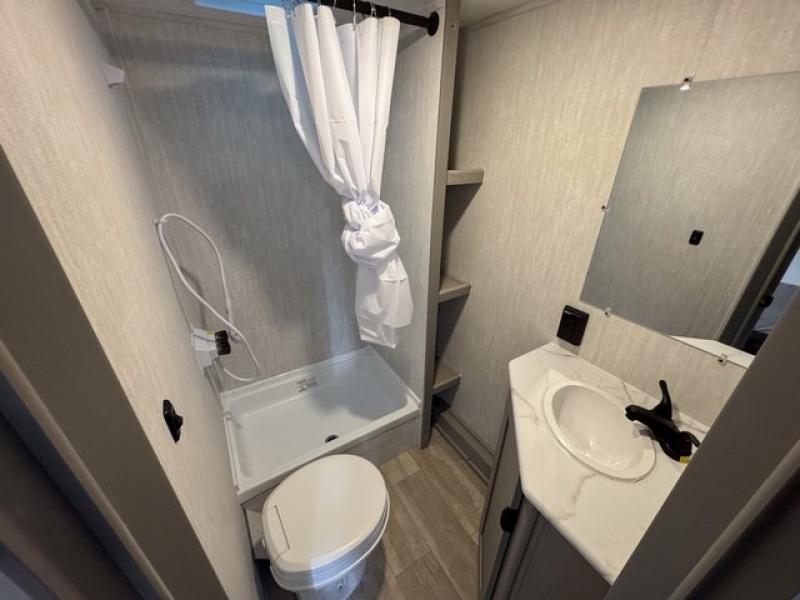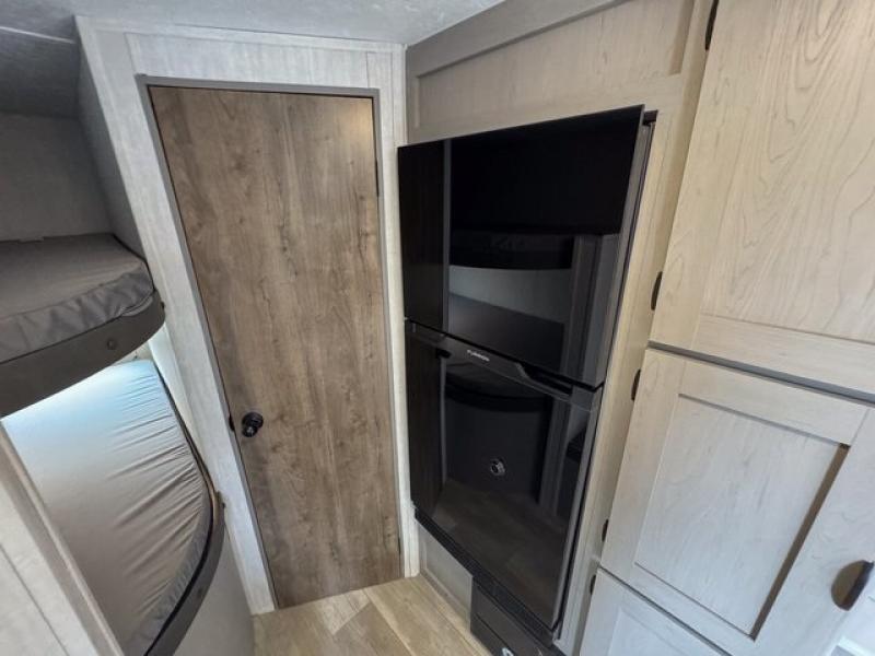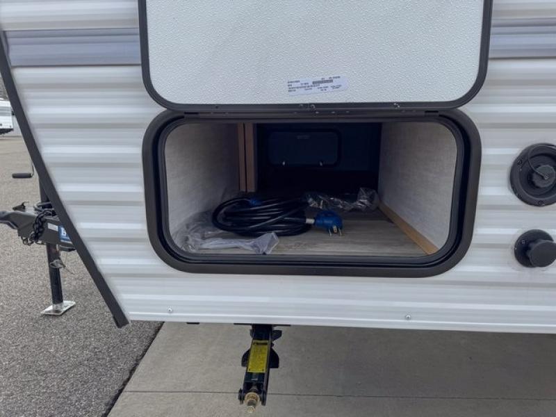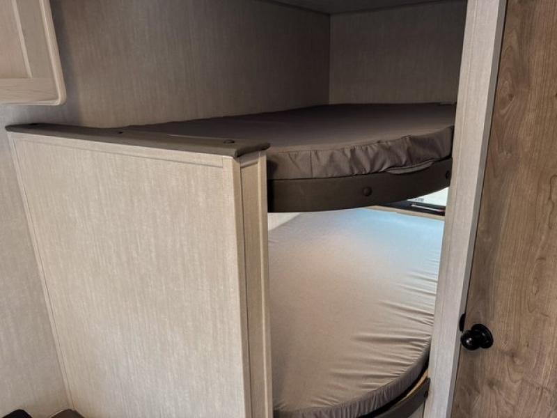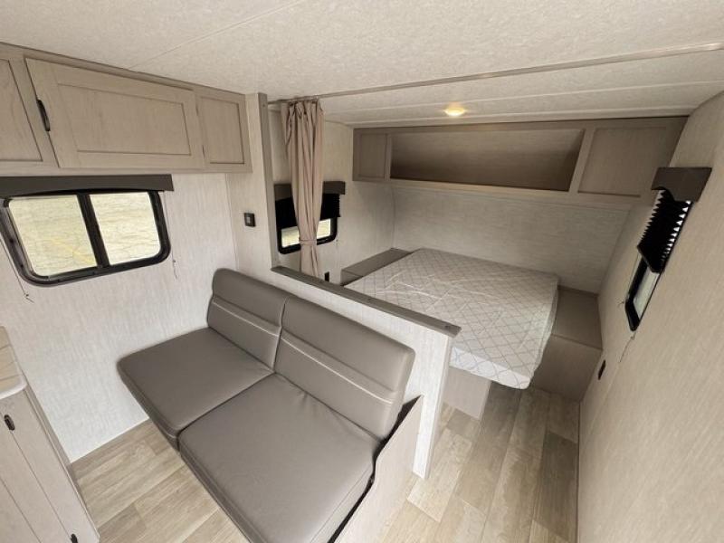 Bring the whole family with you in this travel trailer! The kiddos can sleep on the rear corner set of double-size bunks. The opposite rear corner features a full bath including a 24" x 36" shower, linen cabinet, toilet, and vanity with a medicine cabinet overhead. In the main living space you will find plenty of seating with a booth dinette and jackknife sofa which can also transform into an extra sleeping space if needed. Everyone's bellies will stay full with the two burner cooktop, 12-volt refrigerator, and microwave which you can use to pop a bag of popcorn for movie night. You will enjoy the front bedroom for a bit of privacy including a queen bed and large overhead cabinet for your things. On the outside, a large front pass-through for lawn chairs and camp gear. There is more storage beneath the double bed bunks in back and a nice 10' awning to provide protection from the elements when outdoors.