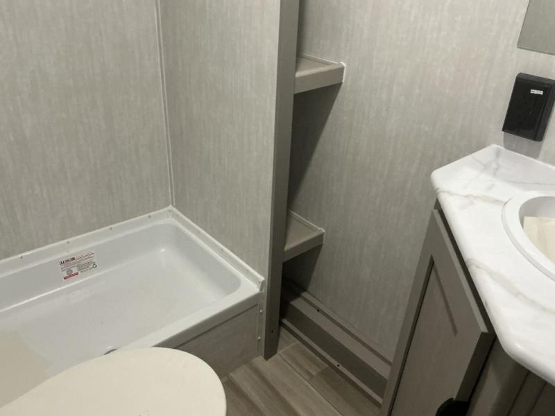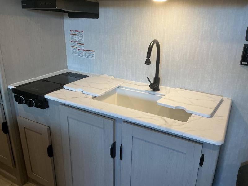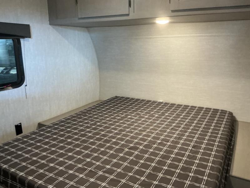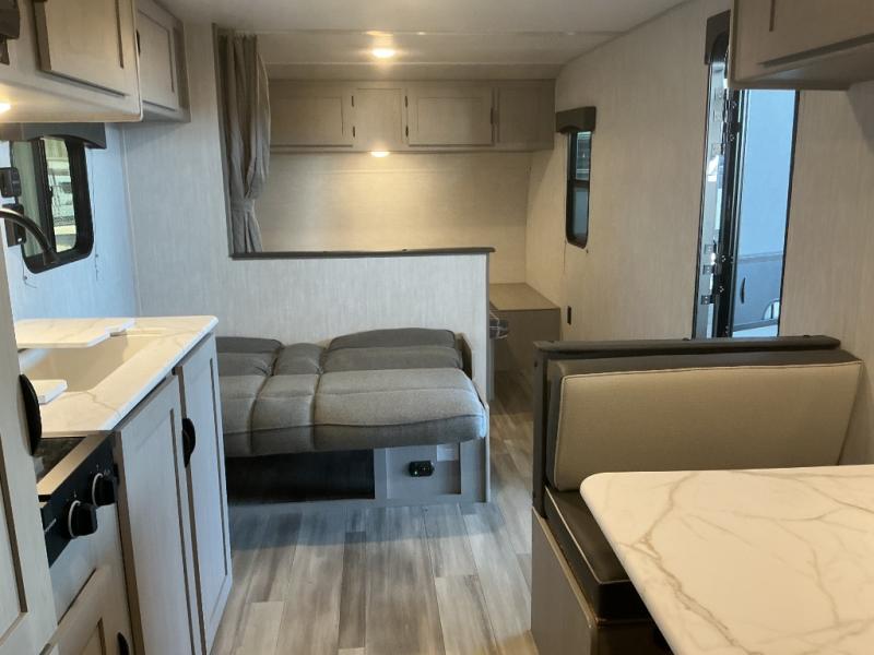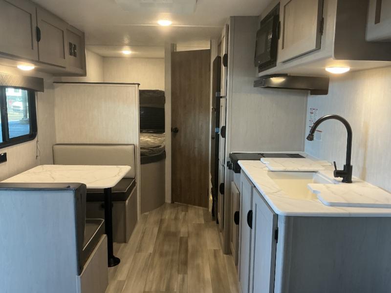 Bring the whole family with you in this travel trailer! The kiddos can sleep on the rear corner set of double-size bunks. The opposite rear corner features a full bath including a 24" x 36" shower, linen cabinet, toilet, and vanity with a medicine cabinet overhead. In the main living space you will find plenty of seating with a booth dinette and jackknife sofa which can also transform into an extra sleeping space if needed. Everyone's bellies will stay full with the two burner cooktop, 12-volt refrigerator, and microwave which you can use to pop a bag of popcorn for movie night. You will enjoy the front bedroom for a bit of privacy including a queen bed and large overhead cabinet for your things. On the outside, a large front pass-through for lawn chairs and camp gear. There is more storage beneath the double bed bunks in back and a nice 10' awning to provide protection from the elements when outdoors.