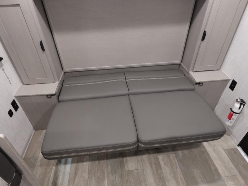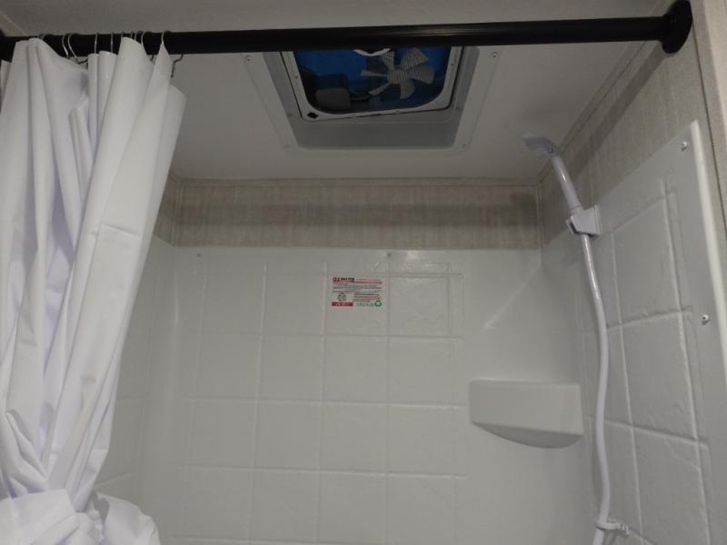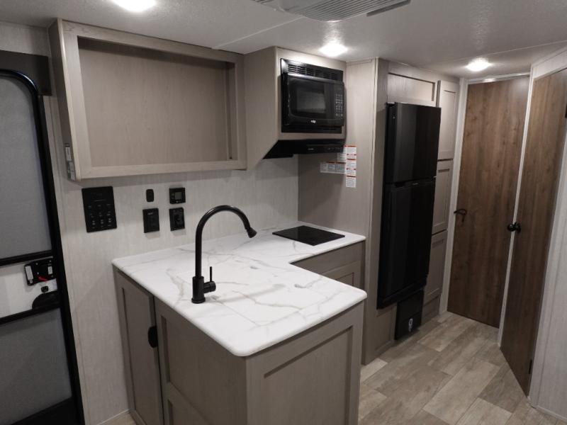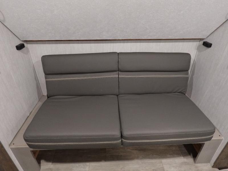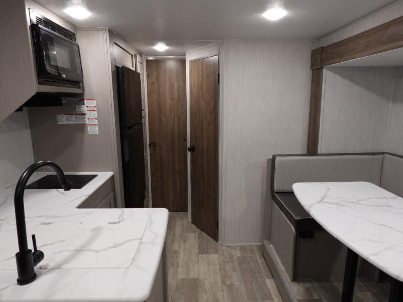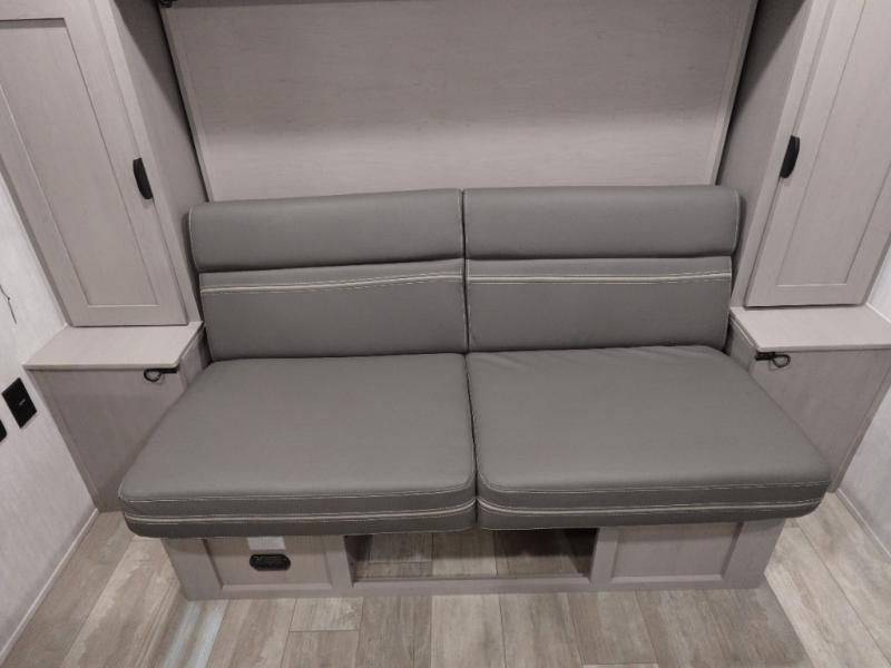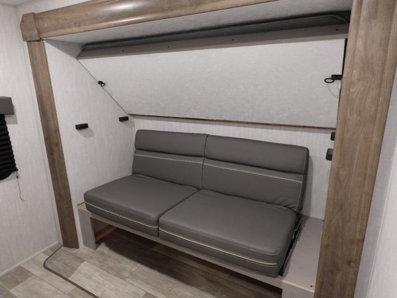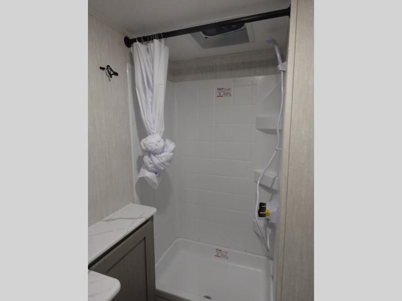 This versatile travel trailer is the perfect choice if you plan to camp with friends and family. The Murphy bed can be folded up during the day so you can relax on the jack knife sofa, and there is also a U-shaped dinette for dining space and game night. The rear corner den includes a second jack knife sofa within a slide out for more space plus a countertop where you can keep your drinks off of the floor. A full kitchen, complete with a three burner cooktop, microwave and 12V refrigerator will let you cook and store food. And don't overlook the full bath with a vanity with a sink, a toilet, and a 24" x 36" shower. There is even storage for clean towels and toiletries!