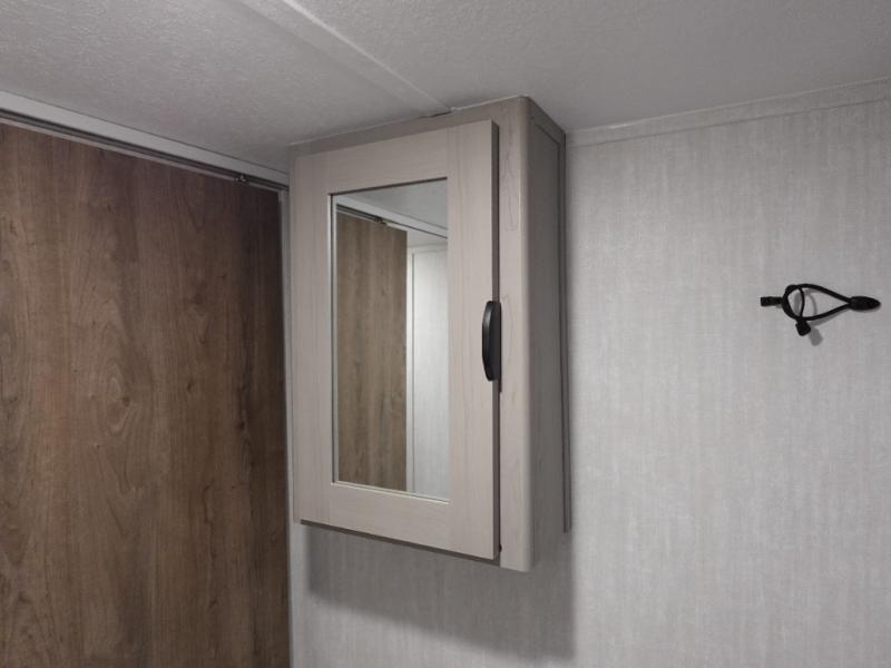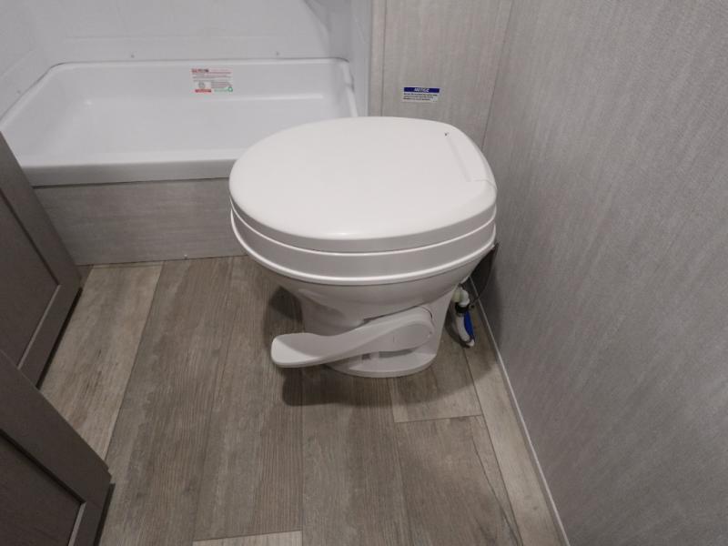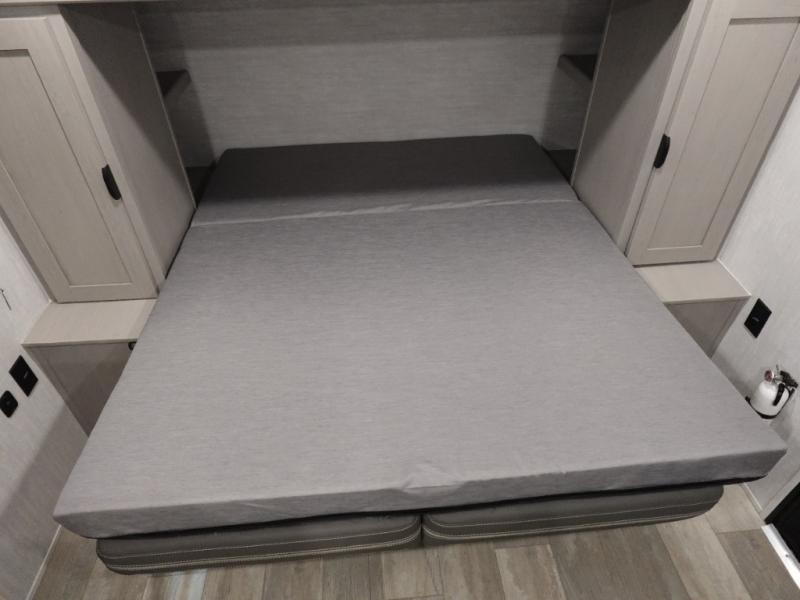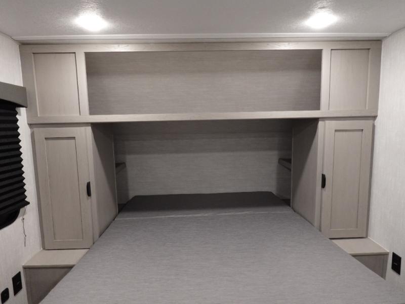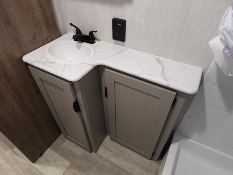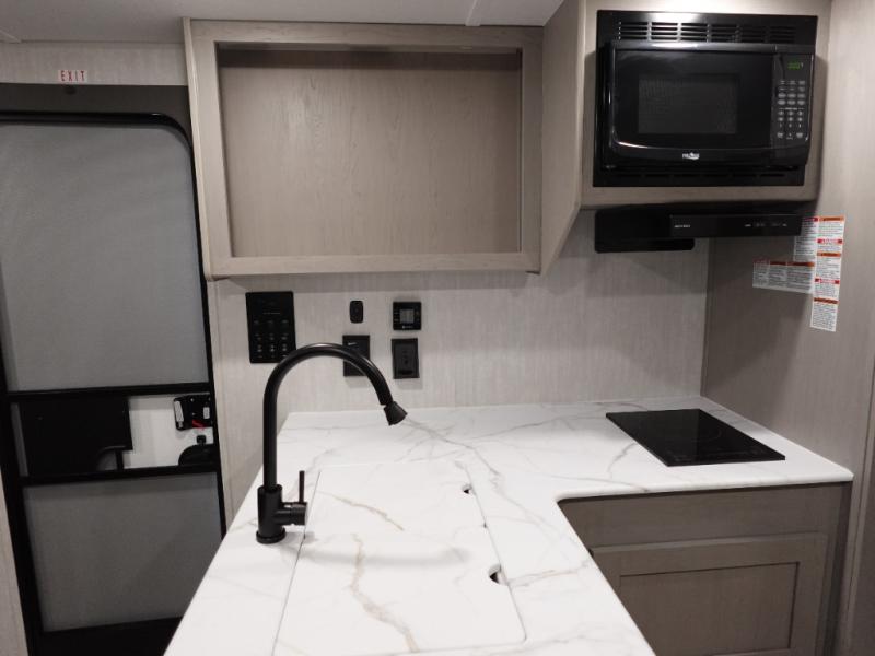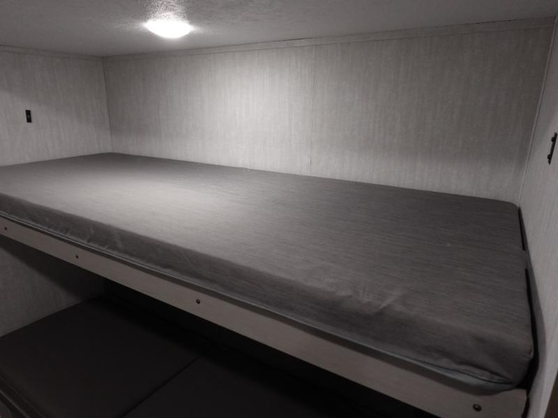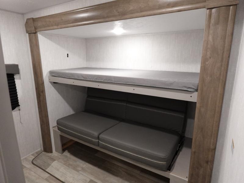 This versatile travel trailer is the perfect choice if you plan to camp with friends and family. The Murphy bed can be folded up during the day so you can relax on the jack knife sofa, and there is also a U-shaped dinette for dining space and game night. The rear corner den includes a second jack knife sofa within a slide out for more space plus a countertop where you can keep your drinks off of the floor. A full kitchen, complete with a three burner cooktop, microwave and 12V refrigerator will let you cook and store food. And don't overlook the full bath with a vanity with a sink, a toilet, and a 24" x 36" shower. There is even storage for clean towels and toiletries!