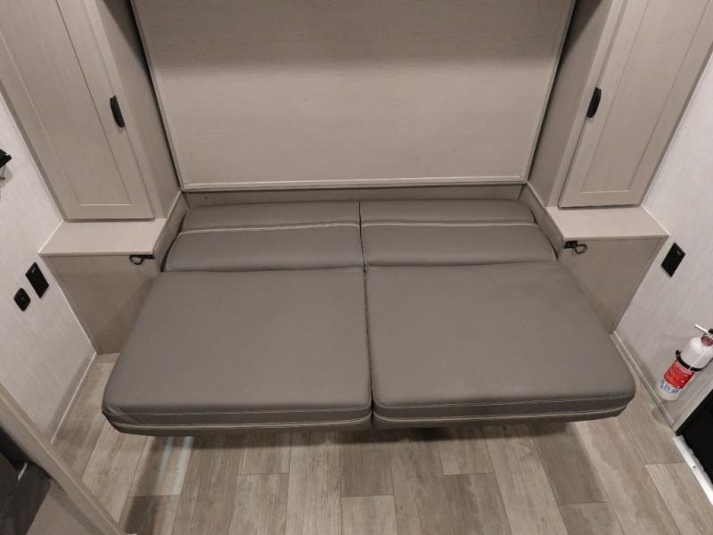 This versatile travel trailer is the perfect choice if you plan to camp with friends and family. The Murphy bed can be folded up during the day so you can relax on the jack knife sofa, and there is also a U-shaped dinette for dining space and game night. The rear corner den includes a second jack knife sofa within a slide out for more space plus a countertop where you can keep your drinks off of the floor. A full kitchen, complete with a three burner cooktop, microwave and 12V refrigerator will let you cook and store food. And don't overlook the full bath with a vanity with a sink, a toilet, and a 24" x 36" shower. There is even storage for clean towels and toiletries!