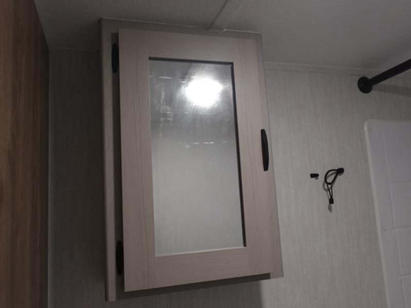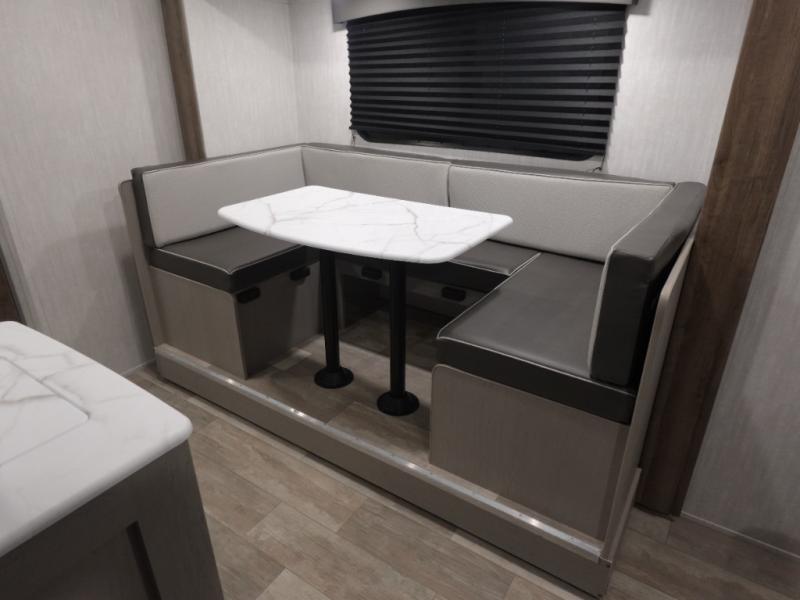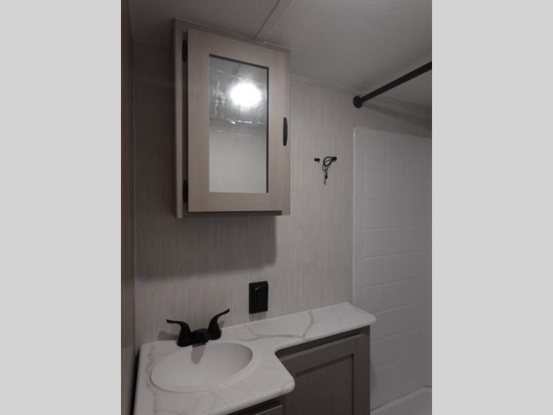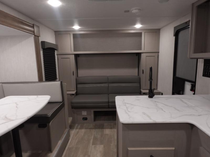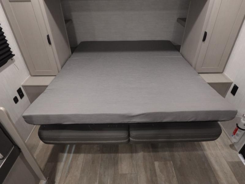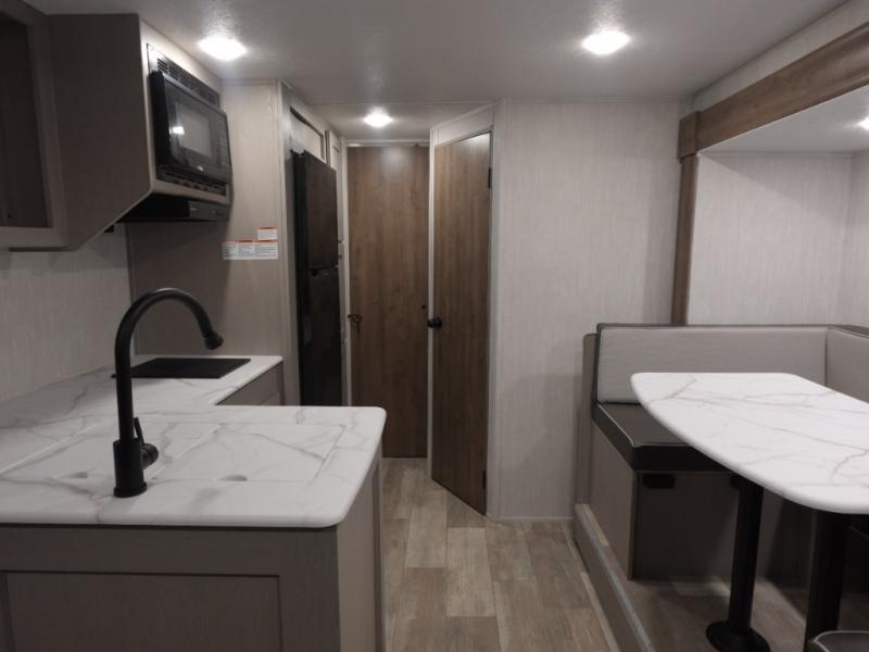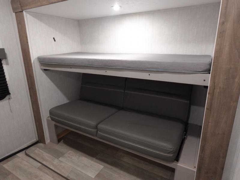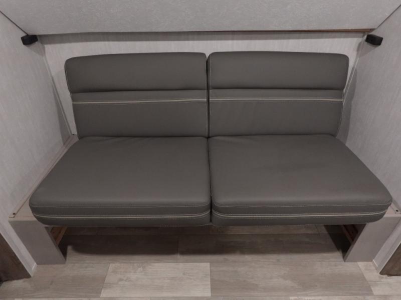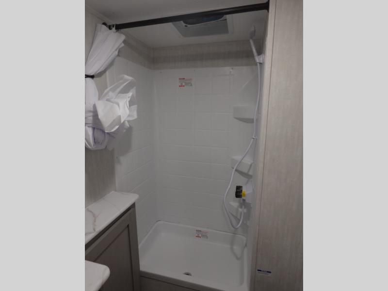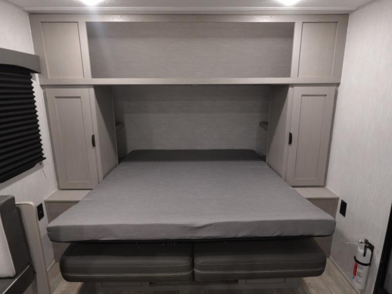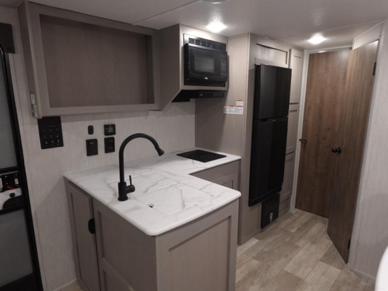 This versatile travel trailer is the perfect choice if you plan to camp with friends and family. The Murphy bed can be folded up during the day so you can relax on the jack knife sofa, and there is also a U-shaped dinette for dining space and game night. The rear corner den includes a second jack knife sofa within a slide out for more space plus a countertop where you can keep your drinks off of the floor. A full kitchen, complete with a three burner cooktop, microwave and 12V refrigerator will let you cook and store food. And don't overlook the full bath with a vanity with a sink, a toilet, and a 24" x 36" shower. There is even storage for clean towels and toiletries!