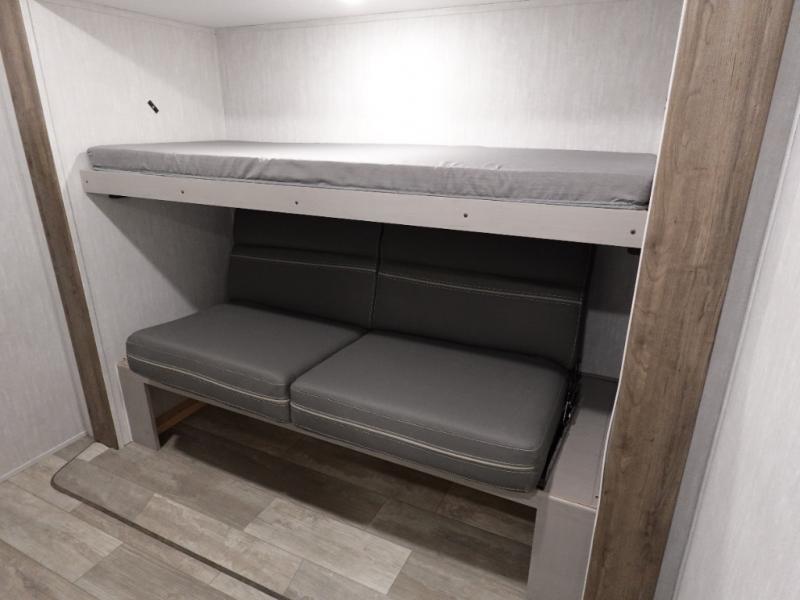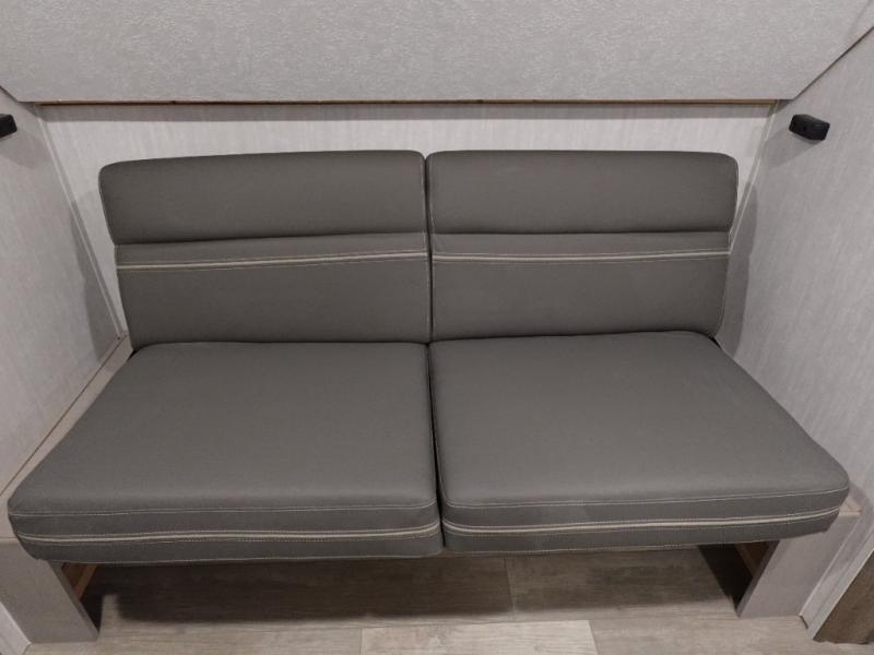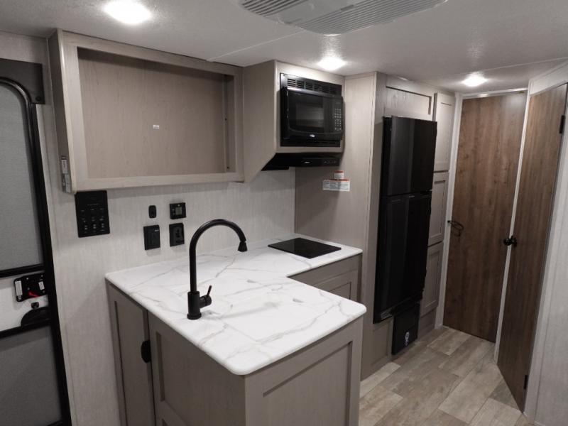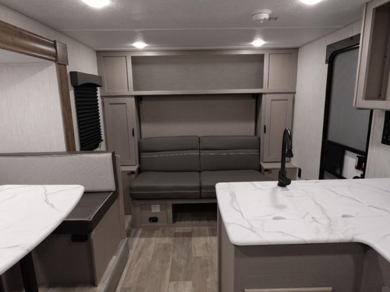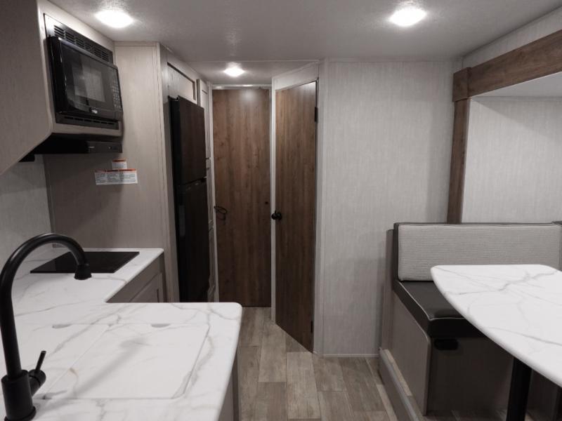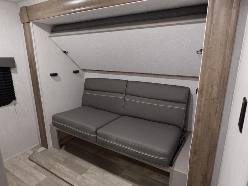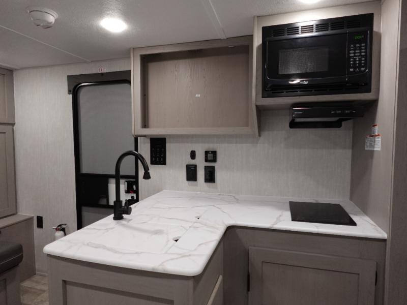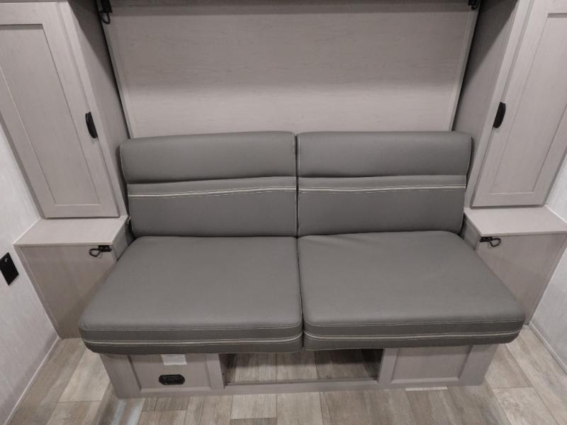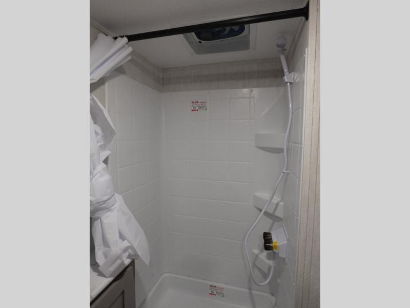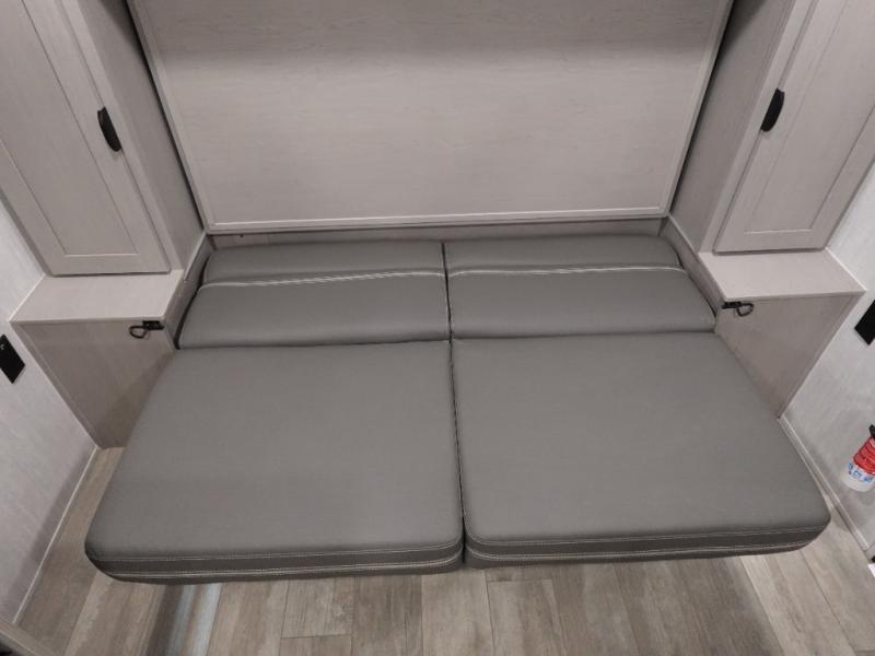This versatile travel trailer is the perfect choice if you plan to camp with friends and family. The Murphy bed can be folded up during the day so you can relax on the jack knife sofa, and there is also a U-shaped dinette for dining space and game night. The rear corner den includes a second jack knife sofa within a slide out for more space plus a countertop where you can keep your drinks off of the floor. A full kitchen, complete with a three burner cooktop, microwave and 12V refrigerator will let you cook and store food. And don't overlook the full bath with a vanity with a sink, a toilet, and a 24" x 36" shower. There is even storage for clean towels and toiletries!