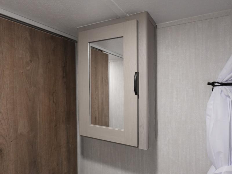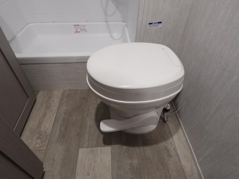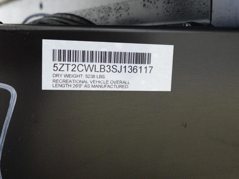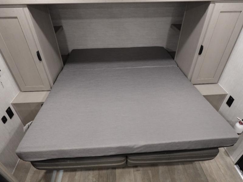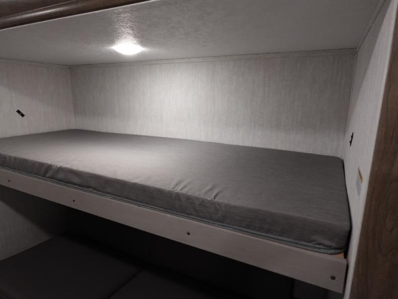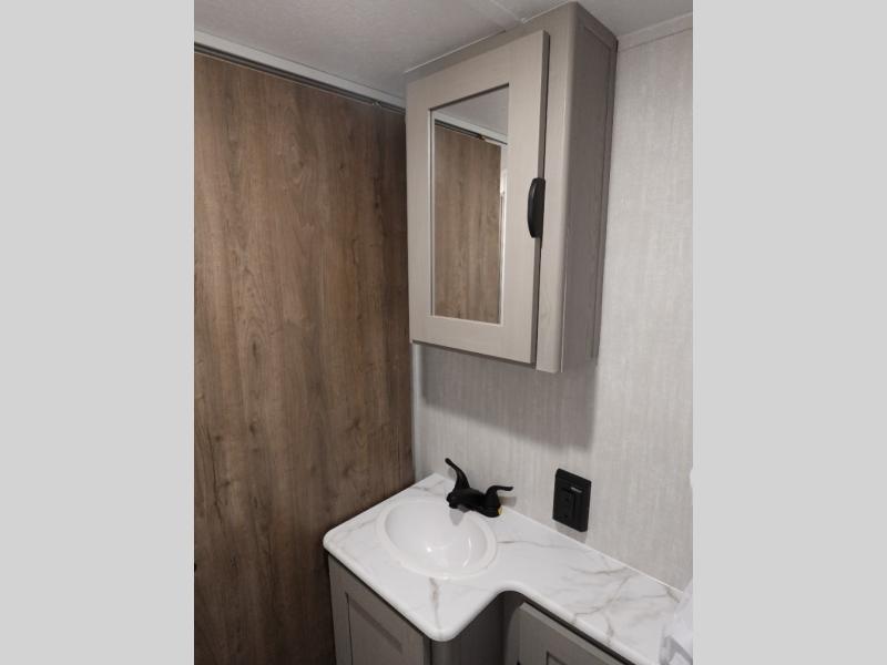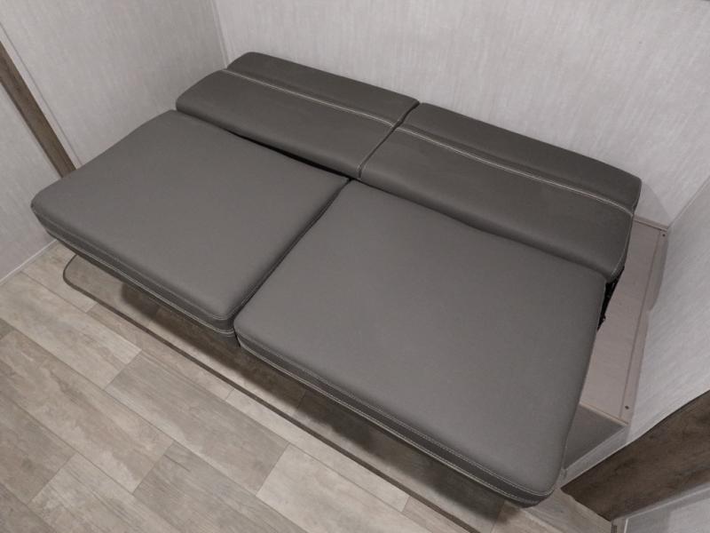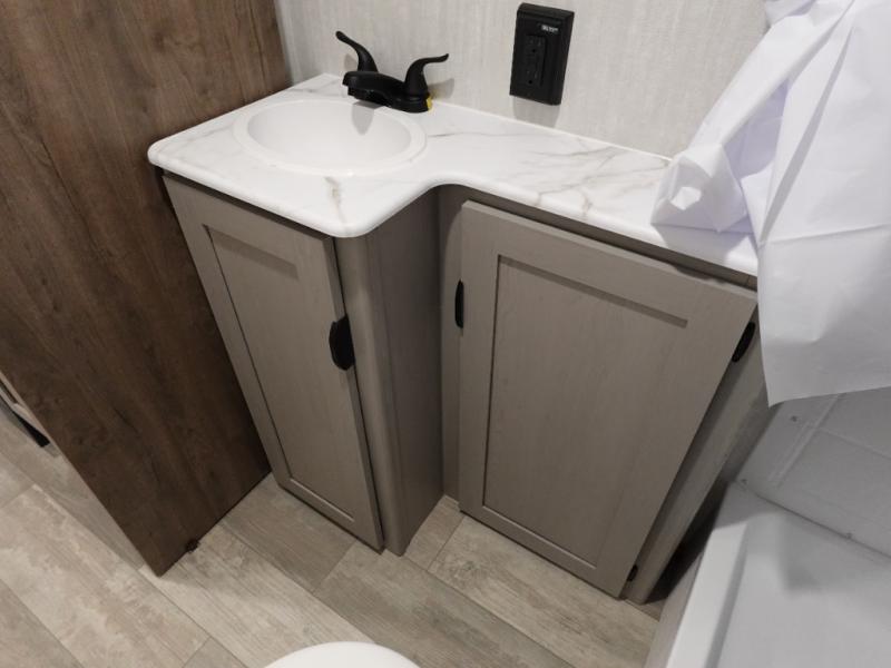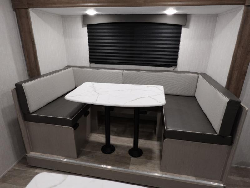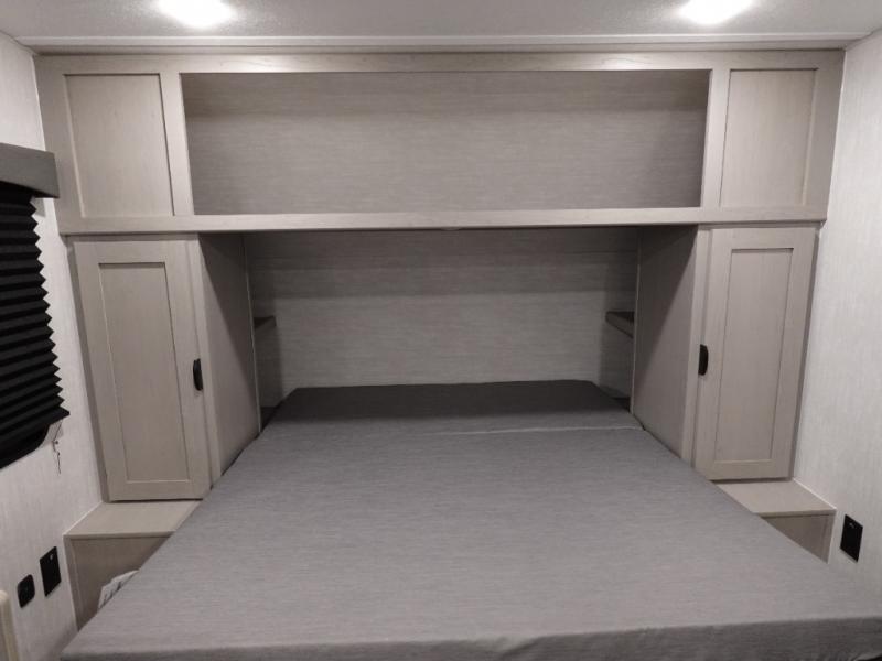 This versatile travel trailer is the perfect choice if you plan to camp with friends and family. The Murphy bed can be folded up during the day so you can relax on the jack knife sofa, and there is also a U-shaped dinette for dining space and game night. The rear corner den includes a second jack knife sofa within a slide out for more space plus a countertop where you can keep your drinks off of the floor. A full kitchen, complete with a three burner cooktop, microwave and 12V refrigerator will let you cook and store food. And don't overlook the full bath with a vanity with a sink, a toilet, and a 24" x 36" shower. There is even storage for clean towels and toiletries!