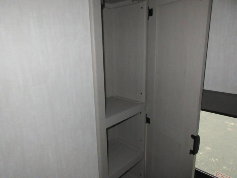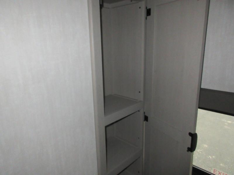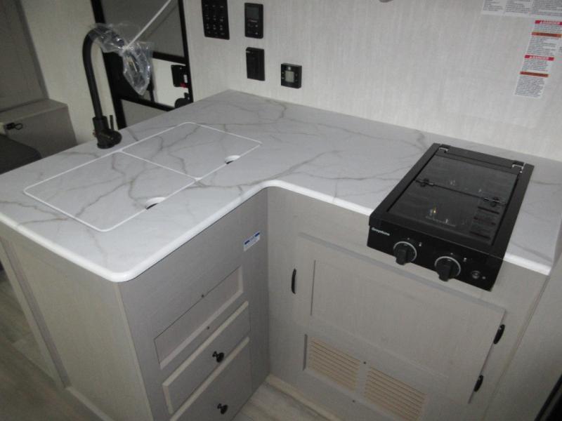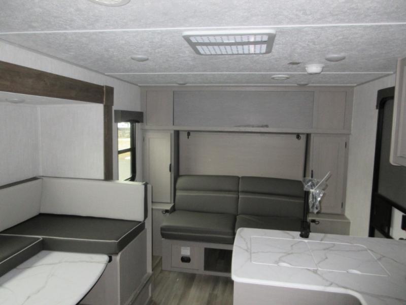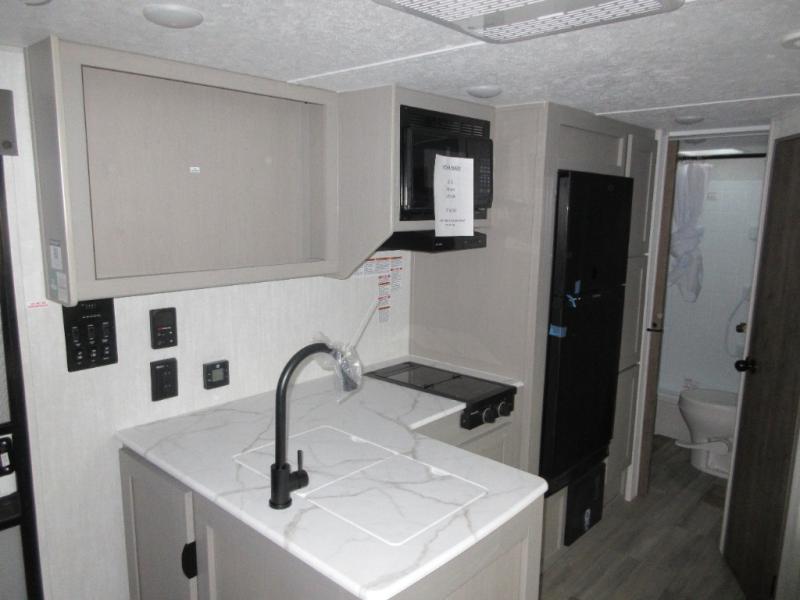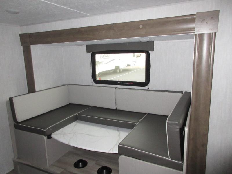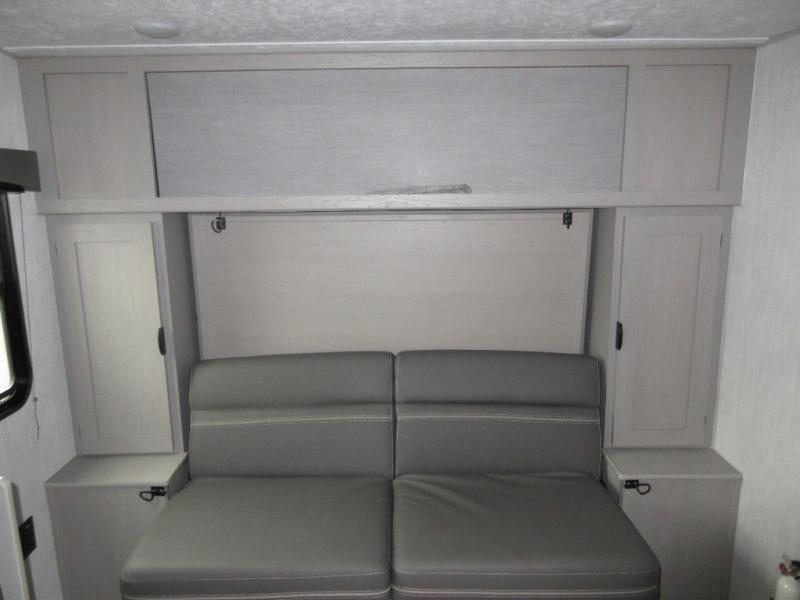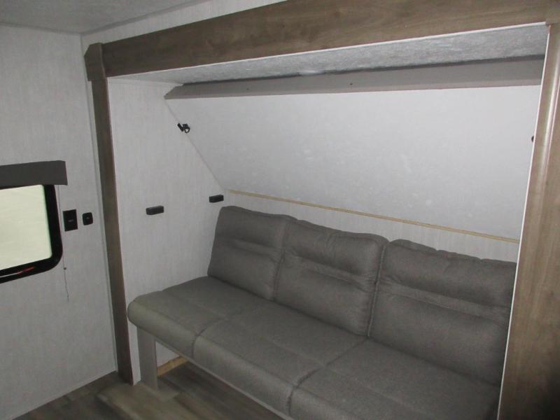 This versatile travel trailer is the perfect choice if you plan to camp with friends and family. The Murphy bed can be folded up during the day so you can relax on the jack knife sofa, and there is also a U-shaped dinette for dining space and game night. The rear corner den includes a second jack knife sofa within a slide out for more space plus a countertop where you can keep your drinks off of the floor. A full kitchen, complete with a three burner cooktop, microwave and 12V refrigerator will let you cook and store food. And don't overlook the full bath with a vanity with a sink, a toilet, and a 24" x 36" shower. There is even storage for clean towels and toiletries!
