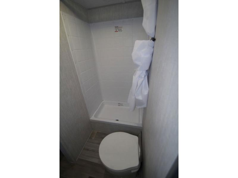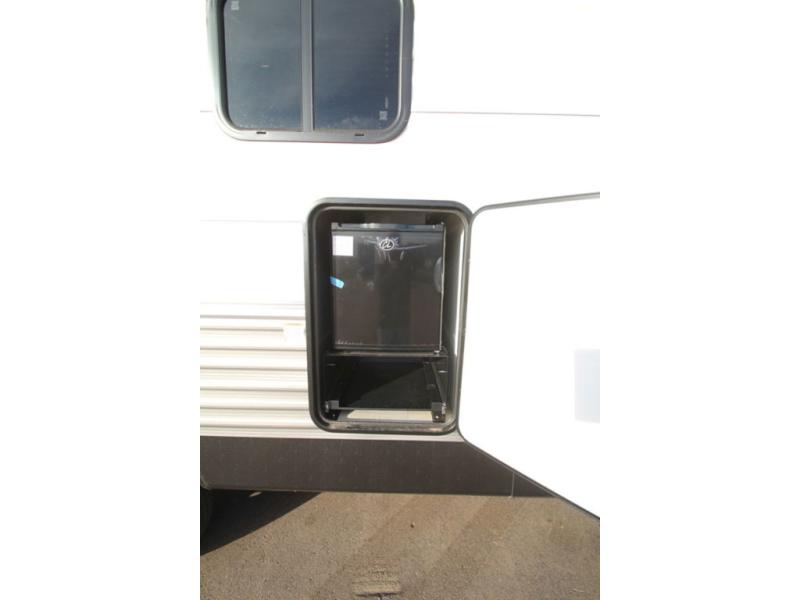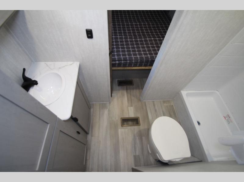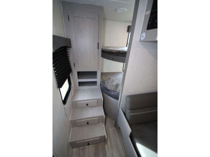 You won't believe all that this travel trailer has to offer! Starting with the front private bedroom including a 60" x 74" RV queen bed that has wardrobes on either side, one of the dual entry doors to the unit, and an entrance into the walk-thru bathroom which features a tub/shower to freshen up in each morning. The chef can prepare their best meals using the three burner cooktop and microwave oven, or if they can head outside to cook on the exterior camp kitchen if the weather is nice. You can enjoy your meals together at the U-shaped dinette and then play cards or a board game. There is also a sofa to relax on, and the kids will love the steps up to a double bed set of bunks!