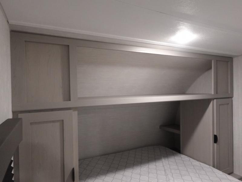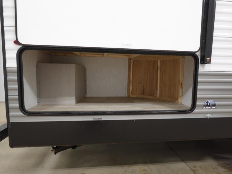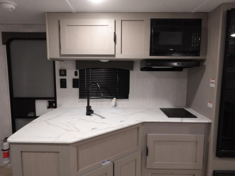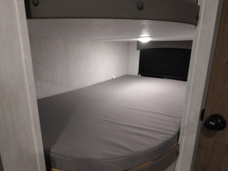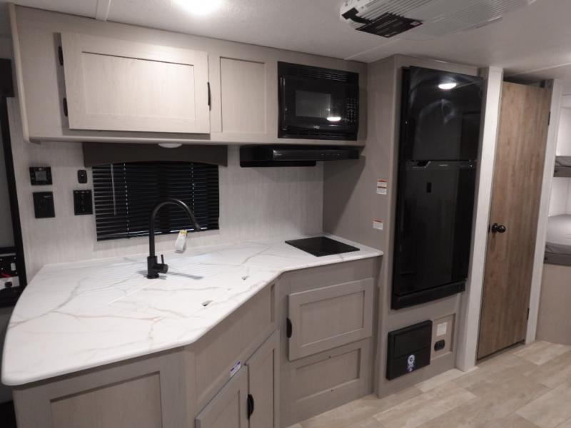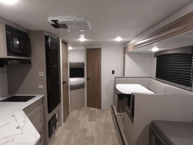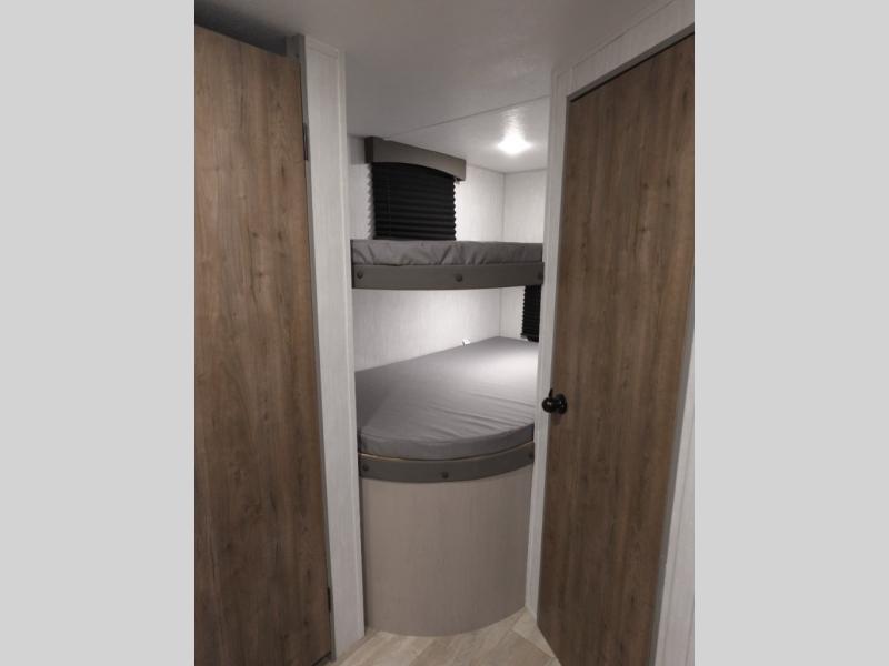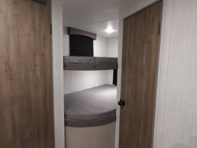 Pack your bags and head to the campground in this spacious travel trailer for eight! The owners will love having their own space in the front private bedroom, complete with an RV queen bed and dual wardrobes and shelves. There are double-size bunks in the rear corner, with the full bath in the other rear corner for easy nighttime use. Everyone can meet in the combined living area and kitchen while the cook makes breakfast. There is a sofa and booth dinette within the large slide out and an entertainment center.