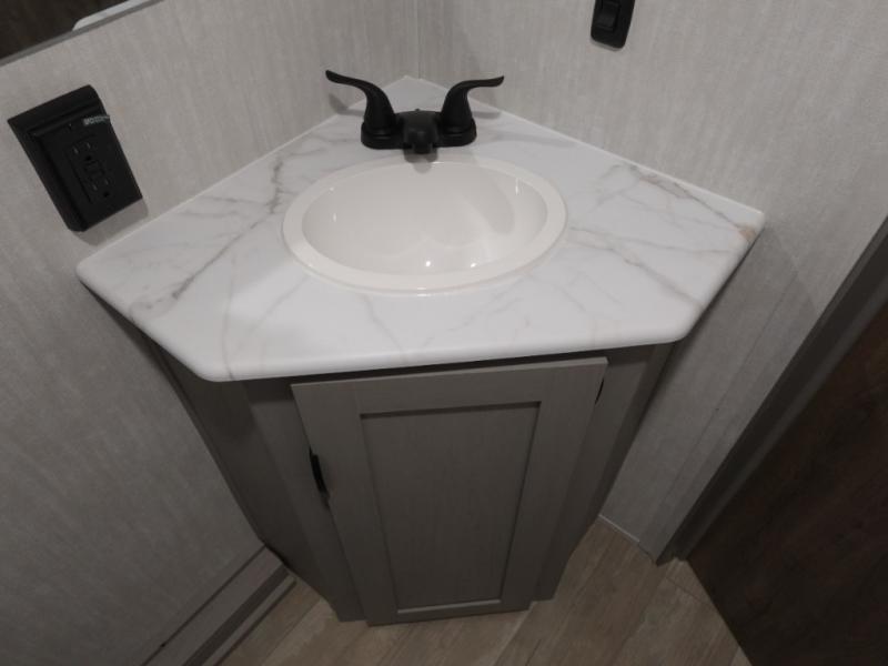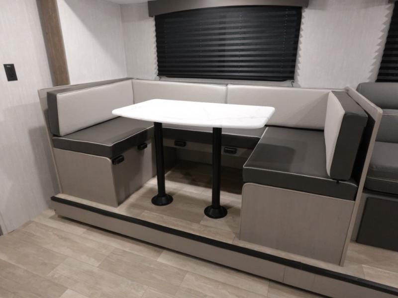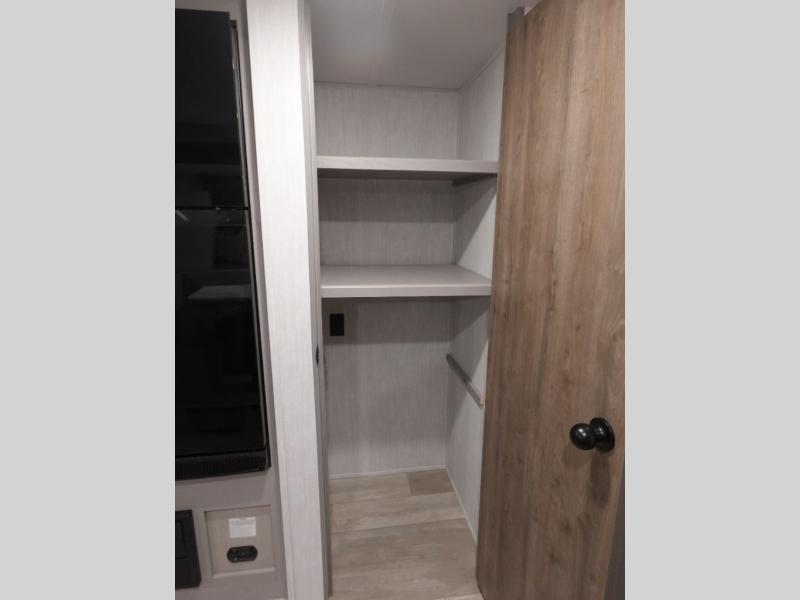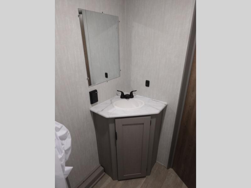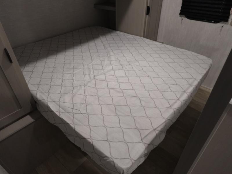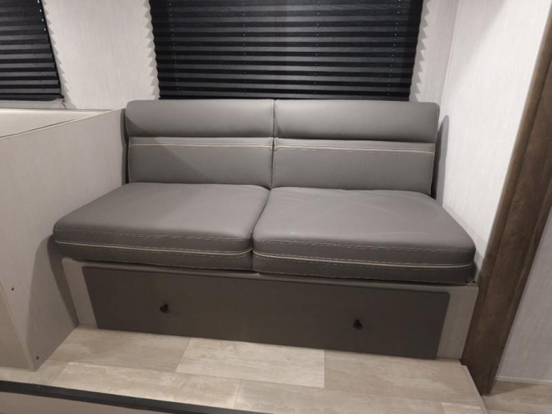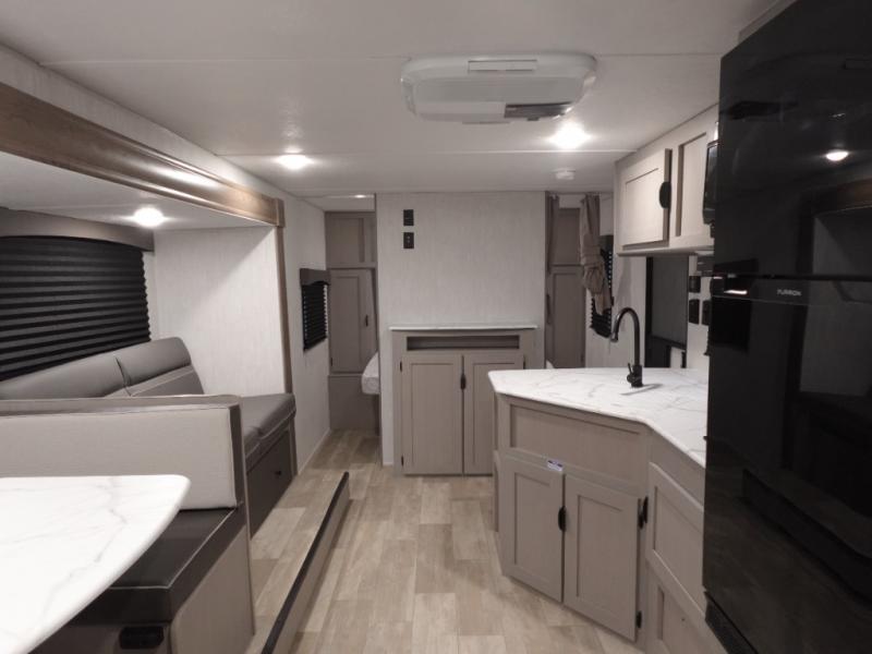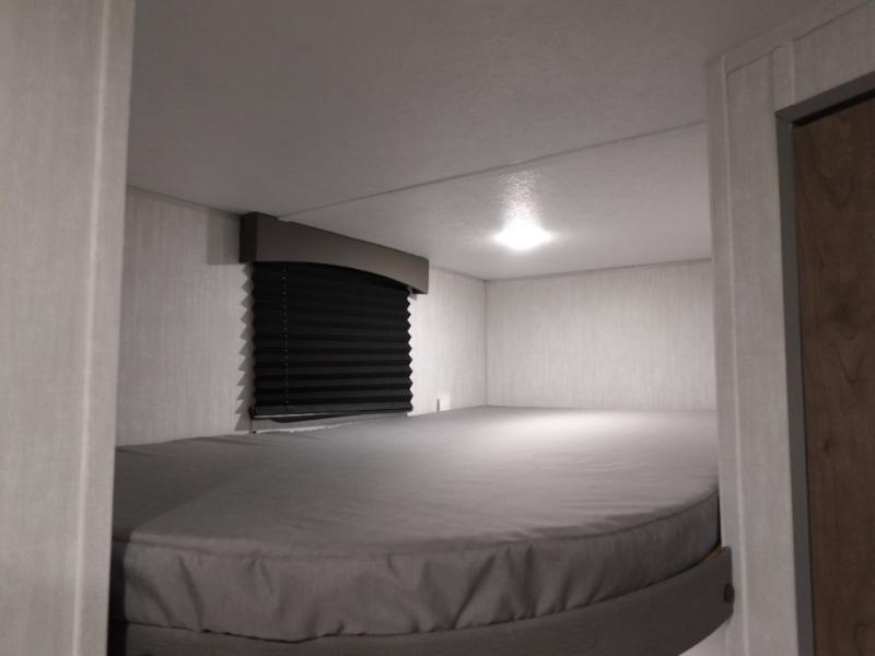 Pack your bags and head to the campground in this spacious travel trailer for eight! The owners will love having their own space in the front private bedroom, complete with an RV queen bed and dual wardrobes and shelves. There are double-size bunks in the rear corner, with the full bath in the other rear corner for easy nighttime use. Everyone can meet in the combined living area and kitchen while the cook makes breakfast. There is a sofa and booth dinette within the large slide out and an entertainment center.