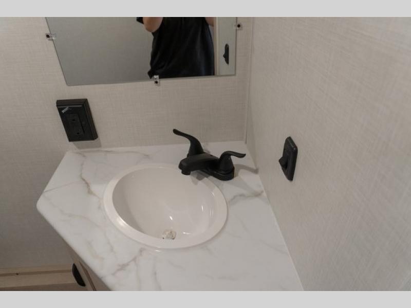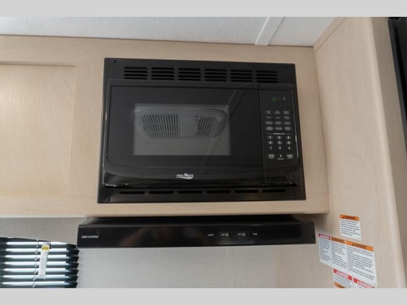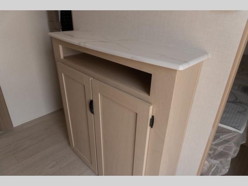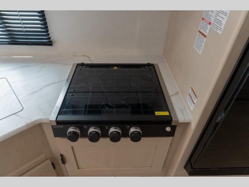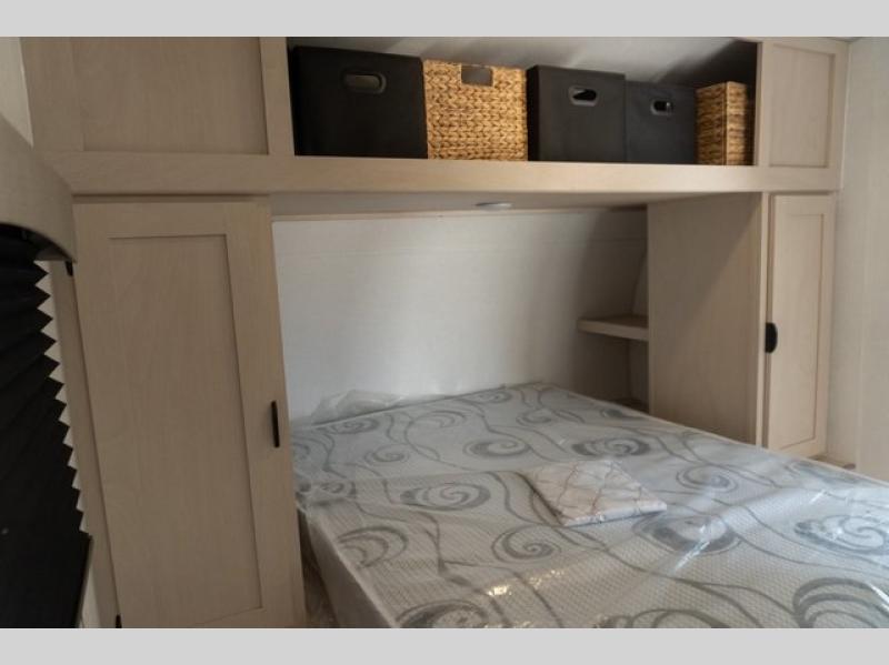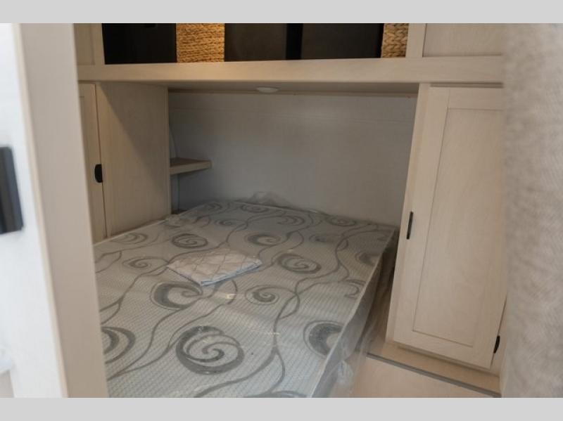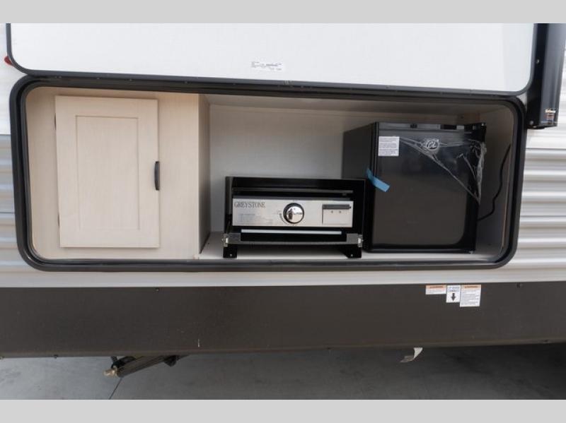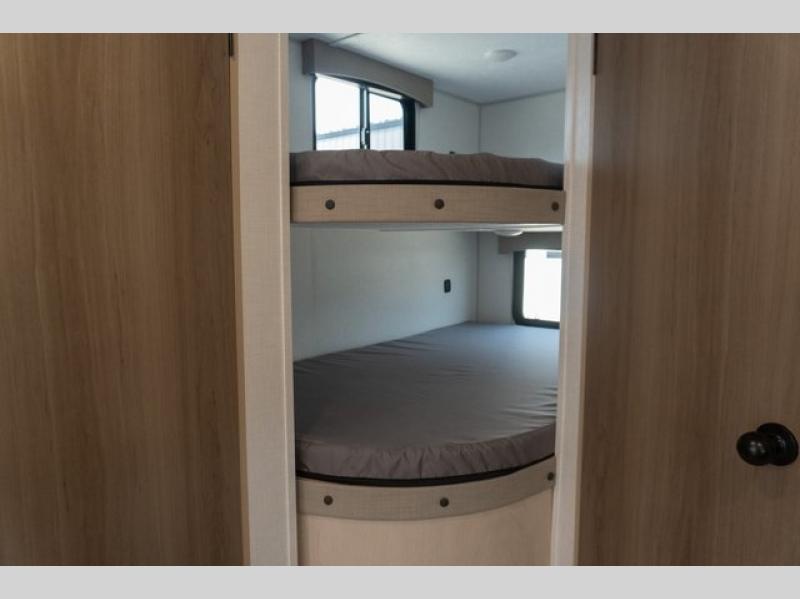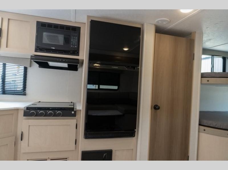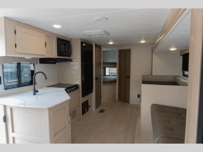 Pack your bags and head to the campground in this spacious travel trailer for eight! The owners will love having their own space in the front private bedroom, complete with an RV queen bed and dual wardrobes and shelves. There are double-size bunks in the rear corner, with the full bath in the other rear corner for easy nighttime use. Everyone can meet in the combined living area and kitchen while the cook makes breakfast. There is a sofa and booth dinette within the large slide out and an entertainment center with an optional fireplace if you want to make this space more cozy. This unit also includes a large pantry with washer and dryer prep, giving you the option to add these appliances, and an optional camp kitchen can be added for the cook who loves being outdoors!