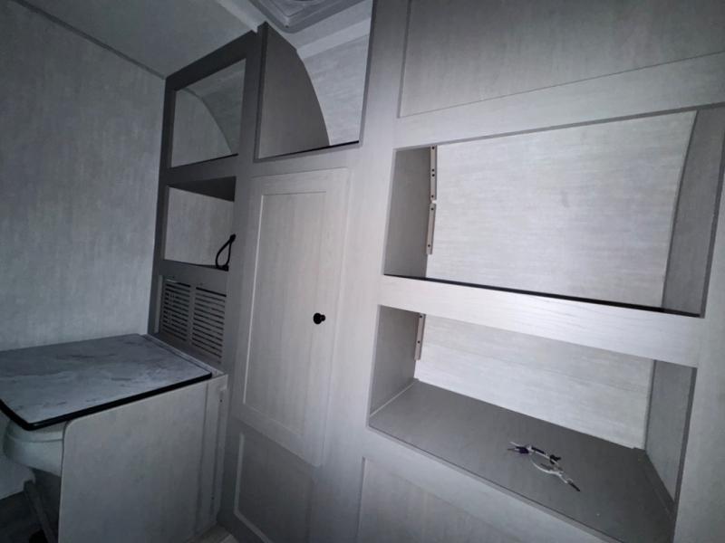 This teardrop trailer features a little more interior space since you can move between the two twin beds with storage, and there is a portable table where you can dine together. You'll find an overhead cabinet in the back for your belongings, along with a storage cabinet up front and a wardrobe. The cassette toilet will add even more convenience. The rear hatch kitchen includes a pull-out griddle and grill combo cooktop, a 3.3 cu. ft. 12V refrigerator, and a microwave oven. There is also a hot and cold faucet and multiple overhead storage cabinets for spices, utensils, and more!