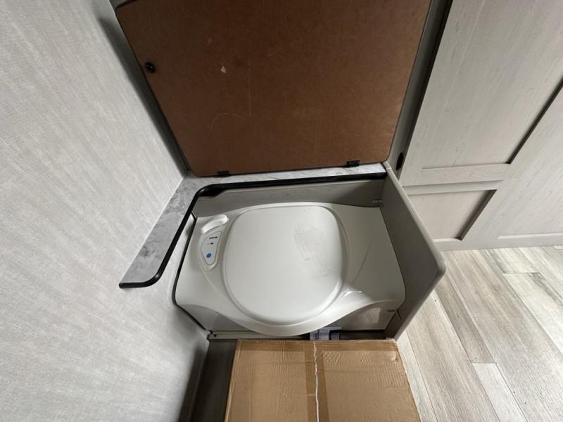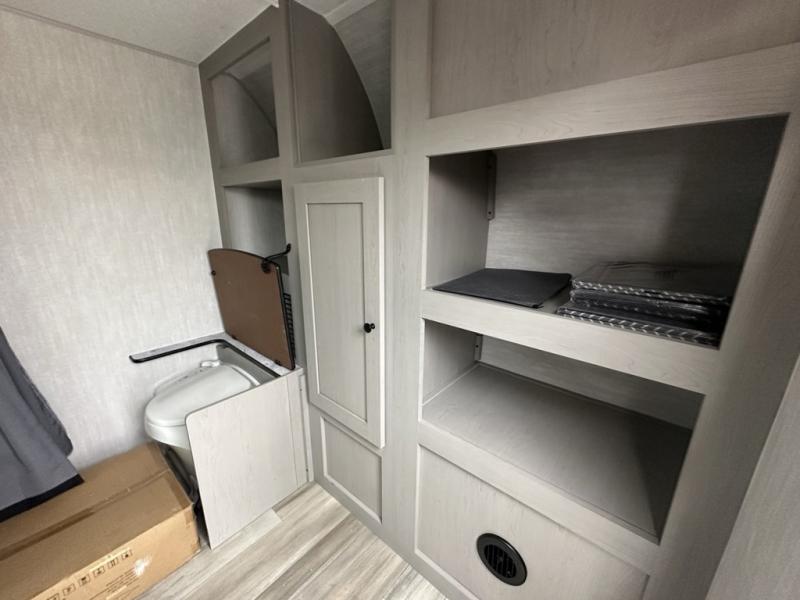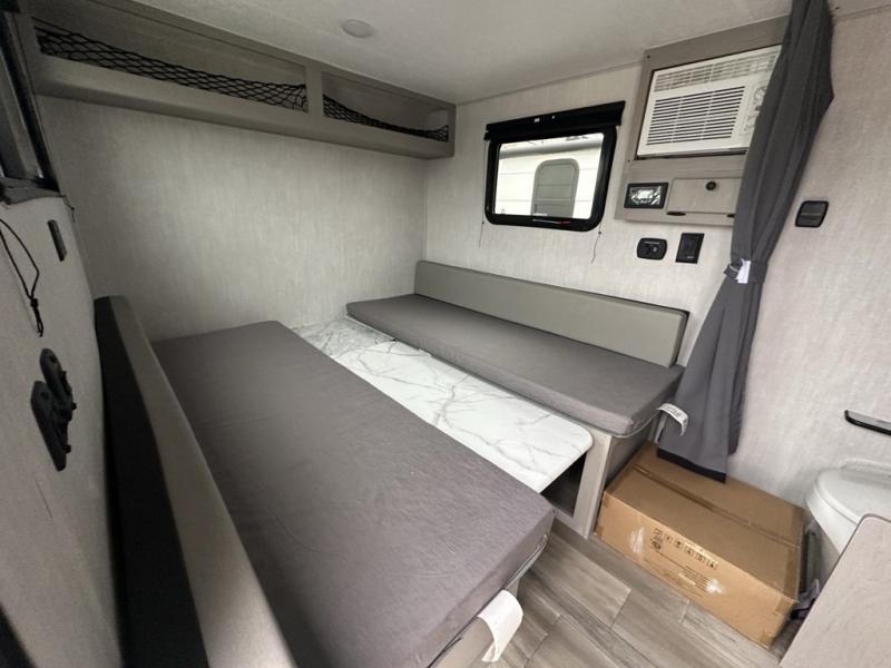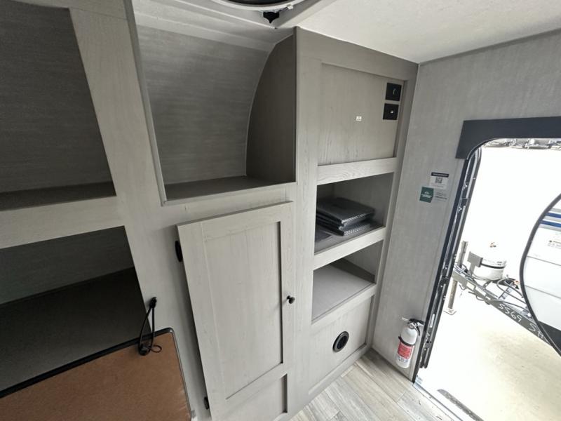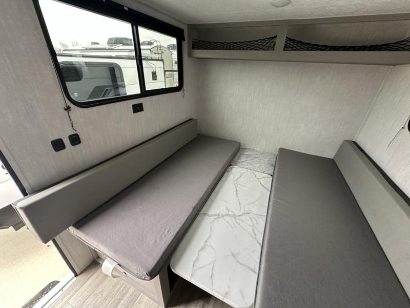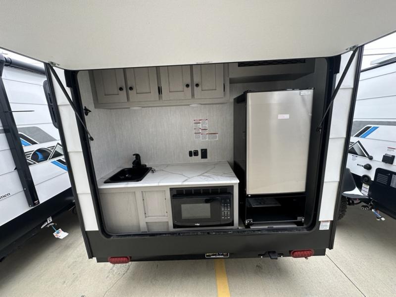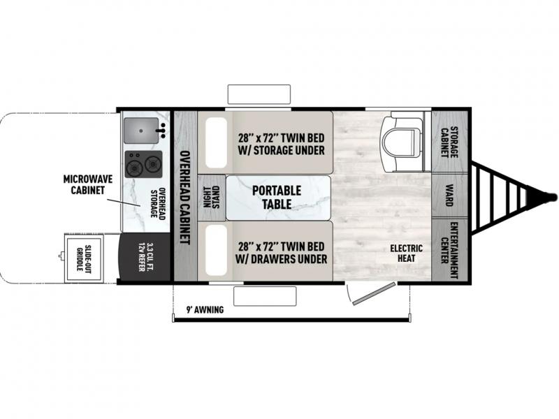 This travel trailer features a little more interior space since you can move between the two twin beds with storage, and there is a portable table where you can dine together. You'll find an overhead cabinet in the back for your belongings, along with a storage cabinet up front and a wardrobe. The cassette toilet will add even more convenience. The rear hatch kitchen includes a pull-out griddle and grill combo cooktop, a 3.3 cu. ft. 12V refrigerator, and a microwave oven. There is also a hot and cold faucet and multiple overhead storage cabinets for spices, utensils, and more!