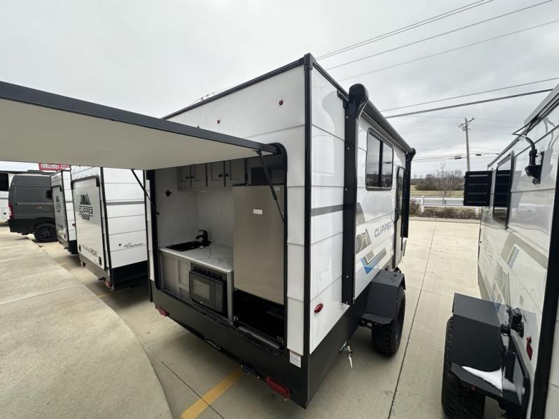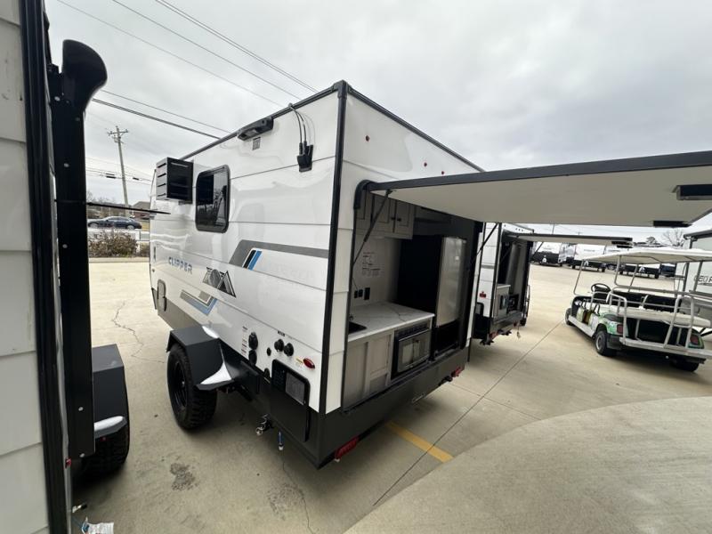These Clipper ROK travel trailers allow you to camp anywhere you want, even off the beaten path a bit. Each model features electric brakes, easy lube axles, and 15" off-road heavy duty tires. There are frame-mounted stabilizer jacks to help keep your unit secure, and the outside shower with hot/cold water will come in handy when rinsing off hiking gear. A 5K BTU A/C unit and 20K BTU propane furnace will keep you comfortable as you camp, and there are 12V outlets along with 110V outlets to keep your electronics charged. An optional roof top tent can be added if you're needing additional sleeping space, and if you choose the optional Solar Package with a 200W panel and 30A solar controller, you can enjoy off-grid capabilities!