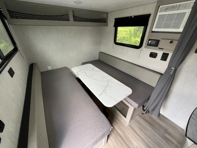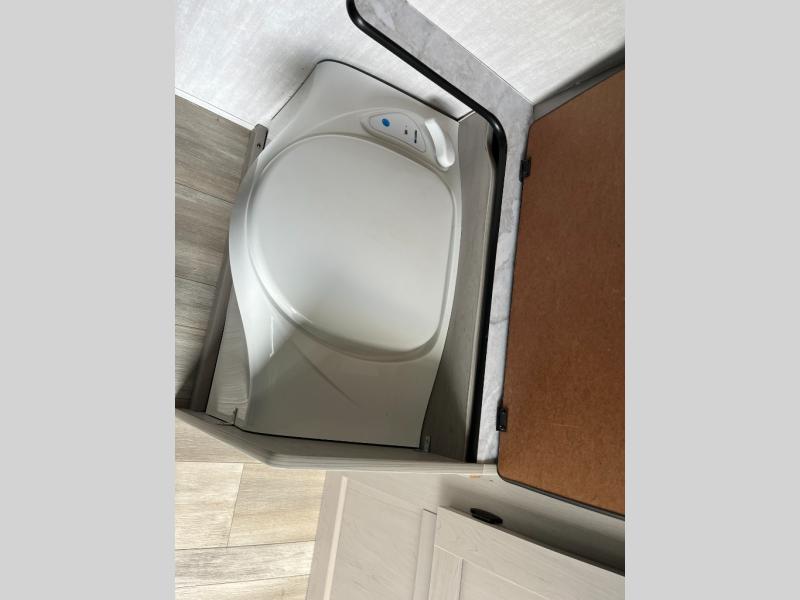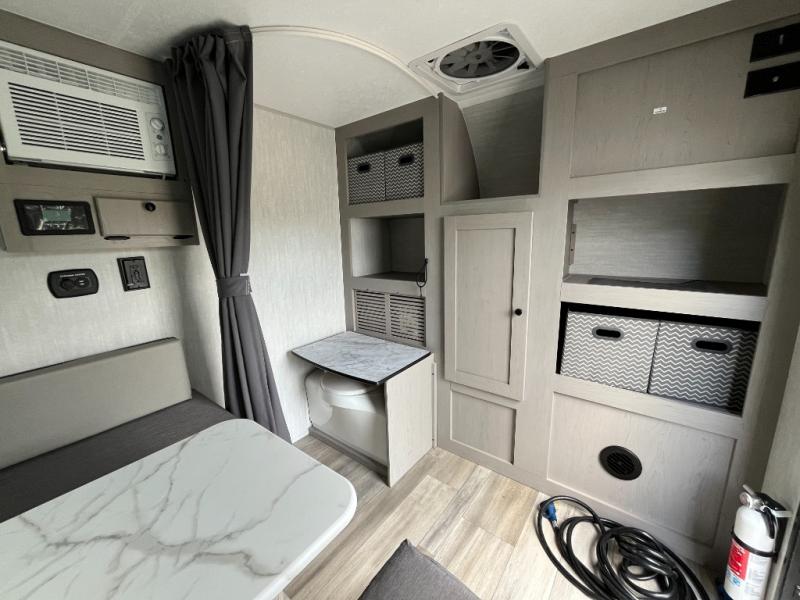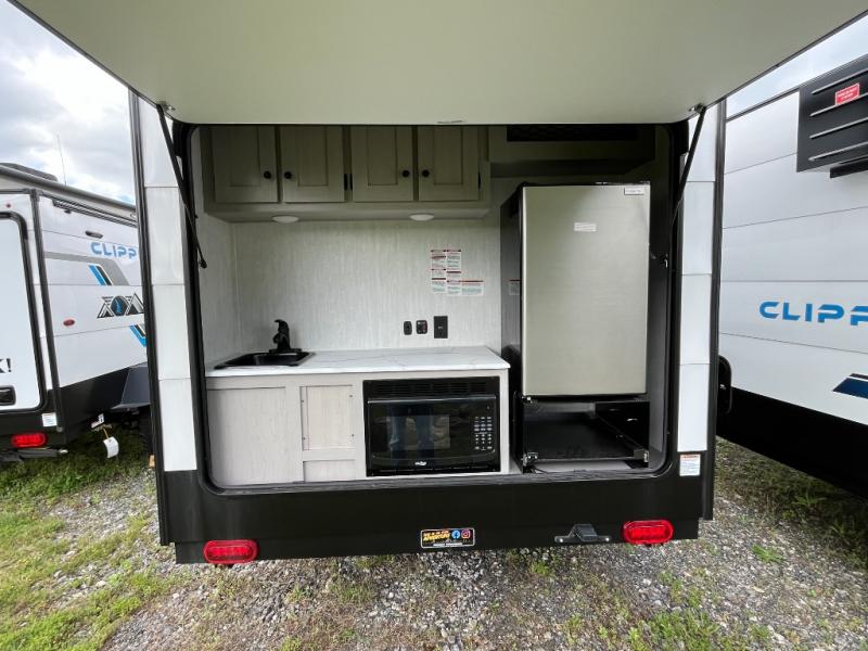 This travel trailer features a little more interior space since you can move between the two twin beds with storage, and there is a portable table where you can dine together. You'll find an overhead cabinet in the back for your belongings, along with a storage cabinet up front and a wardrobe. The cassette toilet will add even more convenience. The rear hatch kitchen includes a pull-out griddle and grill combo cooktop, a 3.3 cu. ft. 12V refrigerator, and a microwave oven. There is also a hot and cold faucet and multiple overhead storage cabinets for spices, utensils, and more!